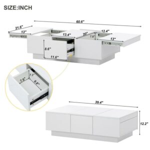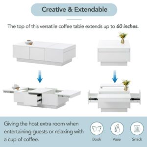 Momspeace Modern Coffee Table with Sliding Top and 2 Hidden Storage Compartments, High-gloss End Table with 2 Drawers for Living Room -White