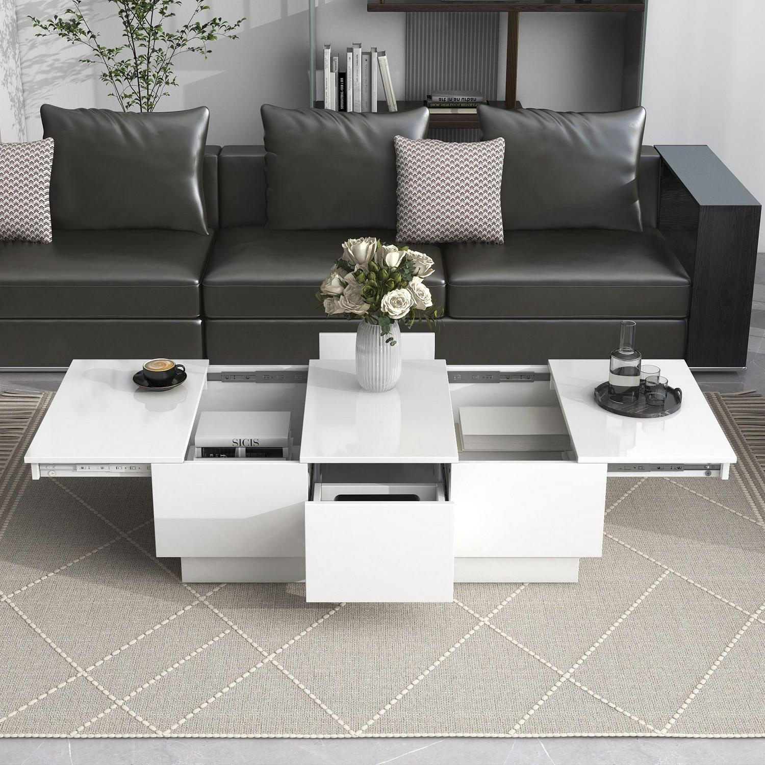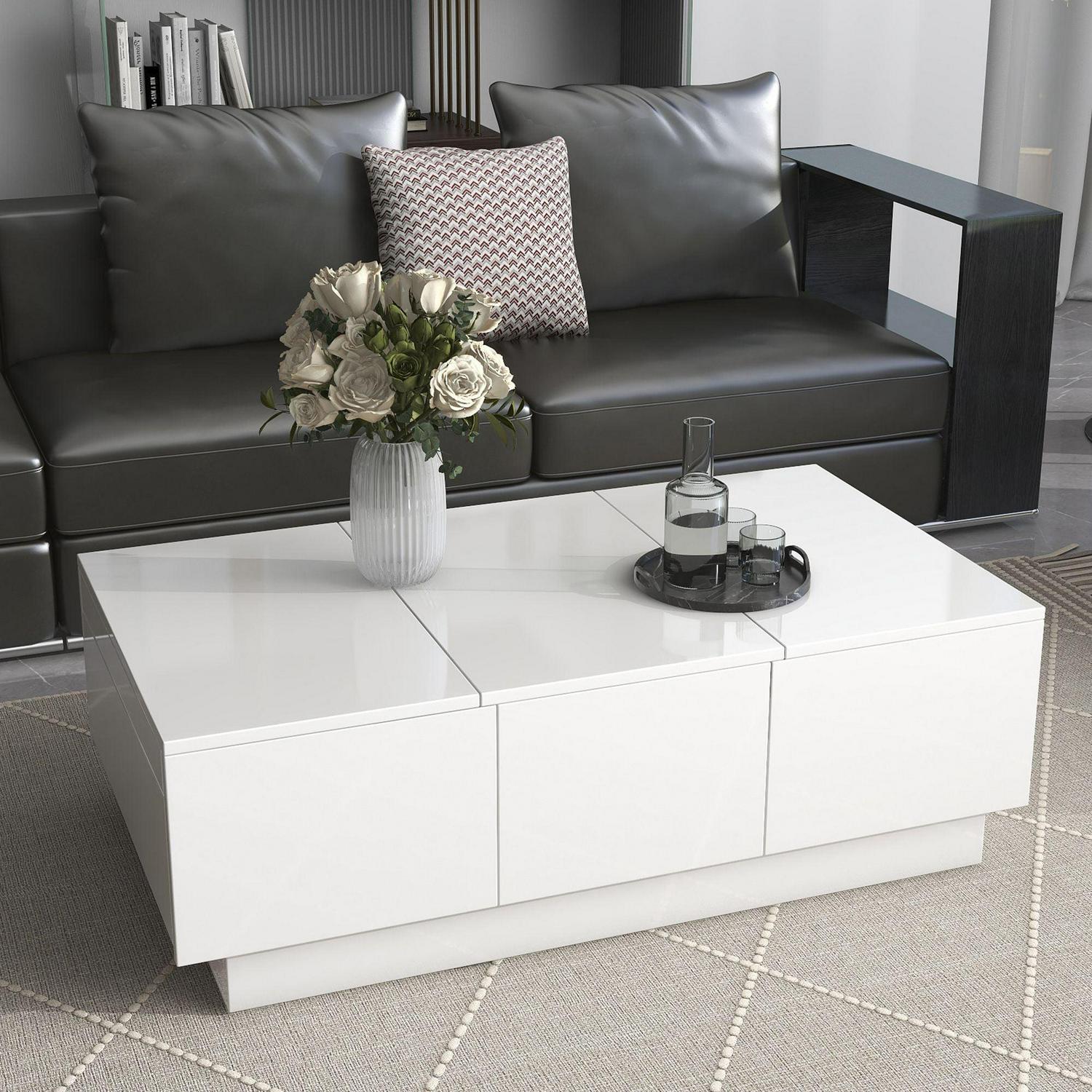 DURABLE CONSTRUCTION – The coffee table’s carefully crafted glides allow the tabletop to move smoothly and experience seamless functionality, while the high-gloss finish resists stains and fading. Made of top-grade particleboard and MDF, this coffee table is sturdy and durable.
