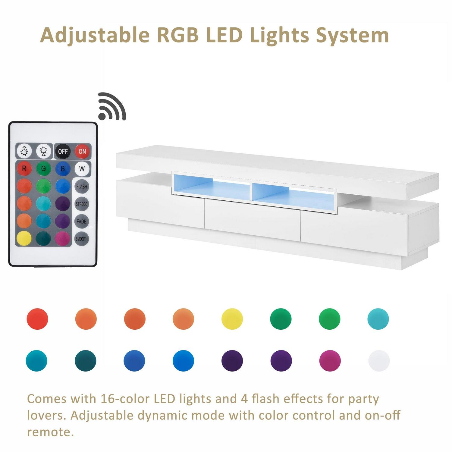 DYNAMIC LED LIGHTING – Elevating the viewing and entertainment experience, the TV stand incorporates a 16-color LED strip beneath the tabletop. This feature delivers a diverse range of lighting effects, with four modes including gradient, breathing light, fast blinking, and slow blinking. Equipped with a remote control, signal receiver, and electric pressure converter, these accessories of the TV stand enhance the visual allure and ambiance of your living space.
