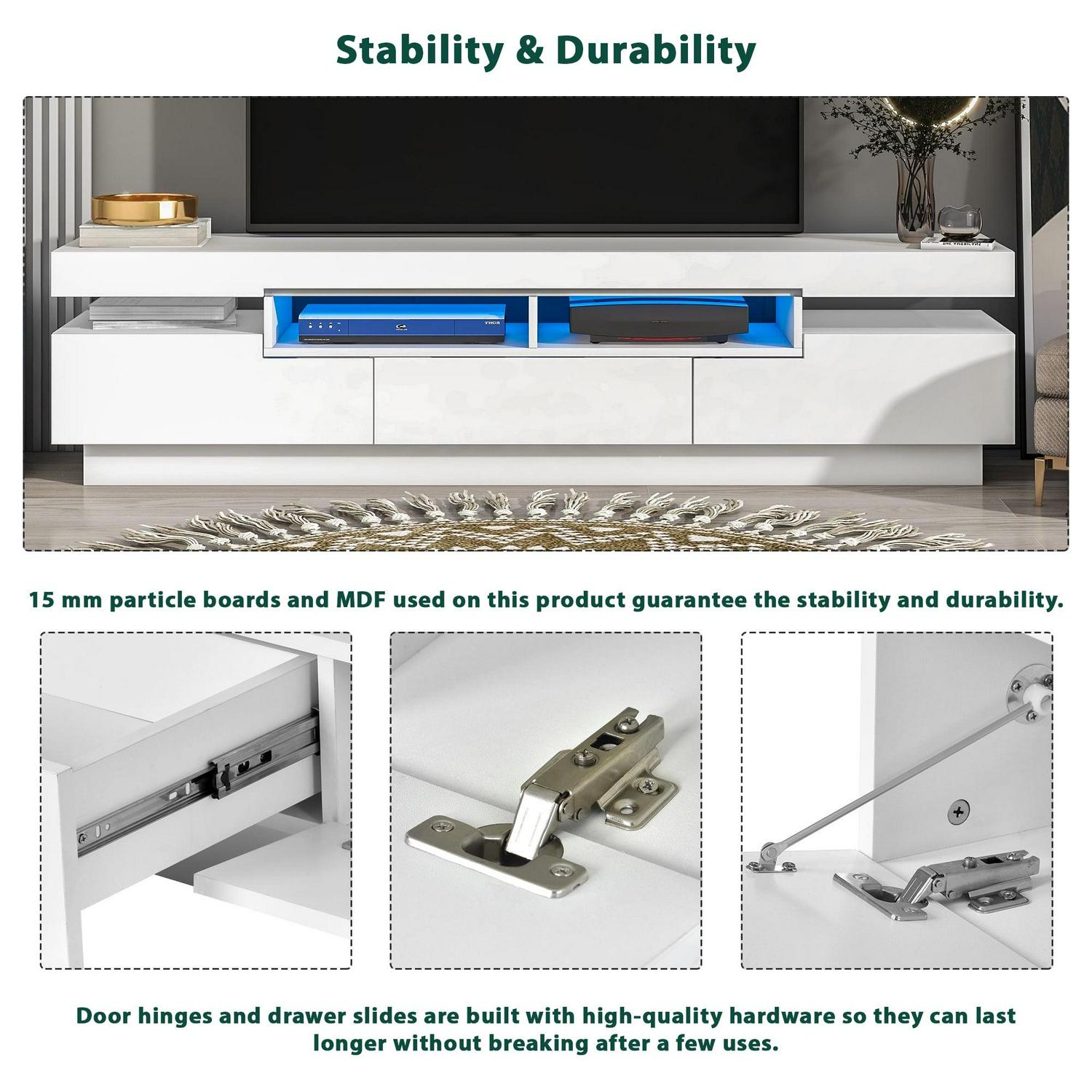 PREMIUM CRAFTSMANSHIP – Crafted from durable MDF and particle board, this TV stand ensures both reliable TV support and an aesthetic that aligns with your preferences. The door hinges and drawer slides are fashioned with high-quality hardware, promising long-lasting performance and resistance to wear and tear.