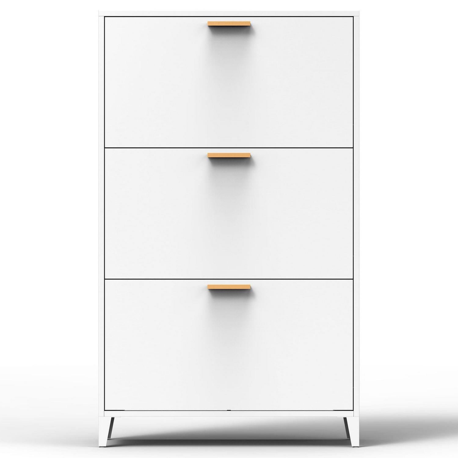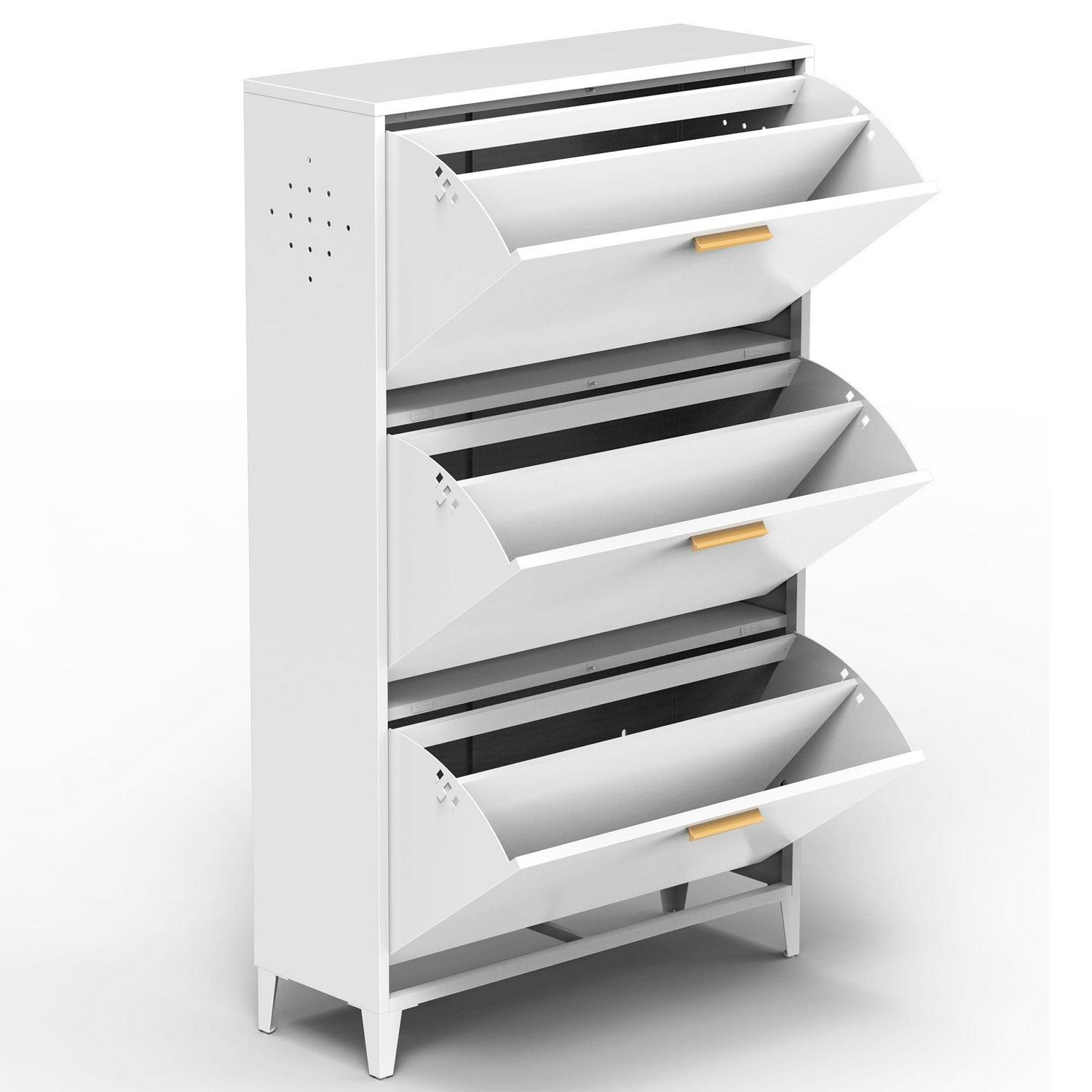 Momspeace Modern Shoe Cabinet with Flip Doors and Drawers, Freestanding Steel Shoe Rack for Entryway – White