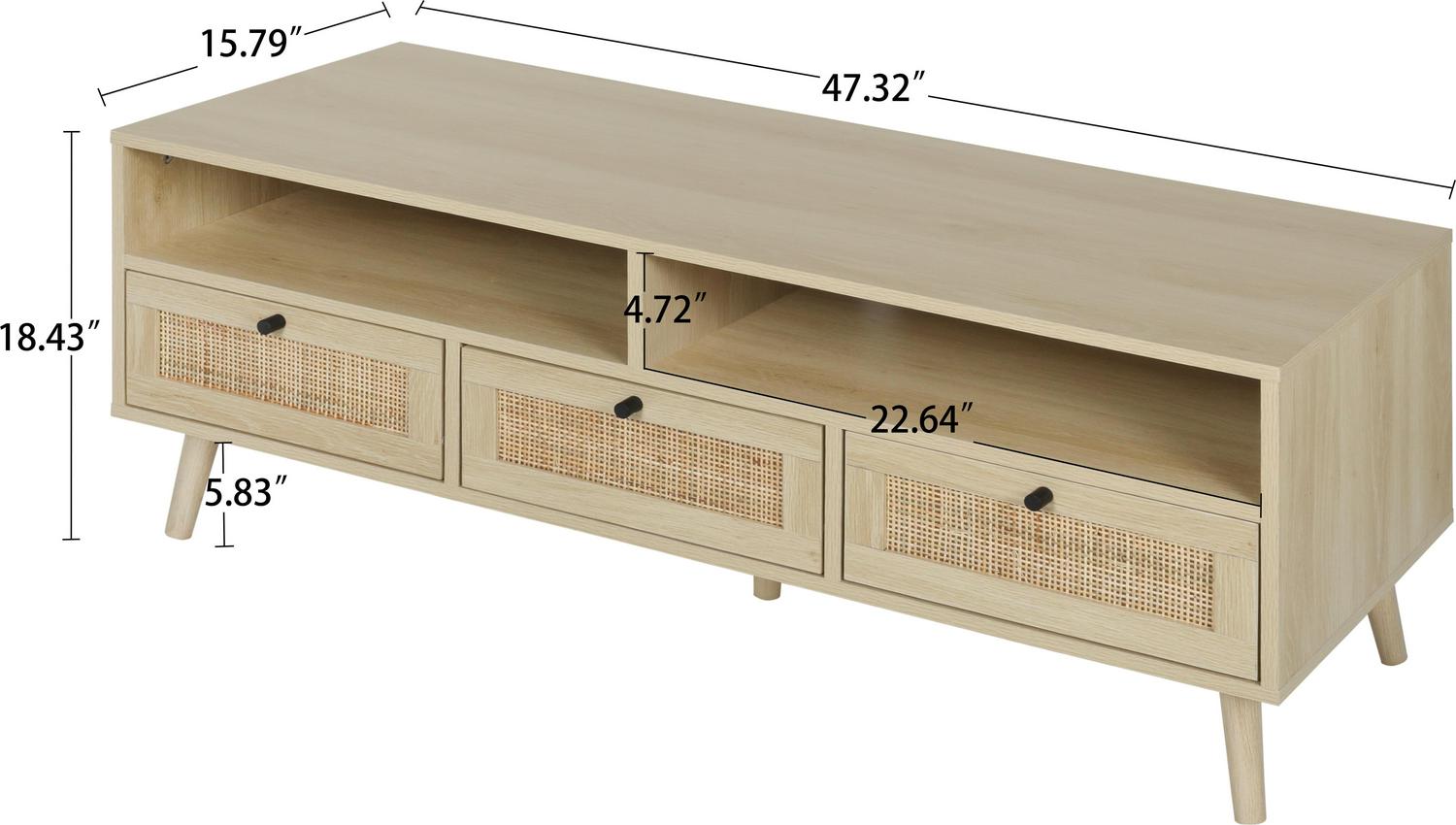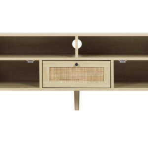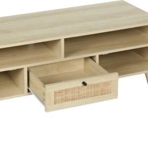 The Momspeace MSP-LVL2-001 TV Stand with Compartments and Rattan Doors, TV Console Table for Living Room, featuring handmade rattan decorative doors and its spacious storage space, providing durability and practicality that enhances decor in your home and satisfies your storage requirements. The ancient beauty of this TV stand is accentuated by decorative rattan inserts in the doors and drawer. This TV stand also features open compartments to storage or display your DVDs, some audio equipment, your favorite movie memorabilia. The vintage style of this TV stand makes it the perfect living room companion for a record player and your collection of vinyl records, as well. This TV stand has a smooth spacious top surface providing plenty of room for up to 47 TV. This sophisticated TV stand with a oak finish blending perfectly into any decor style.