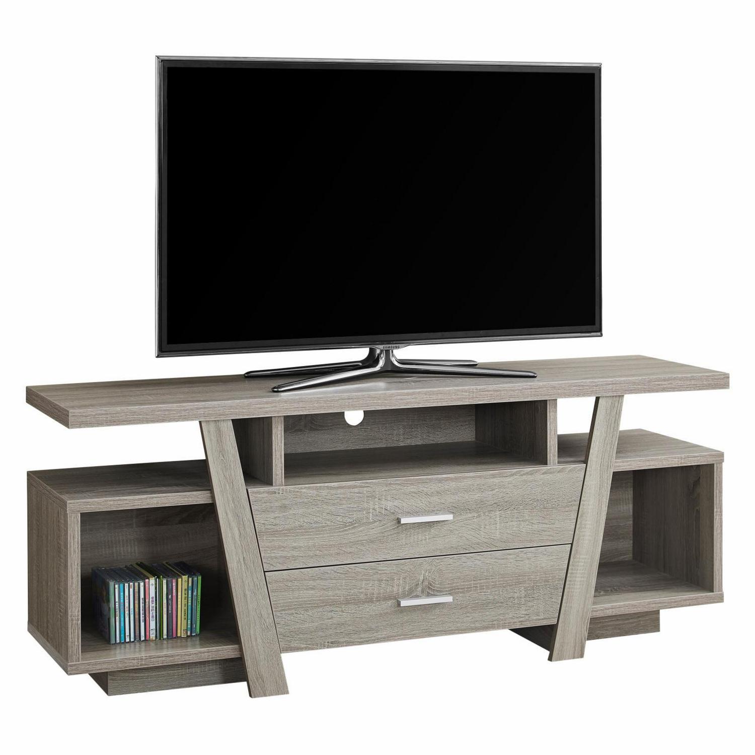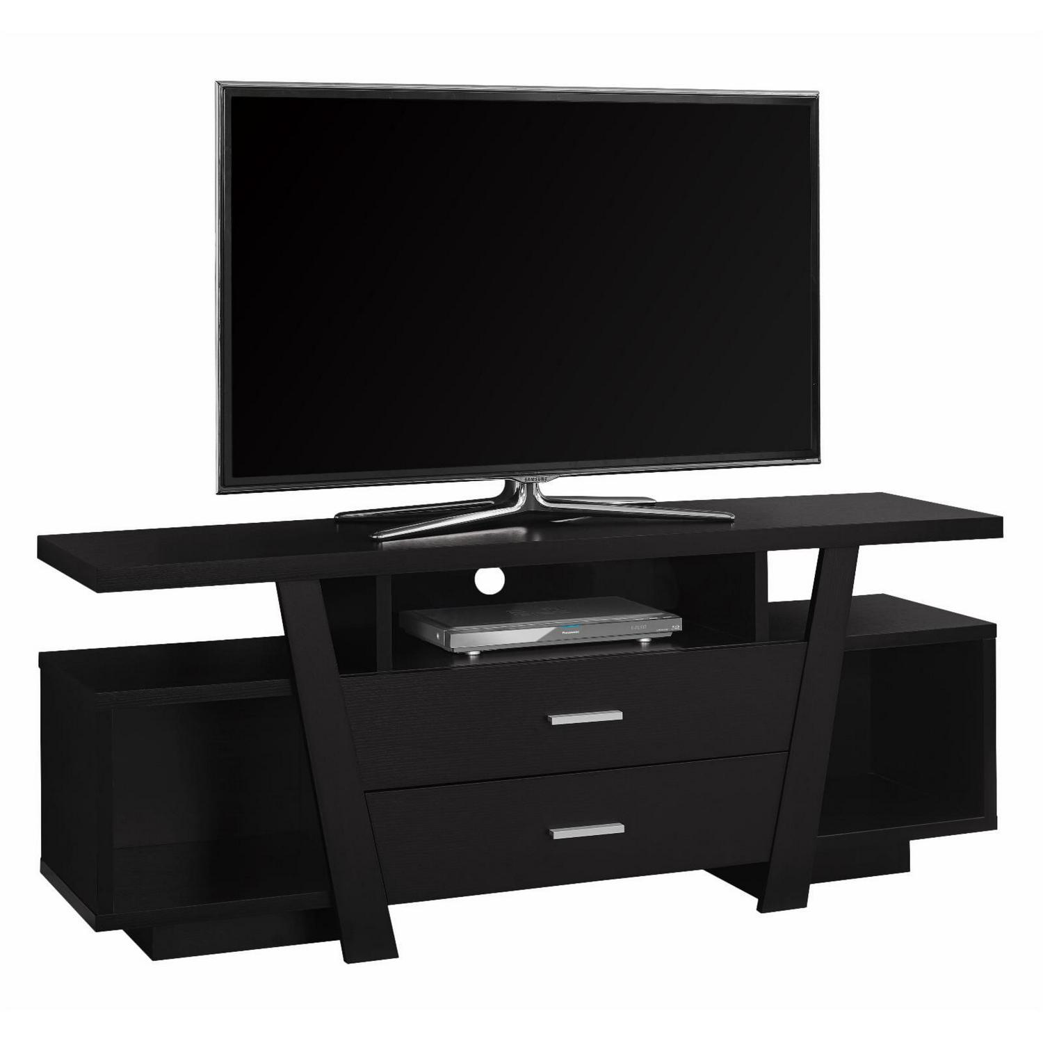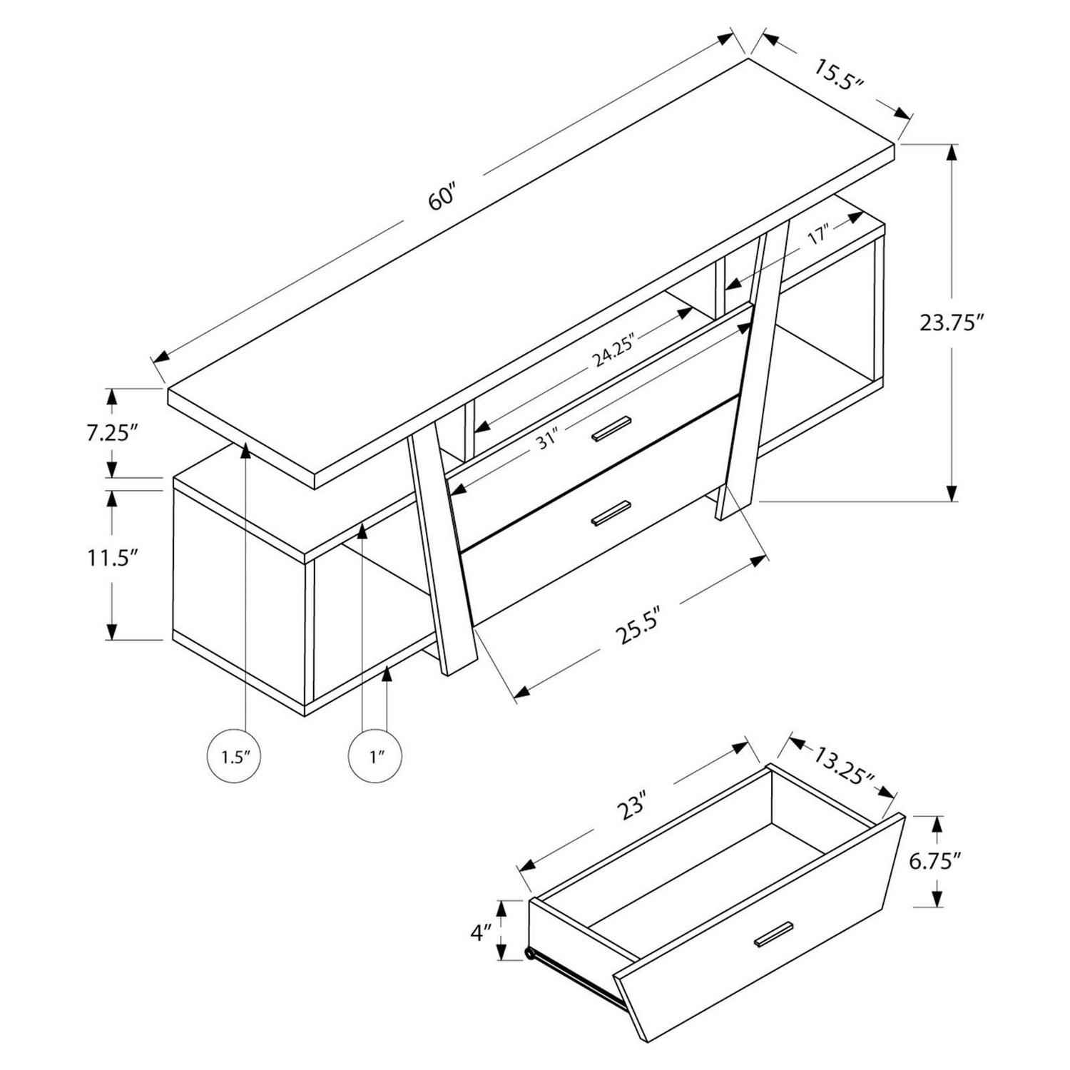 The Monarch Specialties 60 in. TV Stand with Storage Drawers is a bold statement piece to add to your home. Sharp lines make this storage system visually appealing and its five shelves and two drawers translate into functional design. Use the shelves to showcase your favorite mementos or photos from travels and turn your living room into a gallery.