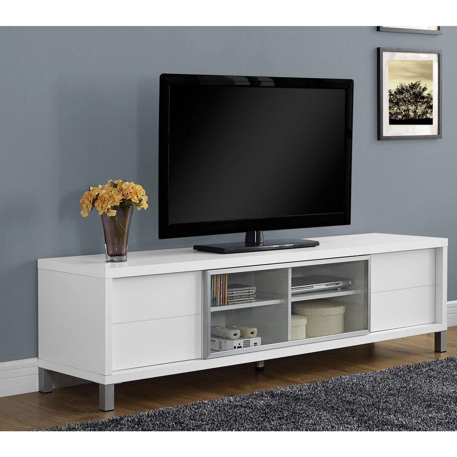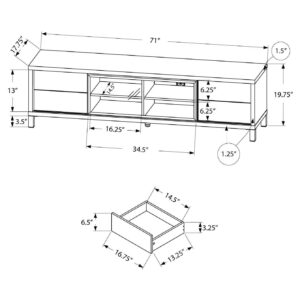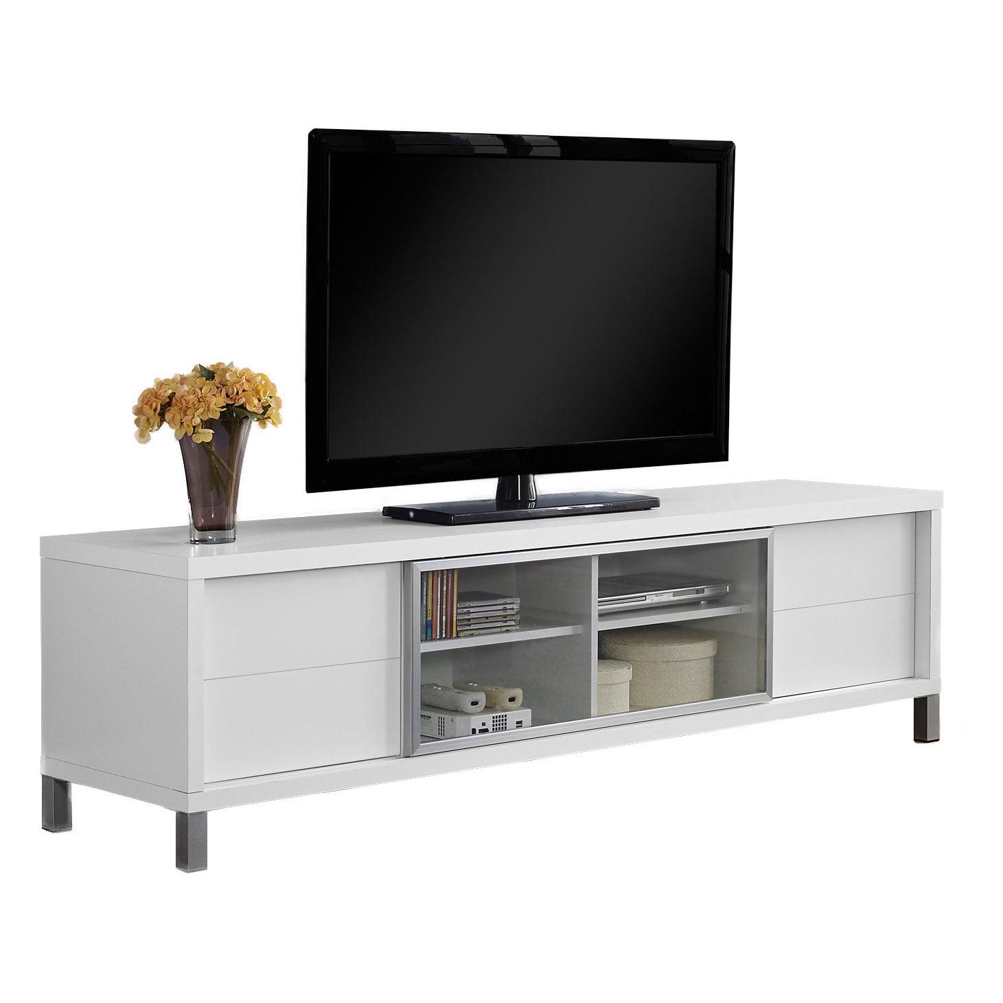 Give your TV the best seat in the house with a TV stand that gives your space the perfect blend of form and function with the Monarch Specialties 70-Inch European Style Television Stand Media Center. Create a European look to your living space with this contemporary bright white TV console. The thick paneled frame paired with a tempered glass center sliding door is supported by stylish sleek silver legs and 2 pre-drilled capped wire management holes in the back panels. Featuring 4 storage drawers and 2 adjustable center shelves, this TV stand will meet all your media storage needs in style With thick and study wood panel construction and sleek white finish, this entertainment center goes with a variety of contemporary, modern, and art deco stylings. Constructed of heavy-duty materials, this entertainment center is built durable to last you through many years. Complete your living room space and give your TV that final touch with the Monarch Specialties 70 Inch European Style Television Stand Media Center.