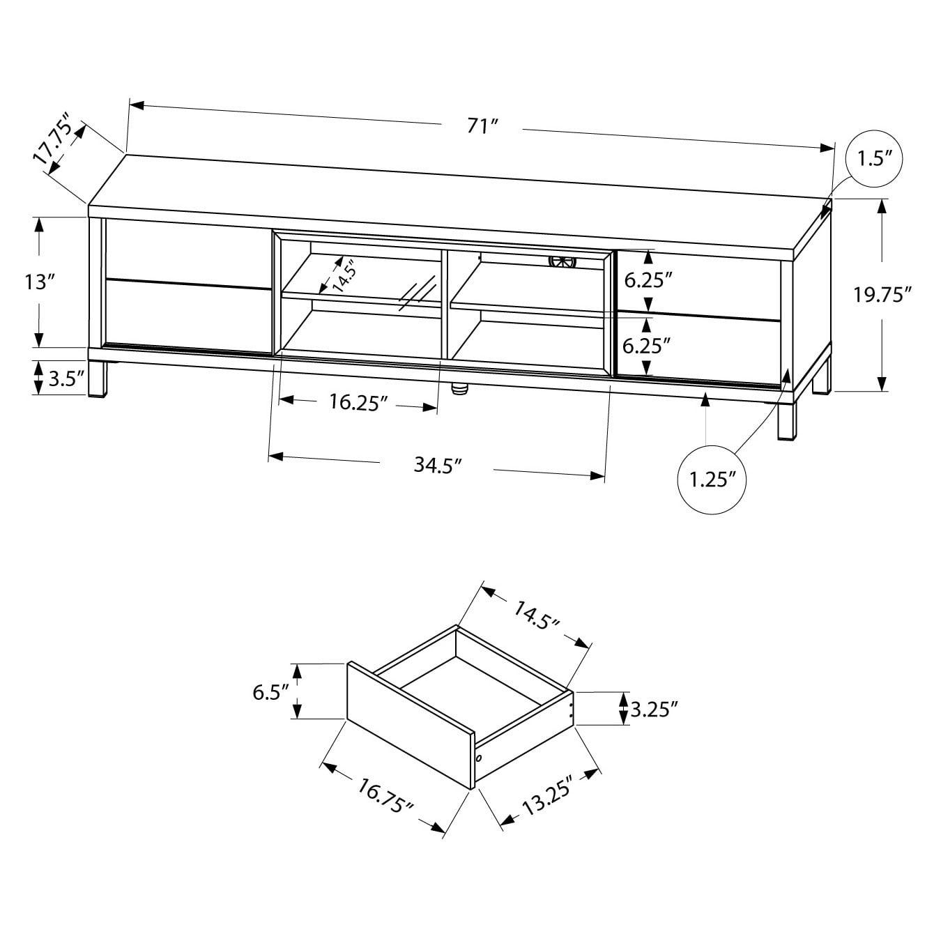 - Accommodates most TV models and all center stand TV models with 71 x 17.75 inches of top space