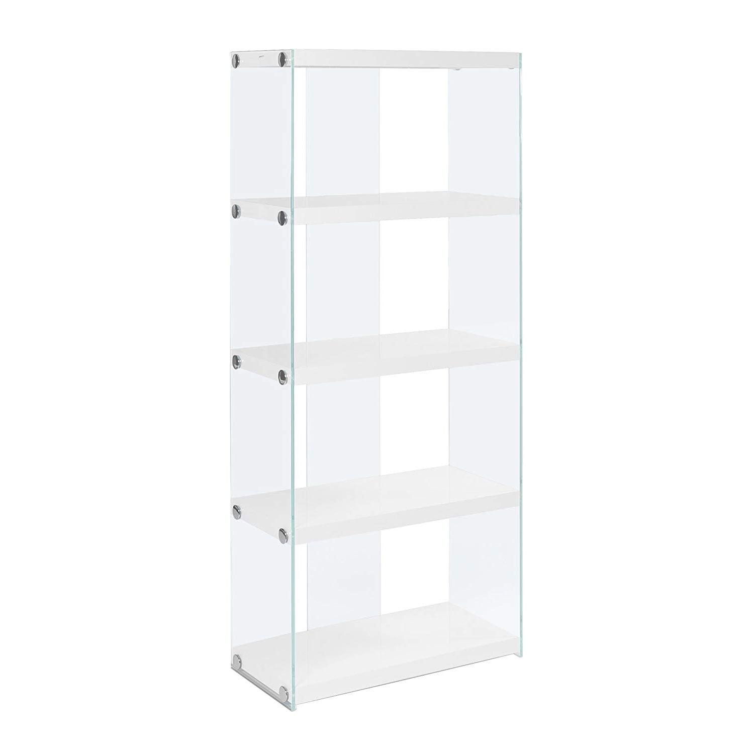 Your home storage and furniture game will take a complete 360-degree flip with this glossy white, tempered glass bookcase. You’ll now have a place to store your favorite books, children toys, home decor, and more with the Monarch Specialties Contemporary 4-Shelf Tempered Glass Bookcase. Add a modern touch to your home with this glossy white bookcase featuring tempered glass sides, thick paneled construction, and polished chrome accents. Four open shelves provide a fashionable way to display your most treasured possessions. Its contemporary finish will complement any room in the house, whether that’s the living room, home office, or bedroom. This shelf’s lightweight design makes moving easy, while also holding up to 22 pounds per shelf. This piece will not only make a lovely addition to your home but will also help you stay clutter-free for years to come. Don’t let storage become a headache with the Monarch Specialties Contemporary 4 Shelf Tempered Glass Bookcase.