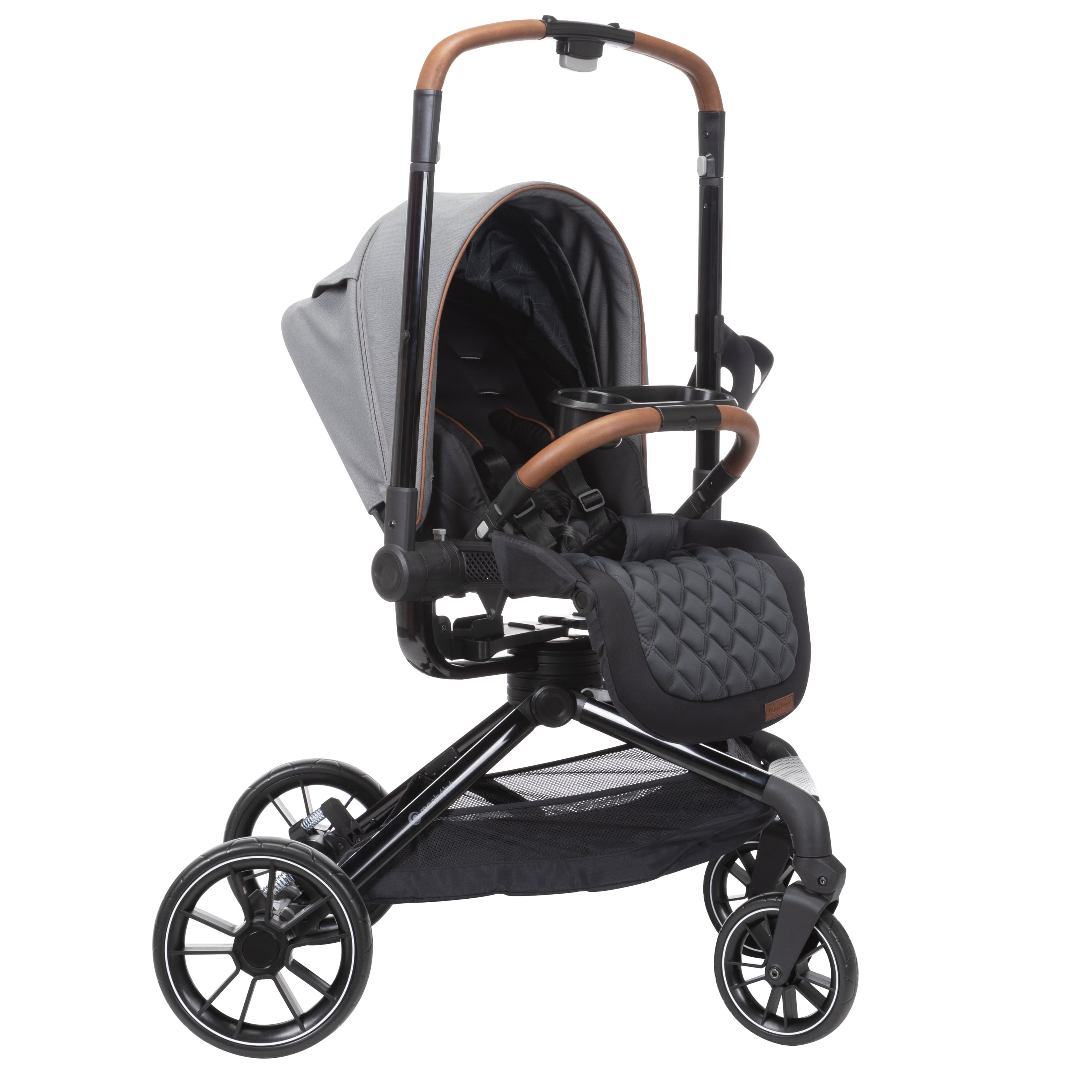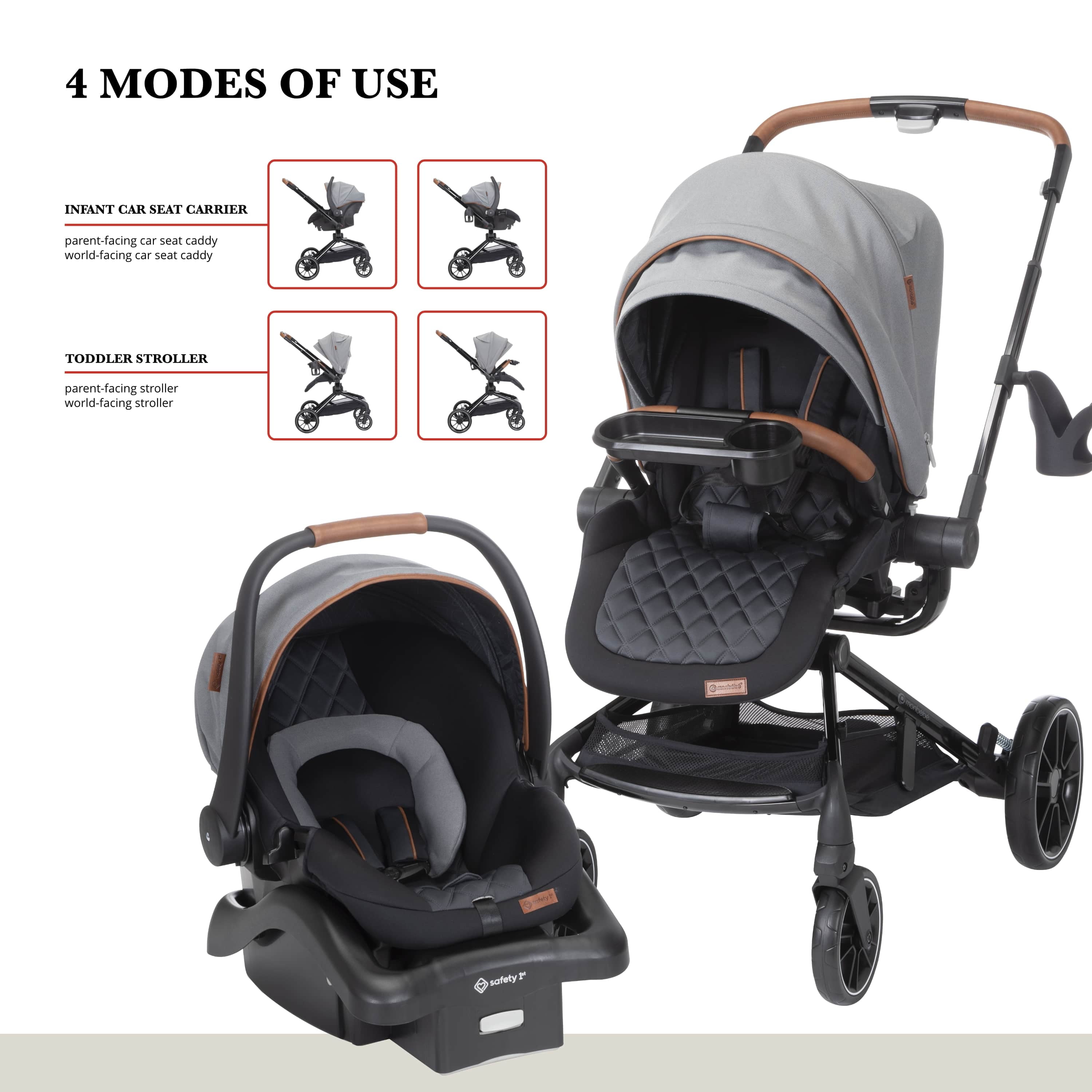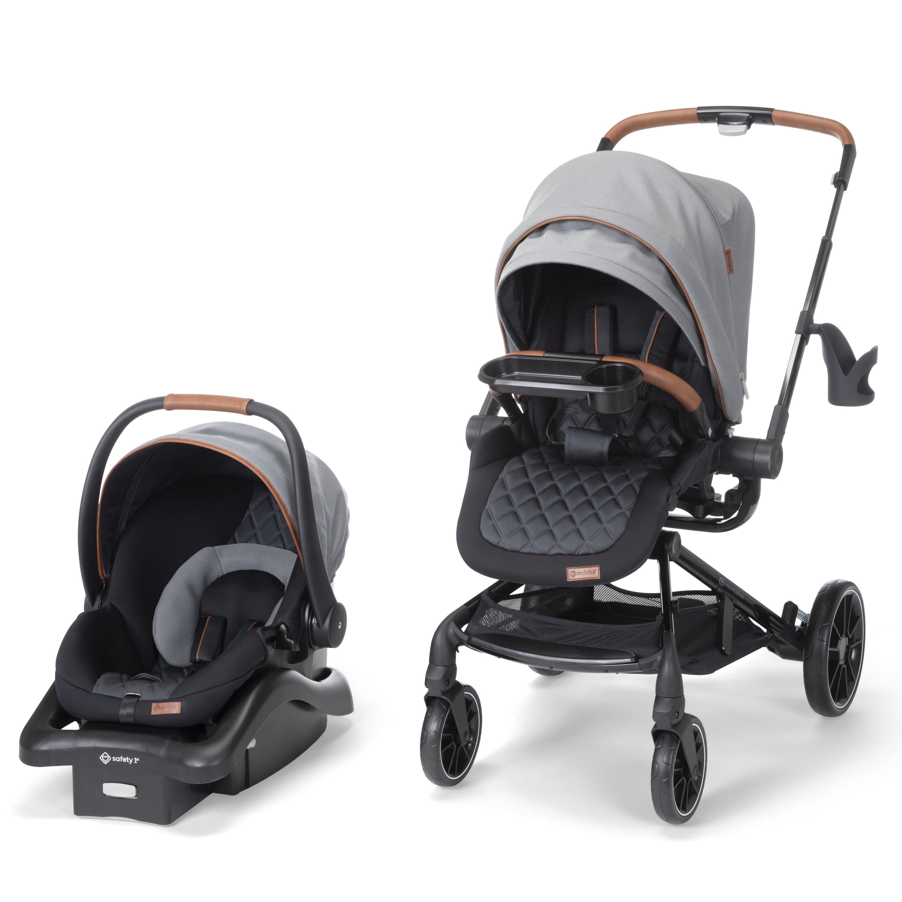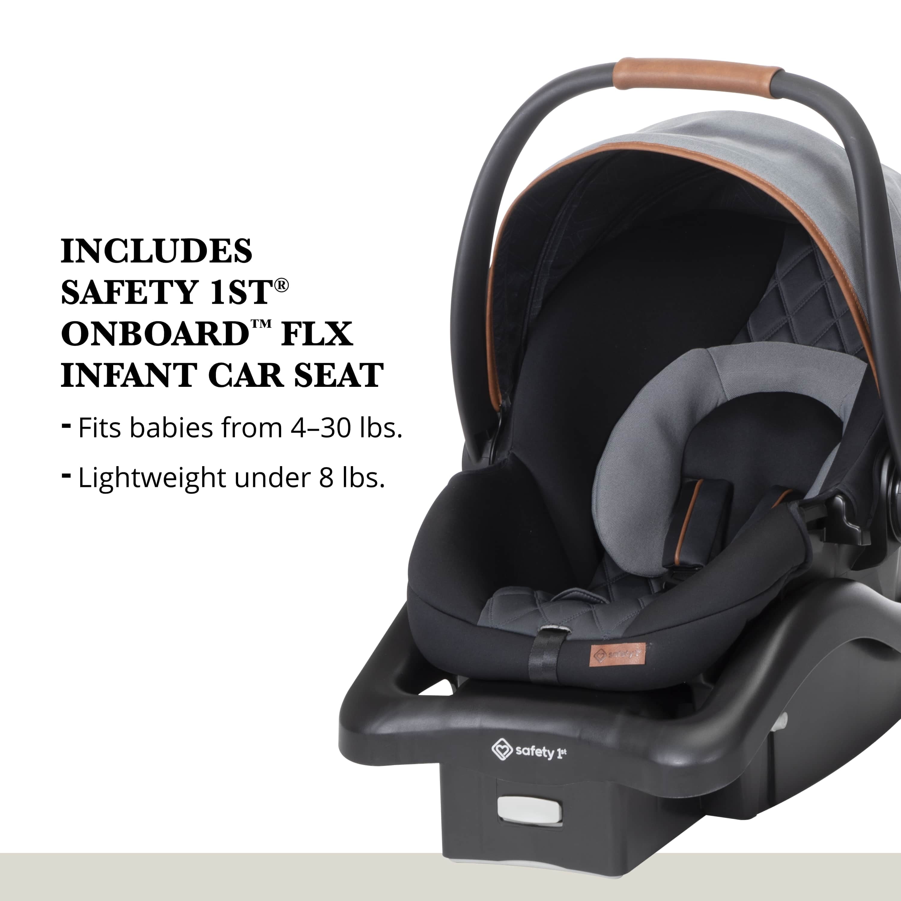 360° rotation lets you spin your little one in their stroller seat or infant seat gently and easily, changing their view in seconds Transition smoothly between 4 modes: parent-facing car seat caddy, world-facing car seat caddy, parent-facing stroller, and world-facing stroller Quilted, memory-foam stroller seat is ultra-comfy Large zipper-extend stroller canopy with an extended visor for UV sun protection and privacy, plus a peek-a-boo window Includes the Safety 1st onBoard FLX Infant Car Seat (fits babies from 4–30 lbs.) Car seat is lightweight and easy to carry at under 8 lbs. Large stroller storage basket with stretchy elastic for all your essentials Compact fold for easy stroller storage Convenient fold-away infant car seat adapters, so they’re always there when you need them Stroller has 3-position recline with an adjustable leg rest for comfort Height adjustable handlebar for a comfortable push Removable stroller swing-away bumper bar detaches from either side for easy in and out Parent cup holder that swivels to avoid tipping your drink when you move the handlebar to rotate your little one’s seat Cup holder accommodates up to a 20 oz. tumbler Flip-flop-friendly brake All-wheel suspension for a smooth ride over various terrains Stroller and car seat have a 5-point harness Faux-leather trim on stroller and car seat for style and a comfortable grip Side Impact Protection (SIP) in car seat Car seat has a memory-foam quilted pad for comfort Machine-washable car seat pad Stroller seat detaches easily to install the car seat Stroller accommodates children up to 50 lbs. Meets or exceeds all federal safety standards Stroller meets Disney Park standards