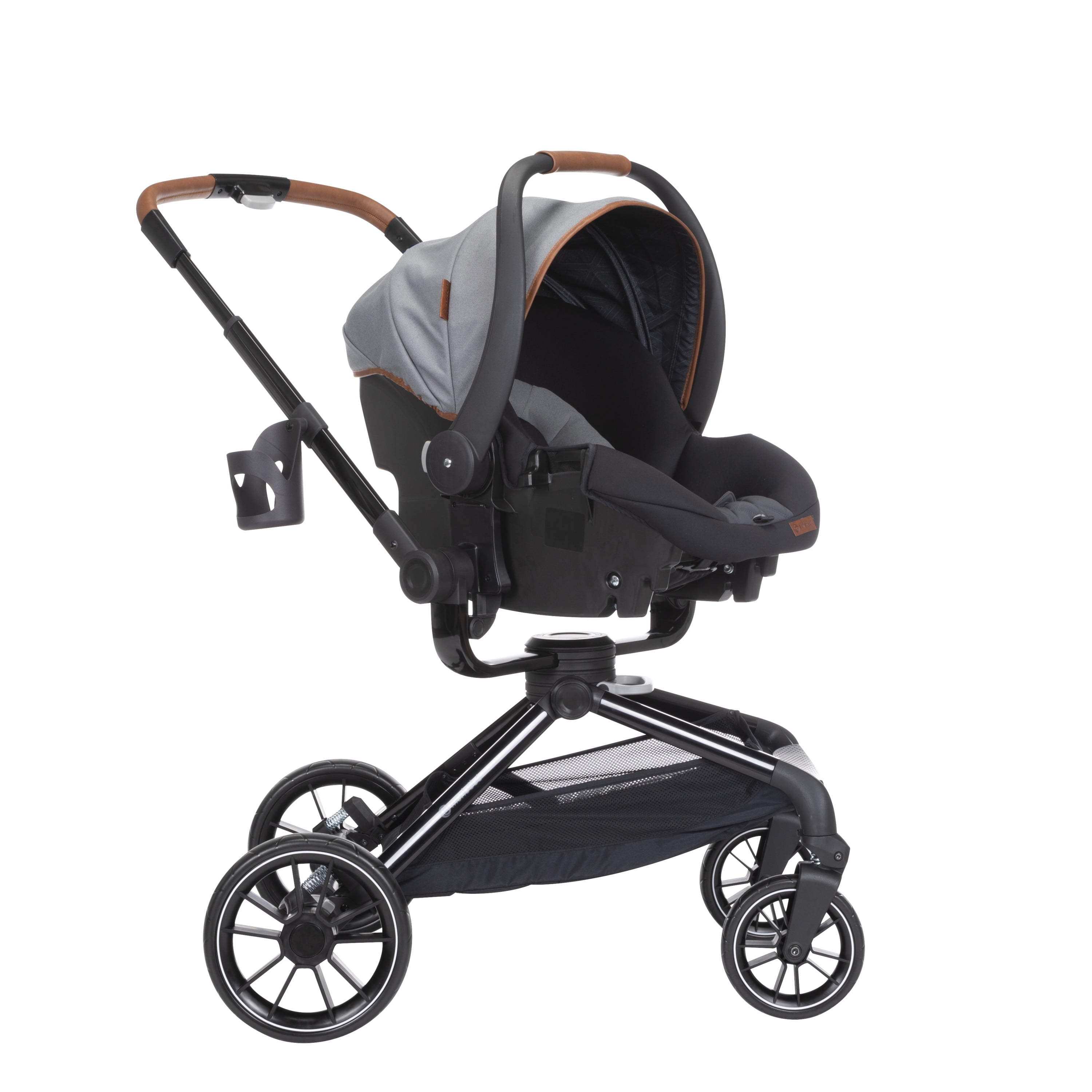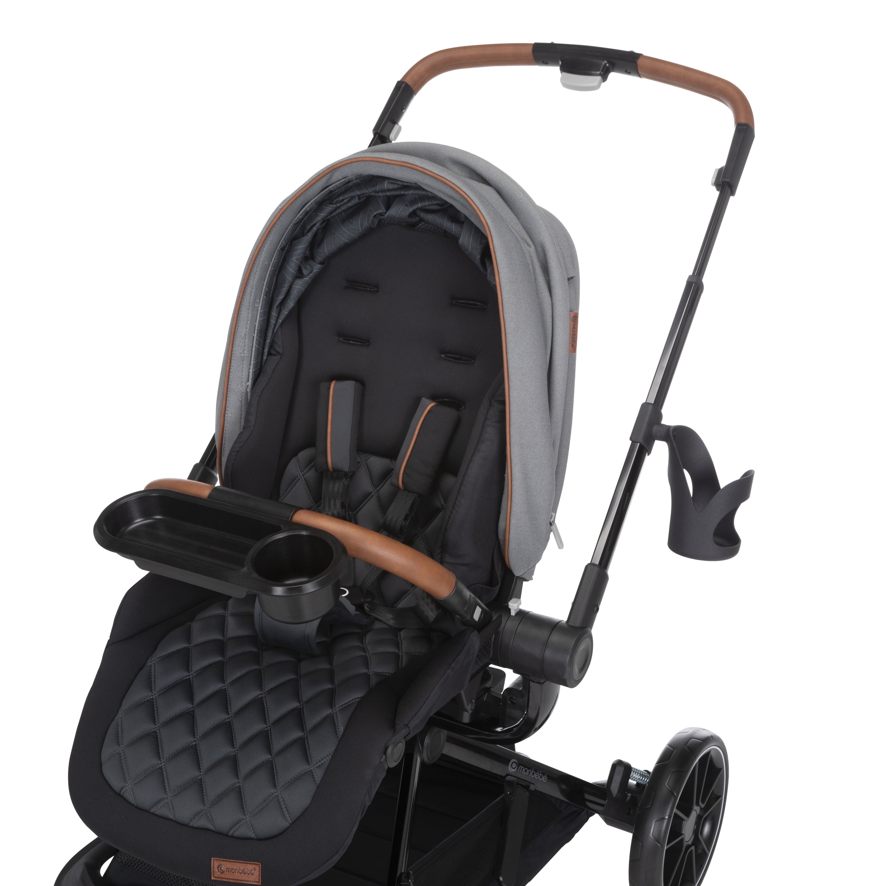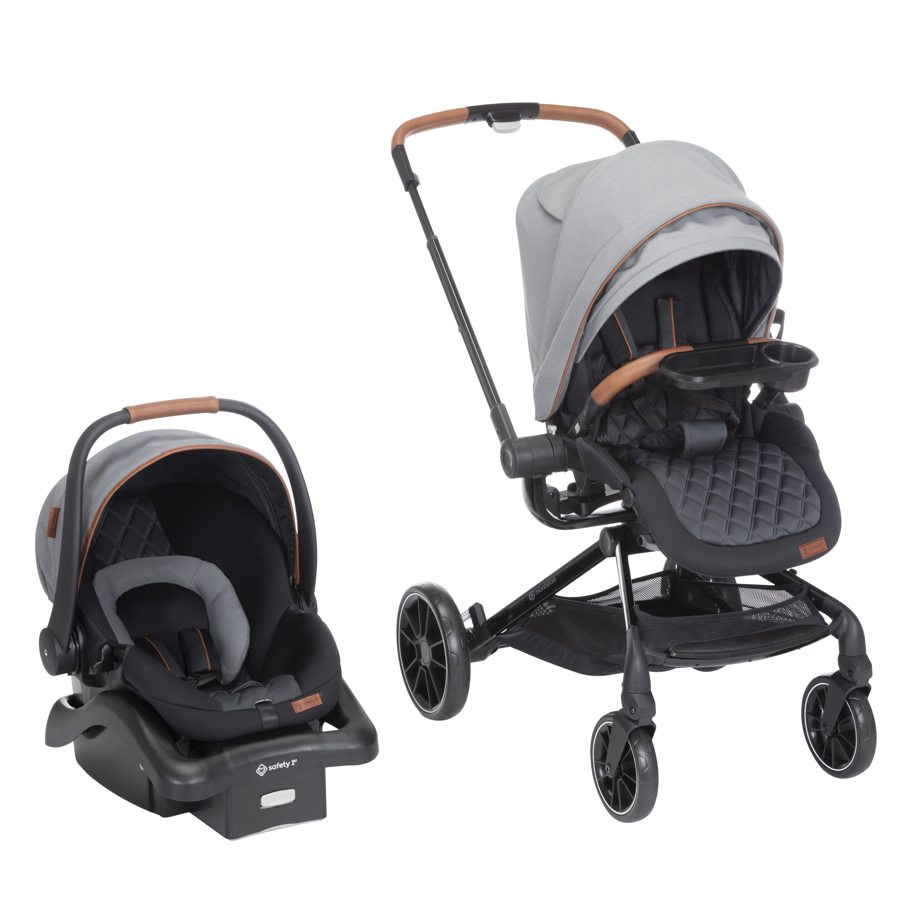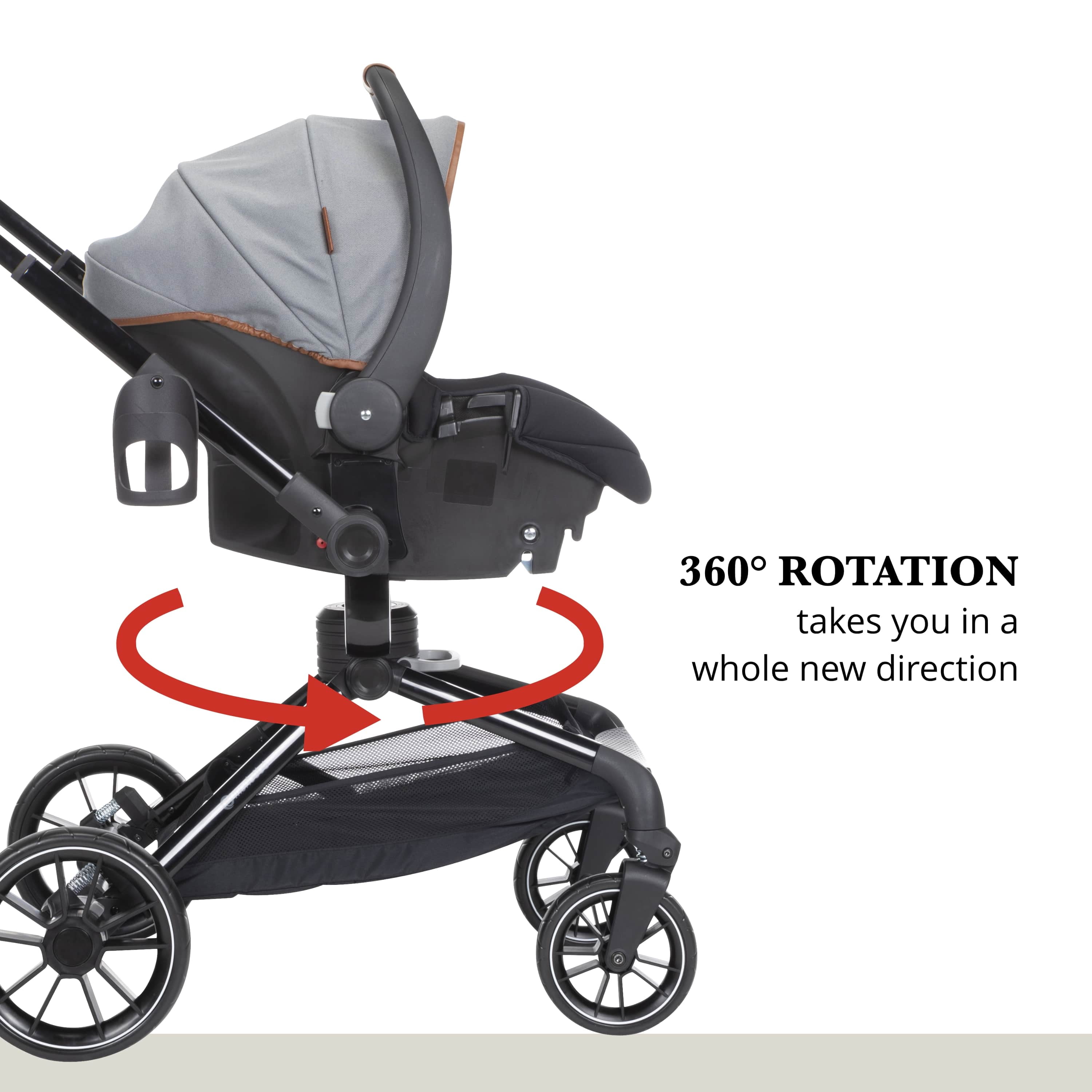 Take your little one for a spin with the Monbébé 360 Rotating Modular Travel System. Change their view (and yours) in seconds with the 360° rotating seat. With the push of a button, effortlessly raise the handlebar to turn the seat. Now, your tiny traveler is facing the other direction, so you can keep an eye on each other or let them see the road ahead. This versatile stroller is paired with the Safety 1st onBoard FLX Infant Car Seat and makes going from car to stroller (and back again) quick and easy. The infant car seat can also rotate 360° when attached to the stroller. Whether you’re headed to the park or out to run errands, you’ll have plenty of room to stow snacks and essentials in the roomy storage basket. Other features to love include a large canopy for sun protection and privacy, quilted memory-foam padded stroller and car seats, 3-position recline, and an adjustable leg rest for comfort. Attaching the Safety 1st onBoard FLX Infant Car Seat is easy with the fold-away car seat adapters––because they’re integrated, you’ll never have to worry about losing them. This travel system is made with parents’ comfort in mind as well, featuring adjustable telescoping handlebar, flip-flop-friendly brake, and a compact fold. With all its comfort and conveniences, you and your little explorer will enjoy 360° of fun and adventure from your very first stroll.