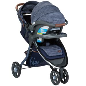 The Monbebe Edge All in One Travel System includes a stroller and a Safety First on Board 35 LT infant car seat with 5 pt front-adjust harness, infant insert and car seat base. This all in one system features a multiple position reclining stroller seat with enhanced details including true memory foam on both the stroller and infant car seat for added comfort for baby. The fashionable Edge travel system features a stylish frame including a three-wheel design for maximum maneuverability plus an adjustable faux leather grip handle for added comfort for you while steering the stroller or holding the infant car seat. The Edge stroller features a foot brake, multiple position reclining seat for baby and a one hand lift to fold which makes it easy and convenient for you to collapse and store in the car or home. The Monbebe travel system includes two important safety features by offering a five-point harness with comfort pads for your child security and safety while the large canopy with sun visor keeps unwanted UV Sunrays away from your child along with a peek a boo window on top to check on baby. The Edge travel system offers you many conveniences with a removable child tray, covered storage compartment and parent tray with cup holders as well as a generous storage basket provides the necessary locations to carry or hold it all. The Monbebe Edge Travel system is also available in a Grey and Pinstripe Pattern and comes with a 1 Year Limited Warranty. Monbebe and Watsi have partnered to help support life changing surgeries for children. Learn more about how your purchase helps by visiting www.watsi.org/company/dorel