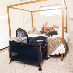 The Flex Deluxe is a full-sized, portable play yard that not only easily folds away for travel or storage in its included bag, it also features a removable baby bassinet constructed with memory foam for your newborn’s comfort. Simply remove or flip out of the way when not in use.