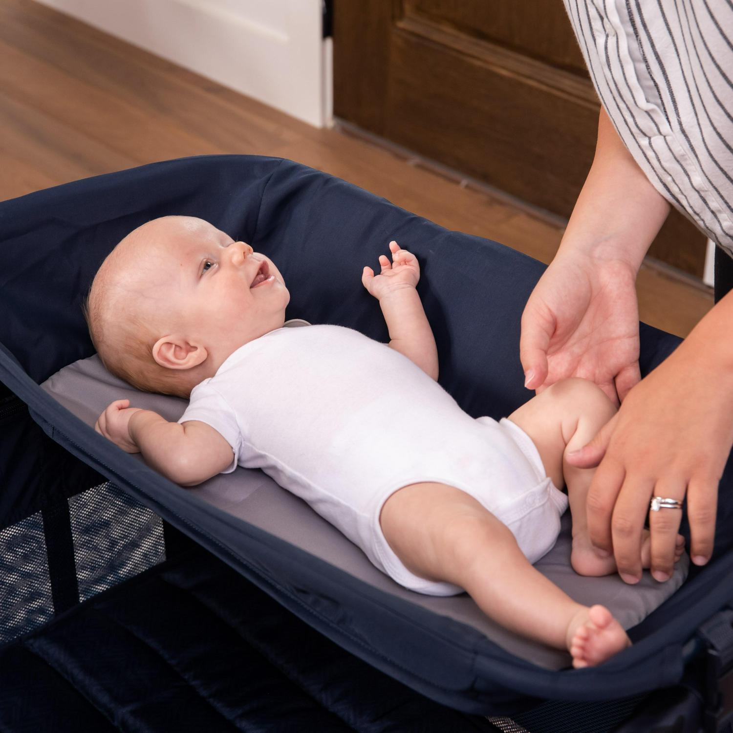 Much like the bassinet, the baby changing station on the play yard’s opposite side can be flipped up when it’s time for a diaper change, and the side storage pockets are perfect for storing diapering essentials.