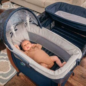 - Easy fold, full-size play yard with removable bassinet