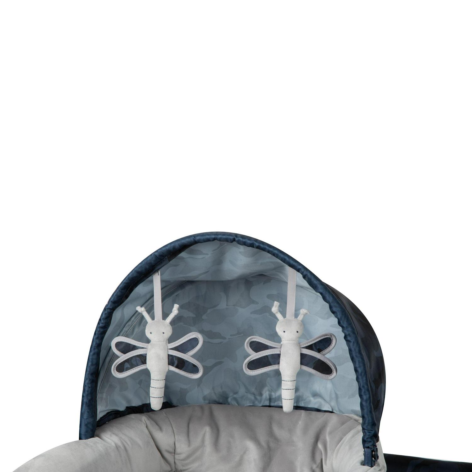 – Detachable canopy, soft plush toys on the infant bassinet