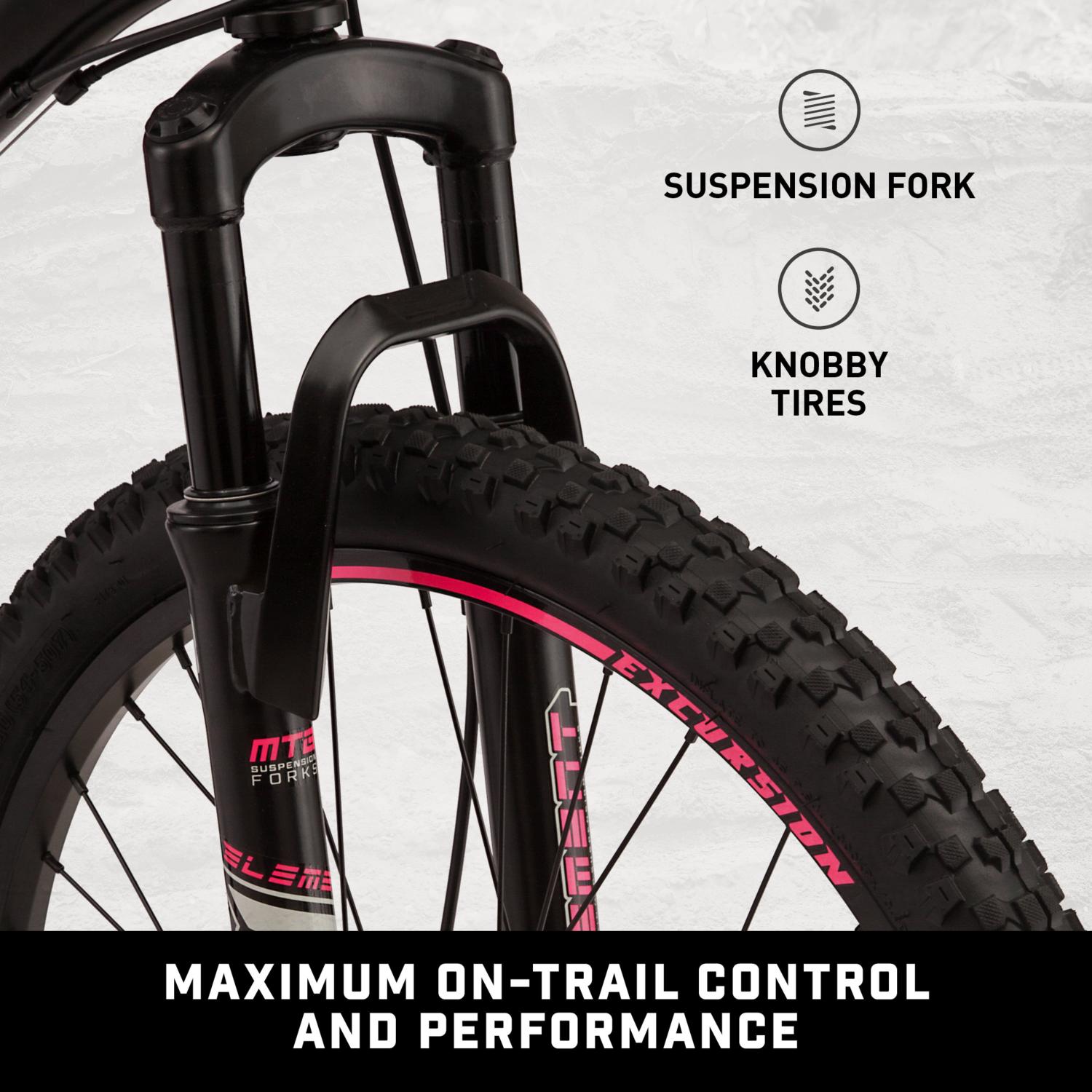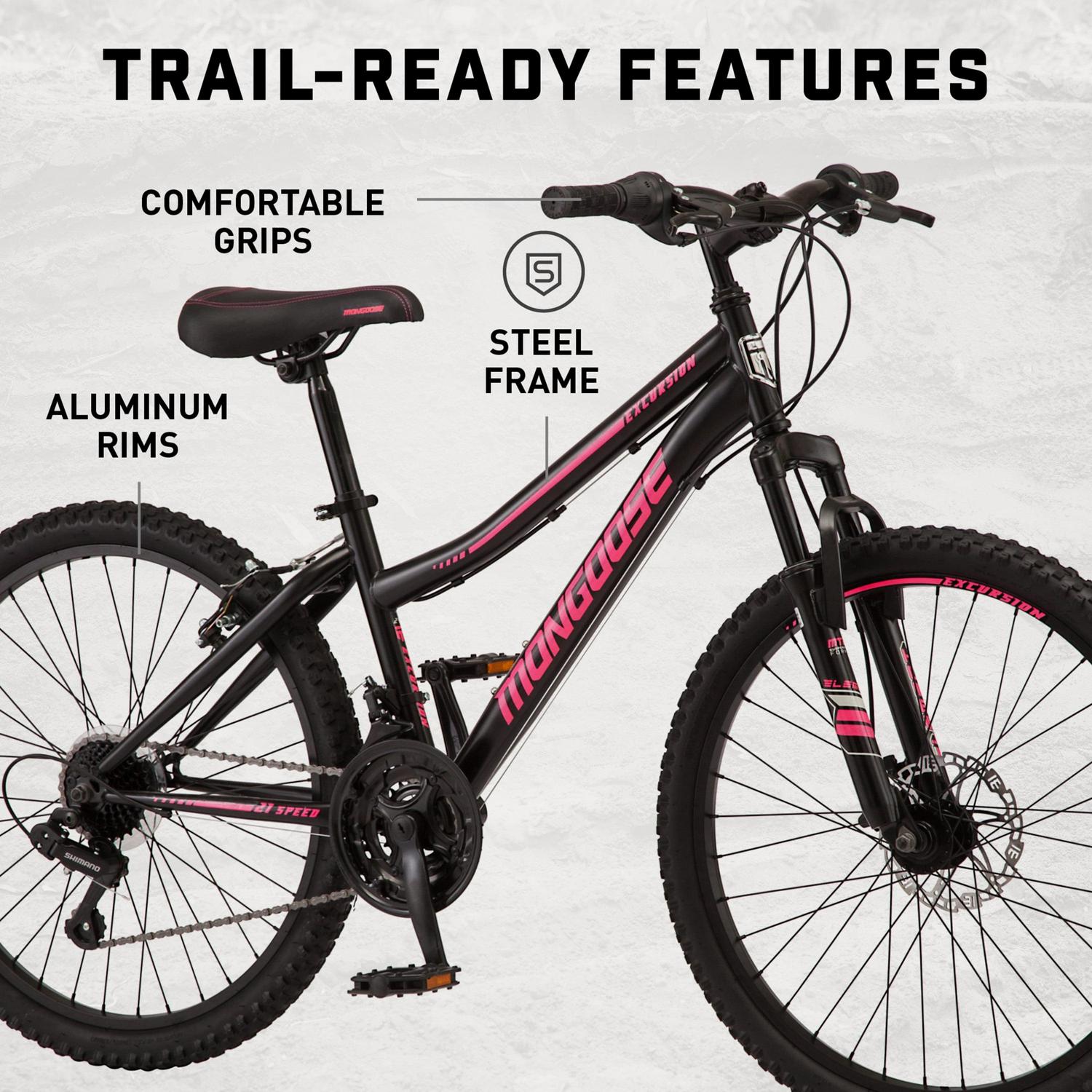 The Mongoose Excursion mountain bike was built for big adventures. It comes complete with a steel mountain bike frame and a front suspension fork that are perfect for rugged trail rides. The 21-speed twist shifters make it easy to adapt to your terrain, while the front disc brake and rear V-brake deliver crisp, controlled stops. Go out and conquer the trails with the Excursion by Mongoose.