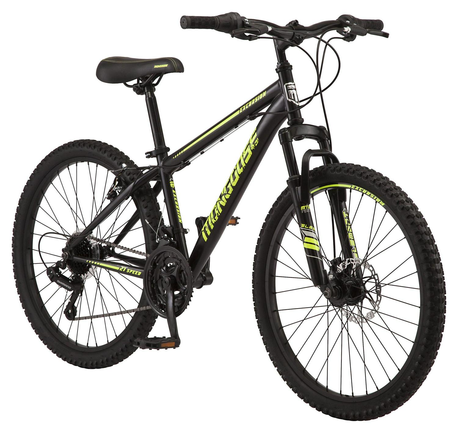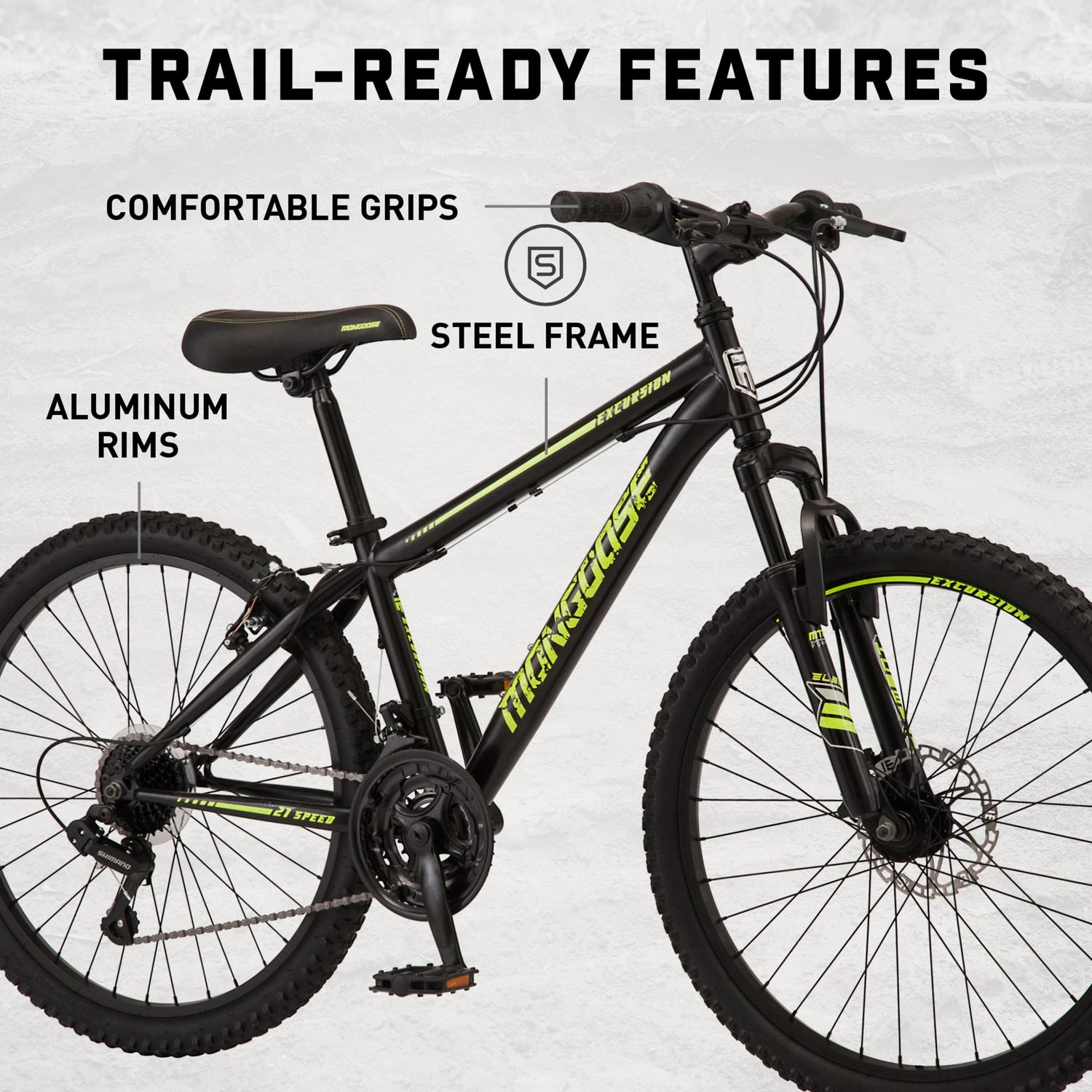 The Mongoose Excursion mountain bike was built for big adventures. It comes complete with a steel mountain bike frame and a front suspension fork that are perfect for rugged trail rides. The 21-speed twist shifters make it easy to adapt to your terrain, while the front disc brake and rear V-brake deliver crisp, controlled stops. Go out and conquer the trails with the Excursion by Mongoose.
