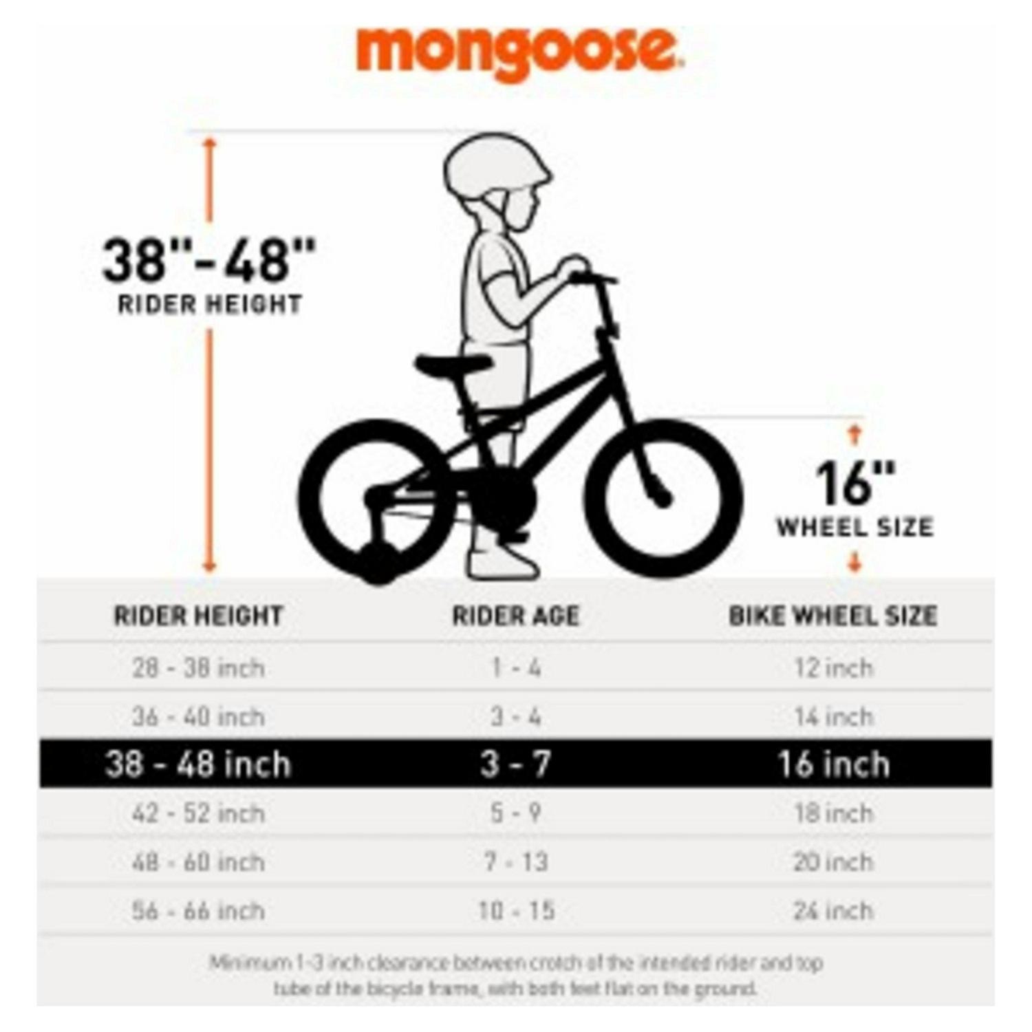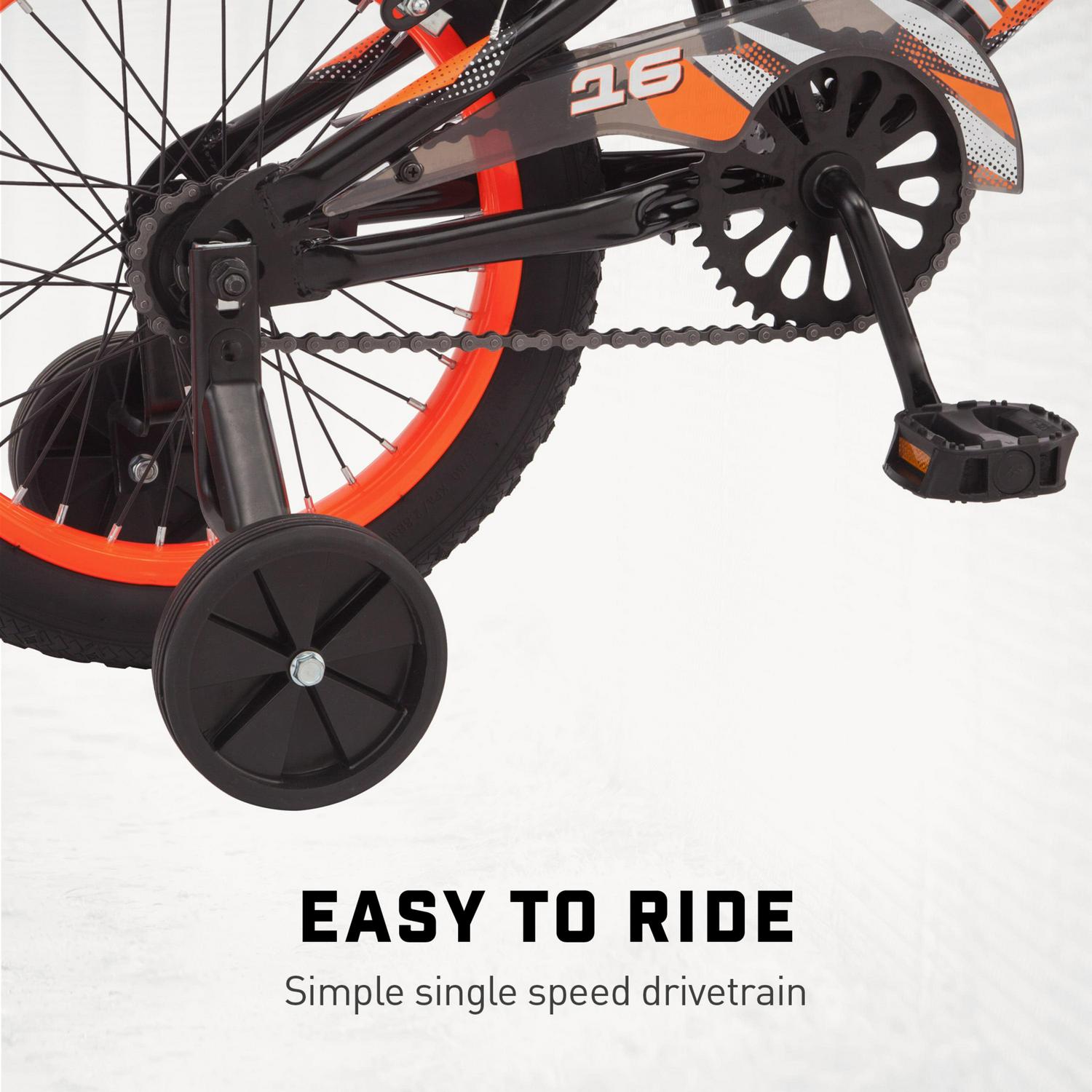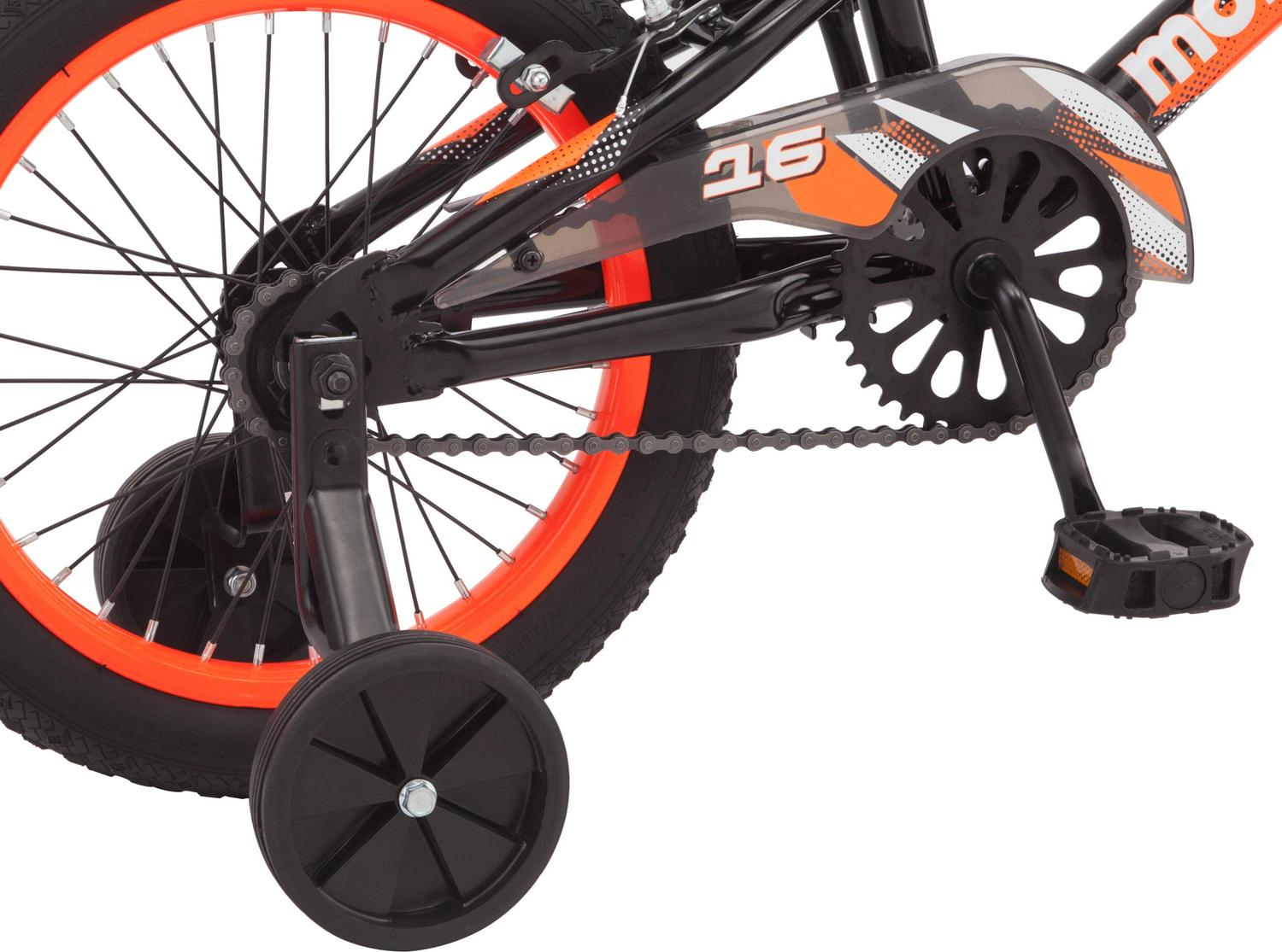 The Mongoose Mutant is the perfect sidewalk bike for future BMX riders and learning cyclists alike. Little freestyle fans will love the BMX styling and fun graphics that adorn the chain guard, seat, and handlebar pad. The Mutant has a scaled-down freestyle frame with a full-sized attitude, designed for young riders who are learning how to get comfortable on a bicycle. Single-speed riding and an intuitive rear coaster brake keep things simple, and caliper brakes are there for riders to learn how to brake as big kids do. 36-spoke color-matching rims will turn heads around the neighborhood and help add crucial durability.