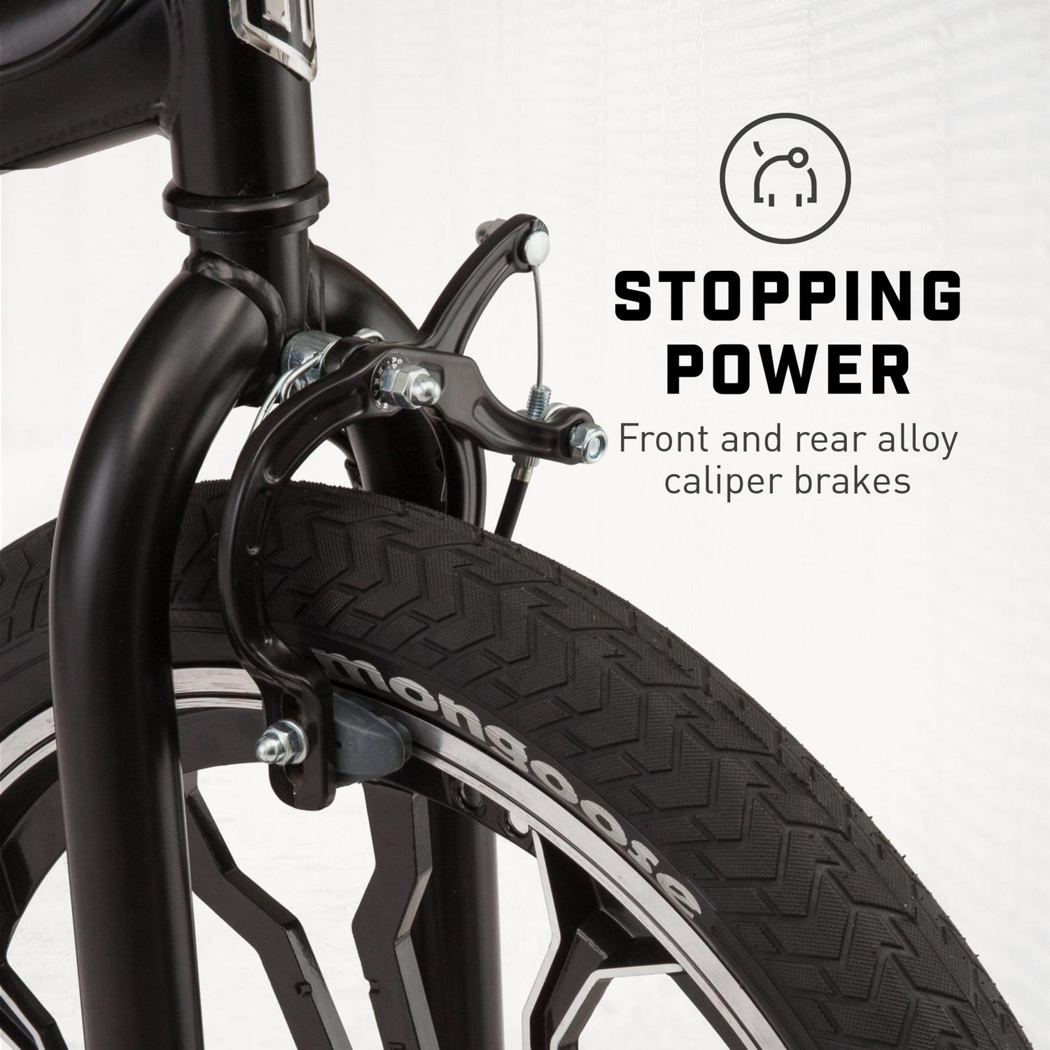 – Front and rear alloy caliper brakes make for secure stopping power. Cable detangler allows for 360° handlebar spins.