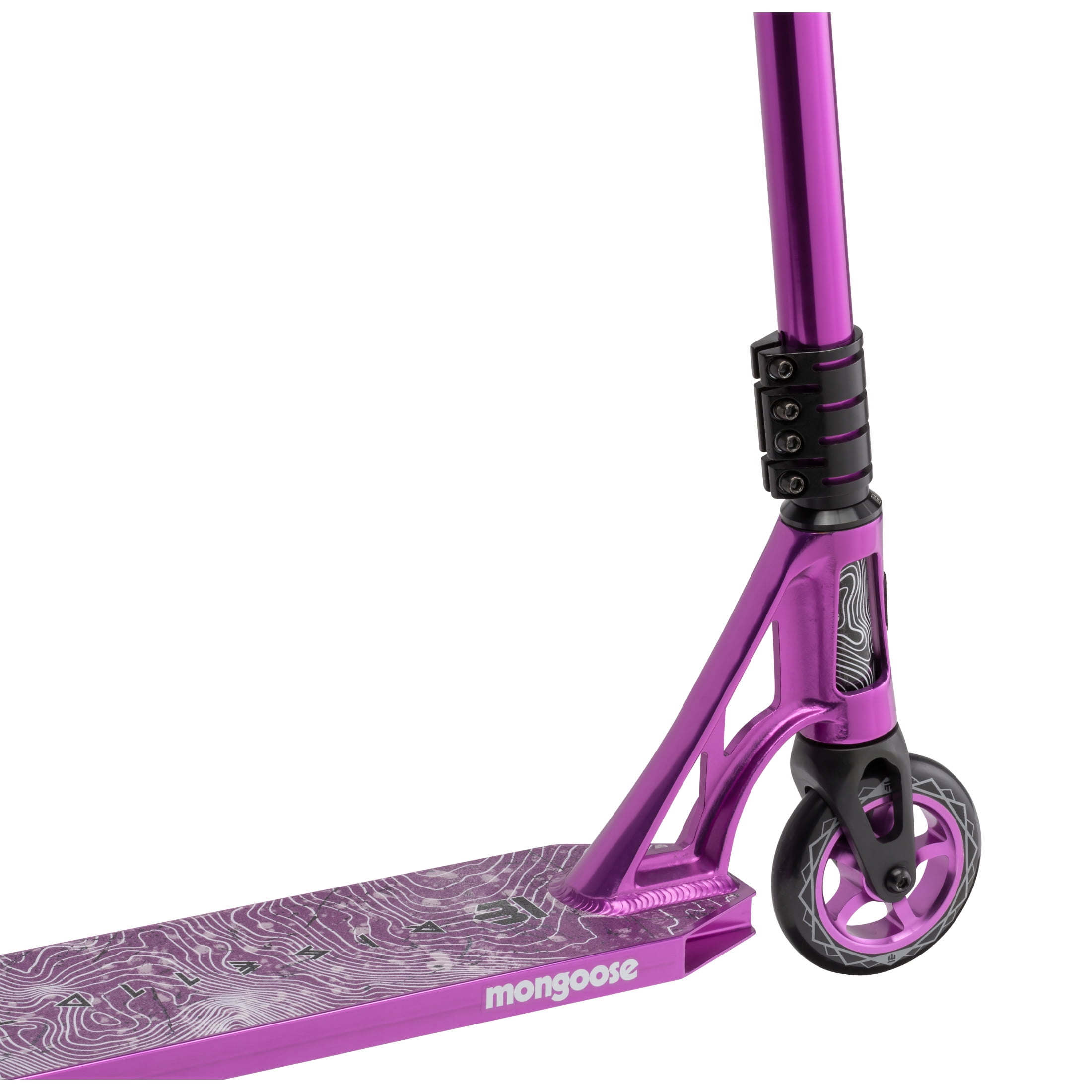 Mongoose Rise 110 Team Freestyle Stunt Kick Scooter, for ages 8 and up, Purple Showcase your skills at the skatepark with the Rise 110 Team Freestyle Scooter by Mongoose. The Rise is loaded with outstanding features, including a lightweight alloy deck with extended standing area for pro-style scooter performance. The full-coverage MaxGrip™ on the alloy deck and steel brake combine with 110 mm high impact alloy wheels and durable ABEC-9 bearings to provide smooth non-slip riding. The one-piece welded alloy T-bar handlebar with bike-style grips gives you the perfect combination of durability and comfort. Plus, the quadruple anodized CNC clamp collar, internal sealed threadless headset, and CNC alloy fork provides precise, crisp steering wherever you go. This scooter can accommodate a wide variety of riders, as the heavy-duty frame supports children ages 8+, up to 220 lbs. Upgrade your scooter game with the Rise 110 Team Freestyle Scooter. View more from us on our brand page.