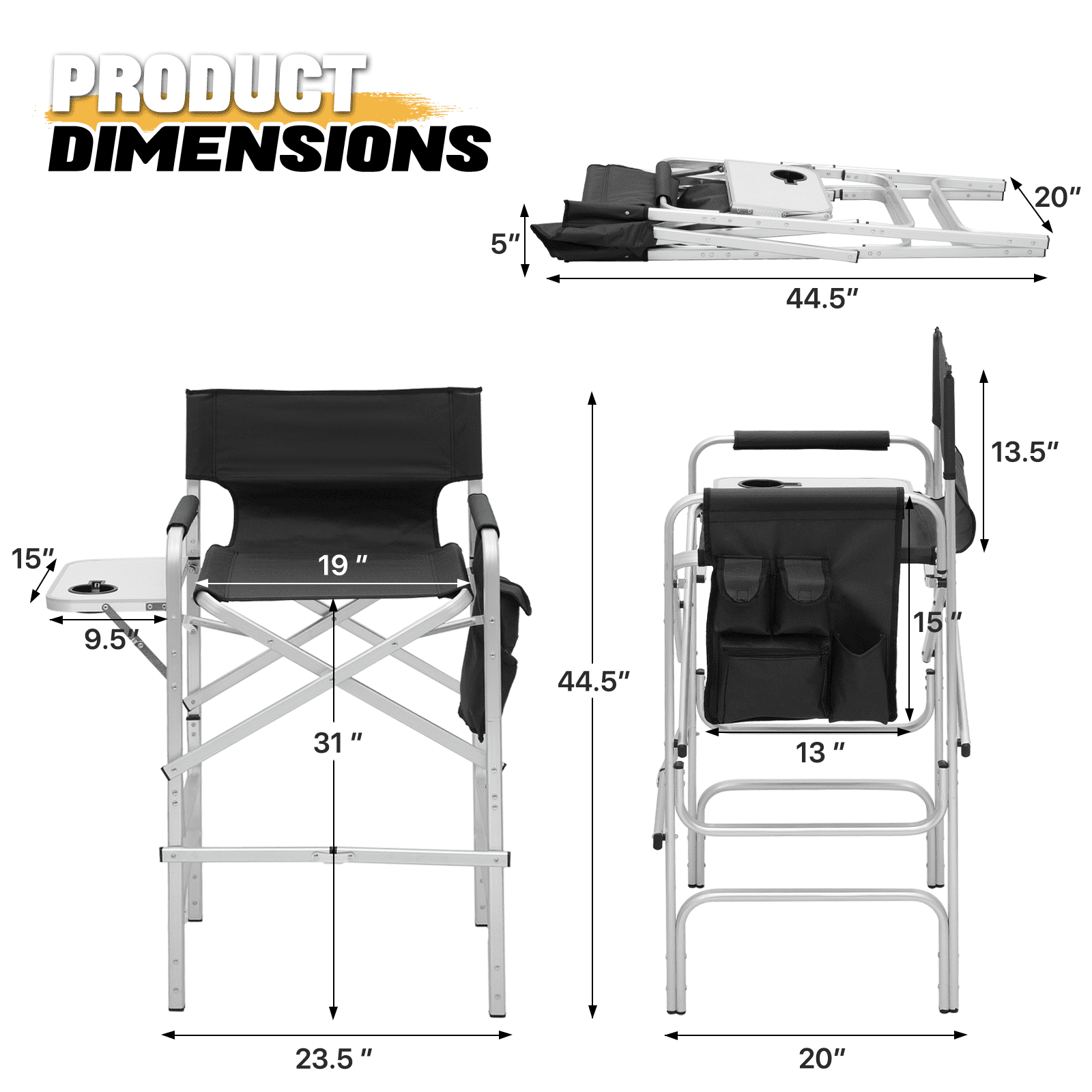 Unveil the epitome of comfort, durability, and functionality with our Tall Director Chair. Designed with a high-strength aluminum frame and 600D Oxford fabric, this chair ensures long-lasting durability. It offers the luxury of foam-padded armrests, a full back design, and an elongated footrest for ultimate comfort. A one-step quick-fold feature offers effortless storage and portability. The chair also includes a retractable side table and built-in storage pockets, making it an indispensable assistant for makeup artists, directors, and outdoor enthusiasts alike. Item Specification: