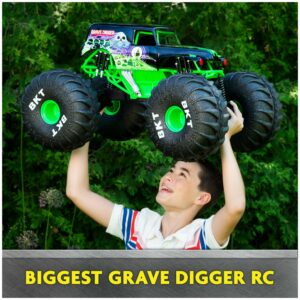 – BIGGEST MEGA GRAVE DIGGER RC: Use the control it from up to 150 feet away with the 2.4GHz frequency dual joystick controller and drive in any direction outdoors!