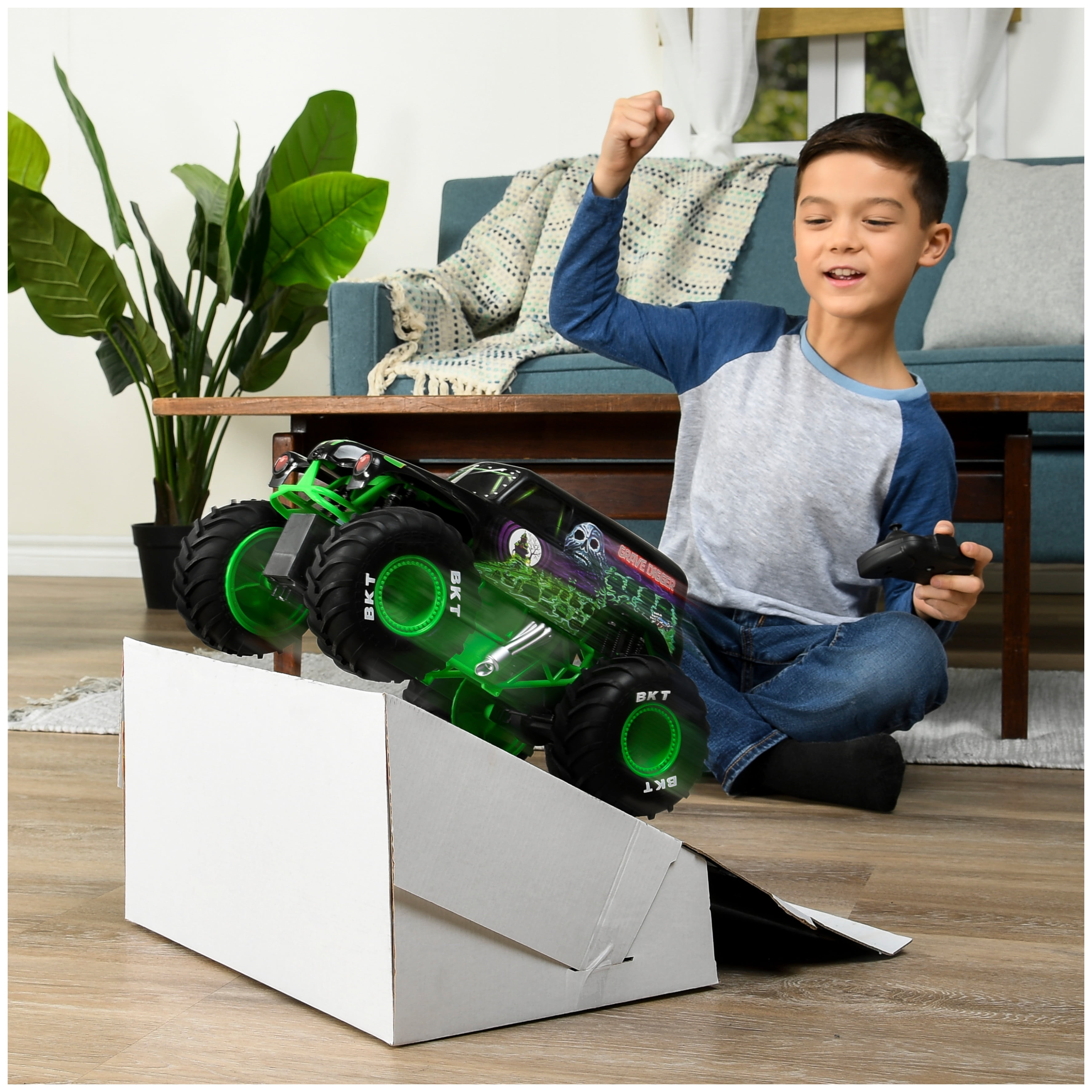 OFFICIAL GRAVE DIGGER: This realistic 1:15 scale Grave Digger RC truck is ready to run right out of the box! It comes complete with batteries for the controller & a USB cable to recharge the toy truck. READY TO ROLL: This fully functional RC monster truck features a dual-joystick controller with 2.4 GHz frequency that provides a range of up to 250ft & allows you to race up to 6 trucks at a time! REALISTIC RC TRUCK: Monster Jam cars feature authentic graphics, oversized tires, and highly realistic details. Use the included instructions to transform the packaging into a monster-sized ramp! TOP WISH LIST GIFT: Our monster trucks toys make a perfect holiday or birthday gift for boys and girls age 6 and up. Kids will love the high-octane fun of their own realistic monster truck replica! Includes: 1 x Monster Truck, 1 x Controller + 2 AAA batteries, 1 x Instruction Guide, 1 x USB Charging Cable (connected to truck) WARNING: CHOKING HAZARD – Small parts. Not for children under 3 years. Covered by the Spin Master Care Commitment. If you have a problem with a Spin Master product that you purchased from an authorized seller, we’ll resolve it! Because Spin Master is unable to control the quality of products sold by unauthorized sellers, unless otherwise prohibited by law, the Care Commitment is not available for products purchased from unauthorized sellers. The Care Commitment is limited to the original end-user purchaser. You may also be required to provide proof of purchase and/or a picture of your product to Spin Master to verify eligibility. Spin Master reserves the right to verify information, require a valid proof of purchase, and to deny request in its discretion