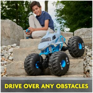– DRIVE OVER ANY OBSTACLE: Overcome any obstacle on and off road Mega Megalodon is unstoppable! With its rubber treads, mega-sized shocks and suspension, this RC monster truck can tackle anything!