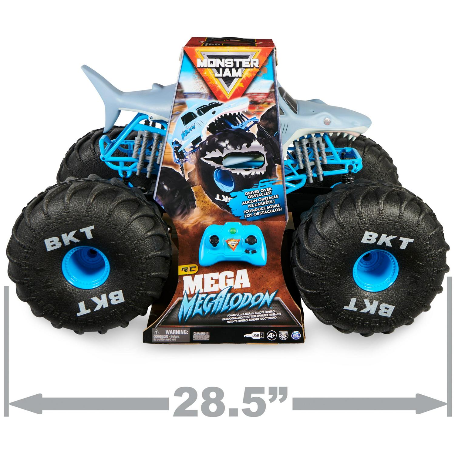 Overcome any obstacle with the biggest Megalodon RC vehicle, the MEGA Megalodon! This powerful all-terrain remote control vehicle measures over two feet long and puts you in control of epic Monster Jam action! The Mega Megalodon s oversized tires help you roll over anything, and keep on going! Its lightweight design and huge tires help you roll over obstacles with ease. Featuring a custom rubber tread for superior traction control and mega-sized shocks and suspension, this 1:6 scale USB-rechargeable RC monster truck offers unstoppable performance on and off the road. The lightweight construction makes it easy to pick up and turn your world into a Monster Jam arena! Using the dual joystick controller with 2.4GHz frequency, control the Mega Megalodon Digger RC from up to 150 feet away. This fan favorite vehicle is a fully functional RC: drive in forward or reverse, and steer left or right! With a detailed body, authentic BKT Tires, and look-alike chassis, this replica Megalodon is like driving the real thing! Look for all of our authentic licensed monster truck-themed toys (each sold separately), including remote control vehicles, True Metal die-cast trucks and playsets. You ve never been closer to the action than with Monster Jam! Monster Jam monster truck toys are the perfect gifts for kids ages 4 and up. Tackle any obstacle and experience ultimate performance with the Monster Jam Mega Megalodon RC!