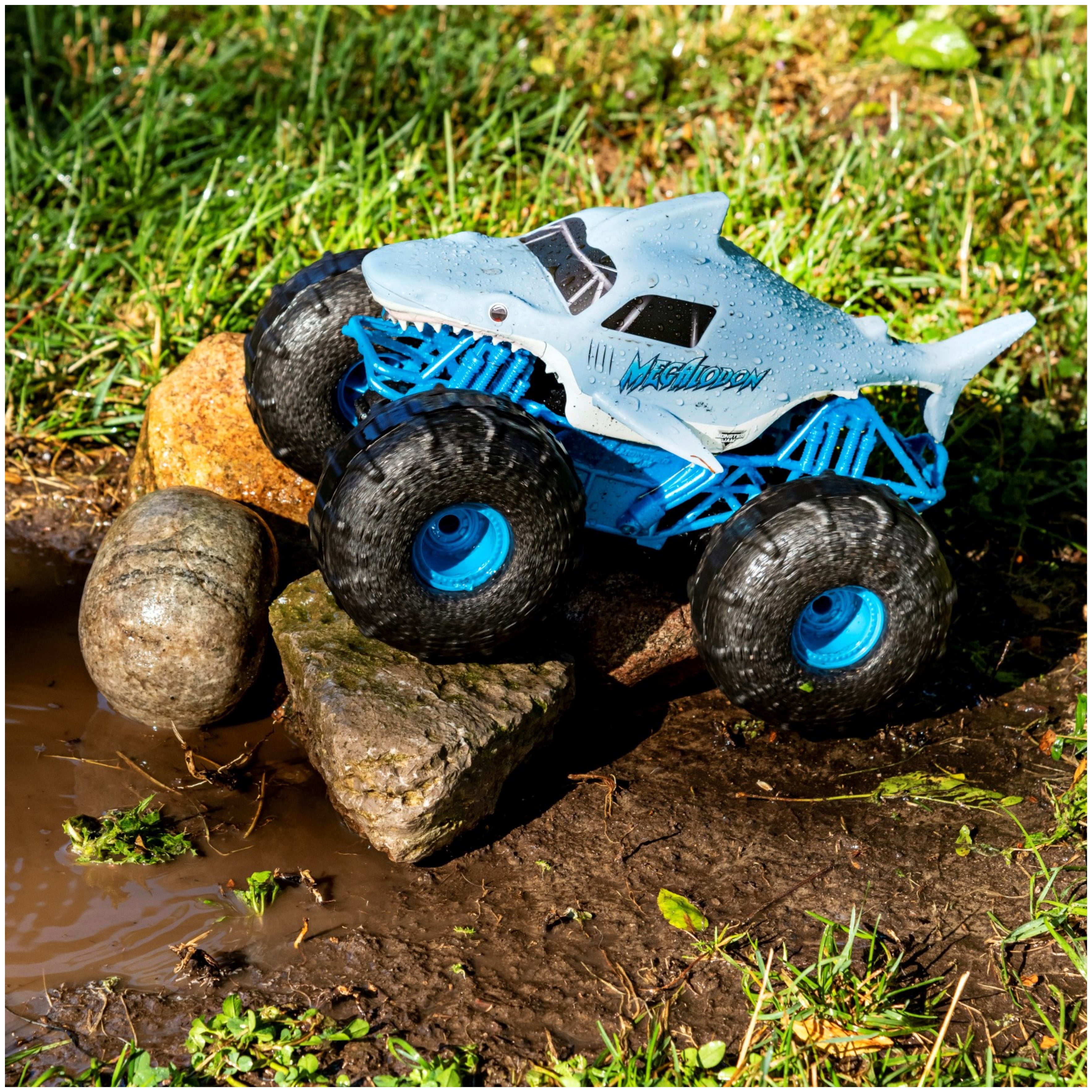 Experience all-terrain performance with the official Monster Jam Megalodon STORM Remote Control Car! This 1:15 scale remote control Monster Jam monster truck drives on water and any terrain with amazing performance and speed! The Megalodon STORM puts the Monster Jam RC trucks action in your hands and gives you the power to conquer snow, mud, rocks and grass! With a water-resistant body and lightweight custom tires, the Megalodon STORM can race on water, then switch to land and keep on going. Pull off epic maneuvers as you race left and right, drive forward and reverse with the easy-to-use remote control and turn your world into a Monster Jam arena! With 2.4GHz frequency, you can race up to six toy vehicles at once and control the Megalodon STORM RC from up to 100 feet away. Equipped with an out of range sensor, the controller will start beeping when you need to wrangle your RC back into range! Featuring an authentic design and official BKT tires, the Megalodon STORM feels like you’re driving the real thing! The Megalodon STORM RC is USB rechargeable, so you can power up and continue the high-octane Monster Jam action. Take control of Monster Jam’s menacing shark with the 1:15 scale Megalodon STORM RC!