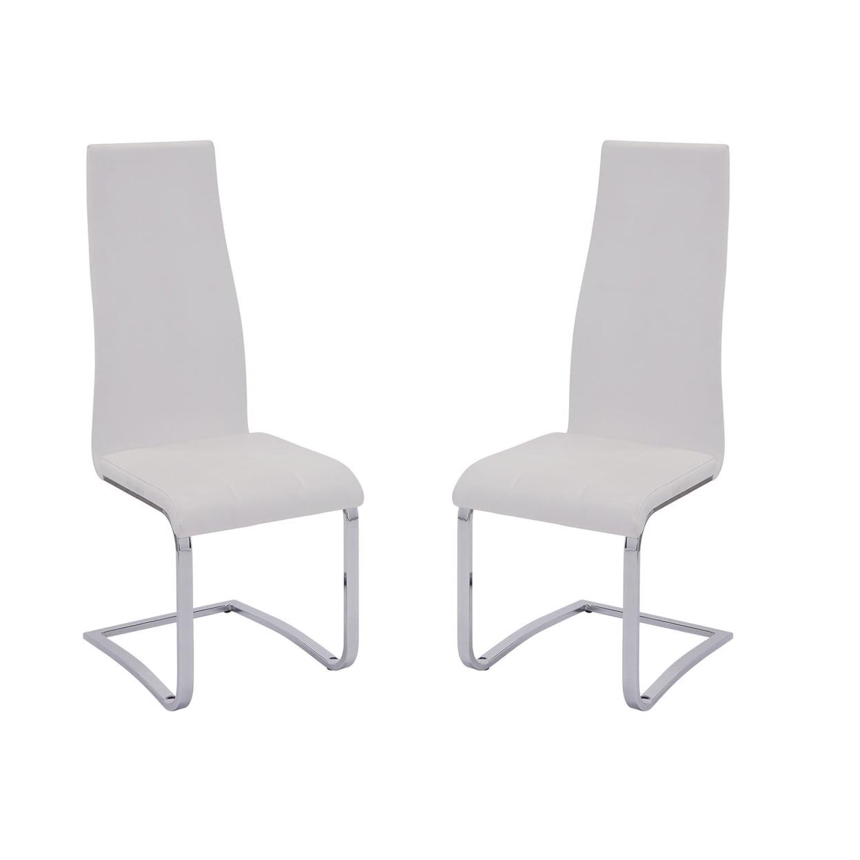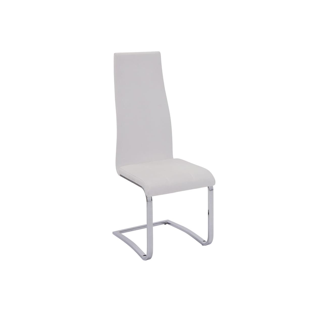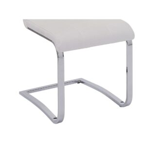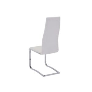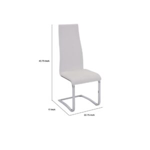 Stylish White Faux Leather Dining Chair with Chrome Legs, Set of 4- Saltoro Sherpi Outfit Your Dining Space With These Contemporary Upholstered Chairs. It Has A Tall Seat Back That Is Comfortable And Attractive, And A Seat That Is Upholstered In Faux White Vinyl For Additional Style. The Chrome Legs Curve Inward For A Unique Look, Making These Dining Chairs A Cool, Modern Addition To Your Home.