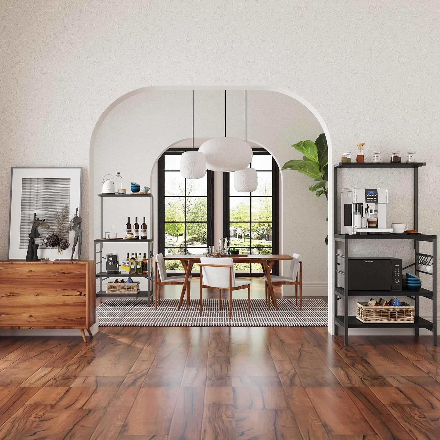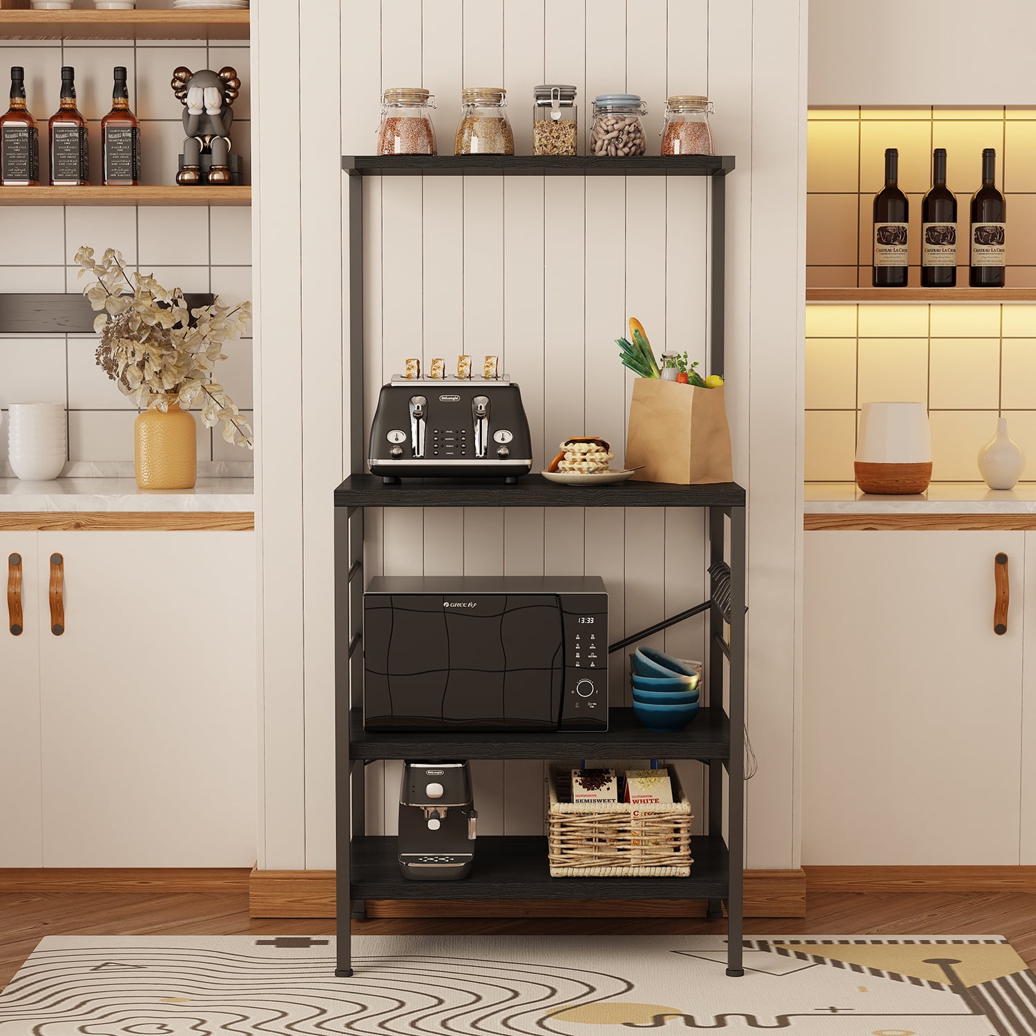 [MONVANE UPDATED ] Adjustable leg pads. “X” Design Frames. STORAGE SAVIOR – No more room in the pantry? This baker’s rack with storage is here to help; with abundant shelving and 4 side hooks, you’ll have room for food prep, pans, utensils, drinks, spices, towels, and more. SERENE STABILITY – Made from durable PB wood board and a sturdy metal frame, this stable microwave stand offers the support your kitchen goodies need; 4 adjustable feet on the bottom help keep everything in place, even on uneven floors. “ X” style design provides more support and ensures stability and durability. MULTIPURPOSE – The elegant and well-crafted appearance will add the distinctive flavor, elegance, and balance to your decor and can harmonize with any other furniture in any room. It can be used as book shelf, office storage shelf, baker rack, microwave stand and coffee bar in your home. NOT ONLY A KITCHEN BAKER RACK – 23.6″ L * 15.8″ W * 49.2″H. It is a great choice to be your kitchen storage shelf, Microwave Stand, Baker’s Rack, Spice Rack Organizer, coffee bar and kitchen island. Easy to assemble: All accessories and detailed instruction are included. Features: Overall Size: 23.6″ L * 15.8″ W * 49.2″H, provides large storage space. Set with Multi-Tier you can store toaster, spice, dishes, and any other things you want. Beautiful PB material with a smooth surface, easy to clean, anti-scratch, and anti-skidding. Stander frame utilizes heavy-duty and powder-coated metal materials, which ensures stability and durability. 4 little hooks make it convenient to hang some cooking tools. Modern simple fashion, fits all different indoor environments. Can be used as a kitchen organizer rack, shelf, dish organizer, microwave cart, oven stand or other kitchen appliances.