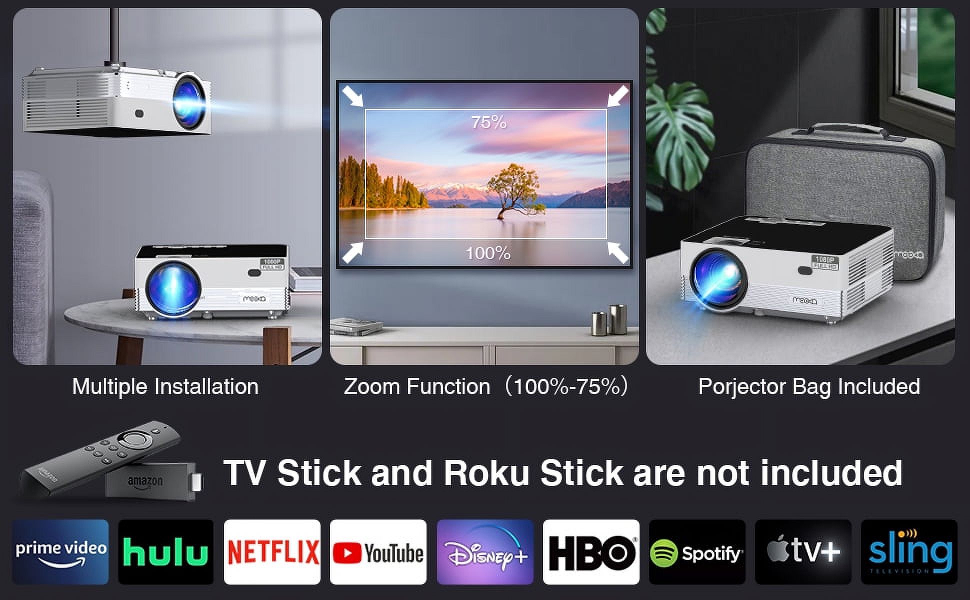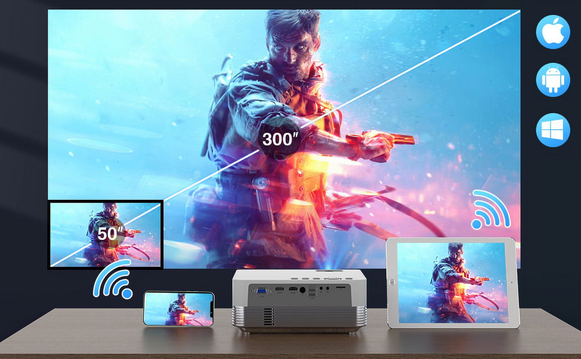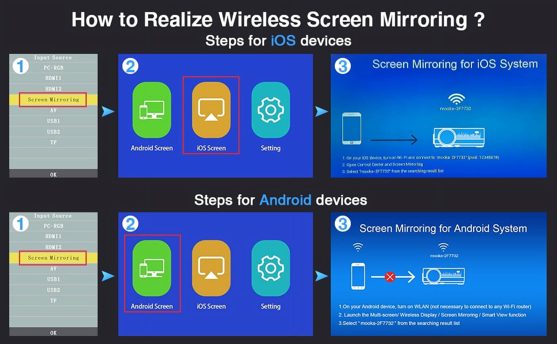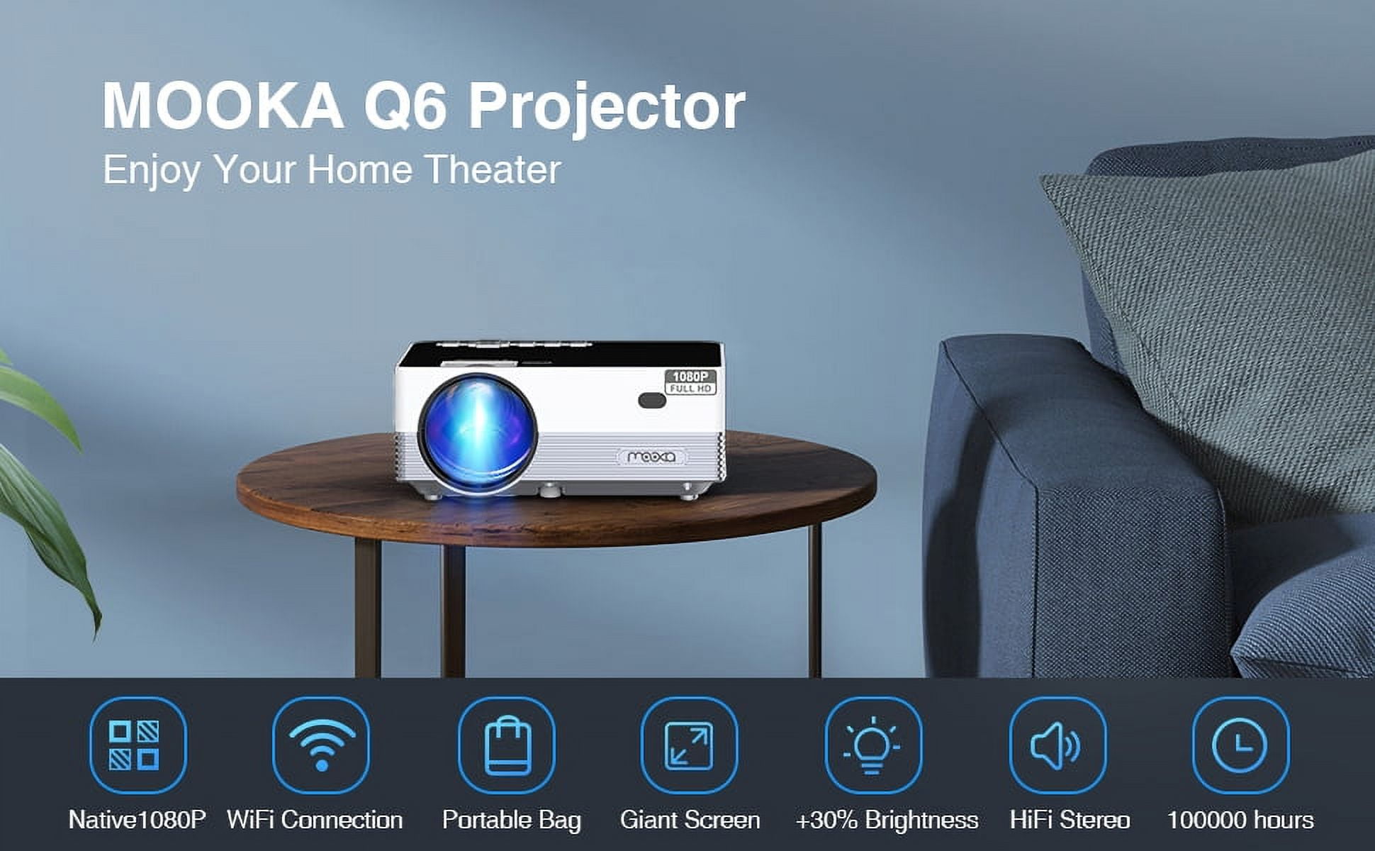 Why Choose MOOKA Q6 Native 1080P WiFi Projector? MOOKA has 10 years experience in producing projector, we aim at providing high quality projector with better performance. MOOKA 2021 Latest Native 1080P Full HD WiFi Bluetooth Projector-Q6 has 8500 Lux,10000:1 contrast,up to 300″ giant screen, supports multi-devices connecting and multi formats playing. Just simply set up, you can enjoy your favorite movies, TV shows and video games with your family and friends. With the unique design, Q6 video projector is a suitable gift for Birthday, Christmas, New Year, ideal for home&outdoor entertainment.Take MOOKA Q6 projector home, enjoy more happiness. The most attractive feature of Q6 is Native 1080P Full HD Mini Portable WiFi Projector with High Brightness–8500 Lux, 300″Giant Screen& Zoom Function, and you can also get a Convenient Carry Bag for free. Specifications: Brightness: 8500 lumens Contrast Ratio: 10000:1 Native Resolution: 1920*1080P(4K Support) Aspect Ratio: 4:3/16:9/Auto Projection Size: 45-300″(Recomanded is 120″) Zoom Function: 100% -75% (Reduced-25%) Lamp life: up to 100,000 hours MOOKA Q6 WiFi projector has convenient Wireless connection function, no need HDMI cables or expensive adapters. Q6 supports WiFi connection for iOS & Android systems, can mirror movies/games from your smartphone or mirror-cast-enabled devices to bigger screen. You can enjoy your relaxing movie or game time with your friends and family! Notice: 1.Due to HDCP copyright, Q6 wireless projection doesn’t support Netflix, Amazon Prime and Hulu, but you could use Amazon fire stick, laptop or PC to play. 2.Due to HDCP copyright is different, Google and Samsung phones do not support WiFi screen mirroring, Google and Samsung phones can only support Chrome-cast WiFi screen mirroring. Q6 projector is Mira-cast WiFi screen mirroring. 3.Please read carefully about wireless mirroring function parts in the manual before using wireless mirroring function. 4.The WiFi network should be greater than 50M. The stability of WiFi connection depends on the distance. Build the WiFi connection between projector and home router at the first time of using. 5.Can not connect WiFi is not quality problem. if you can’t connect WiFi, please let us know.