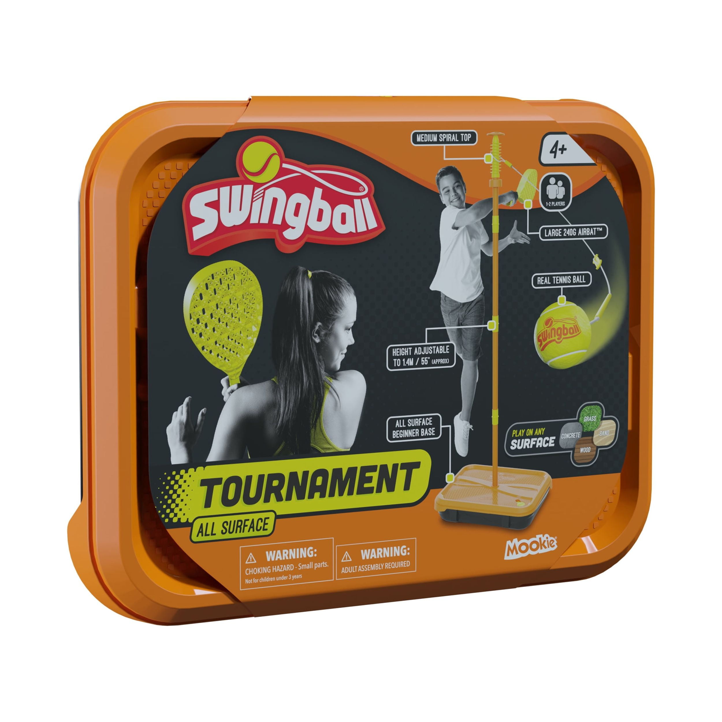 Key Selling Points: Includes a height-adjustable pole (55 in) and a real tennis ball Play on any surface Integrated handle Water plug to avoid spillages when filling Balancing feet & for stable gameplay on any surface The base converts into a carry case for easy transport and storage Ages 4+ years Dimensions boxed: (18.4 in x 14.0 in x 3.8 in) Dimensions in use: (18.4 in x 55.1 in x 3.8 in) Specifications: Ages: 4+ years Color: Orange/Yellow SKU: NSGC1331