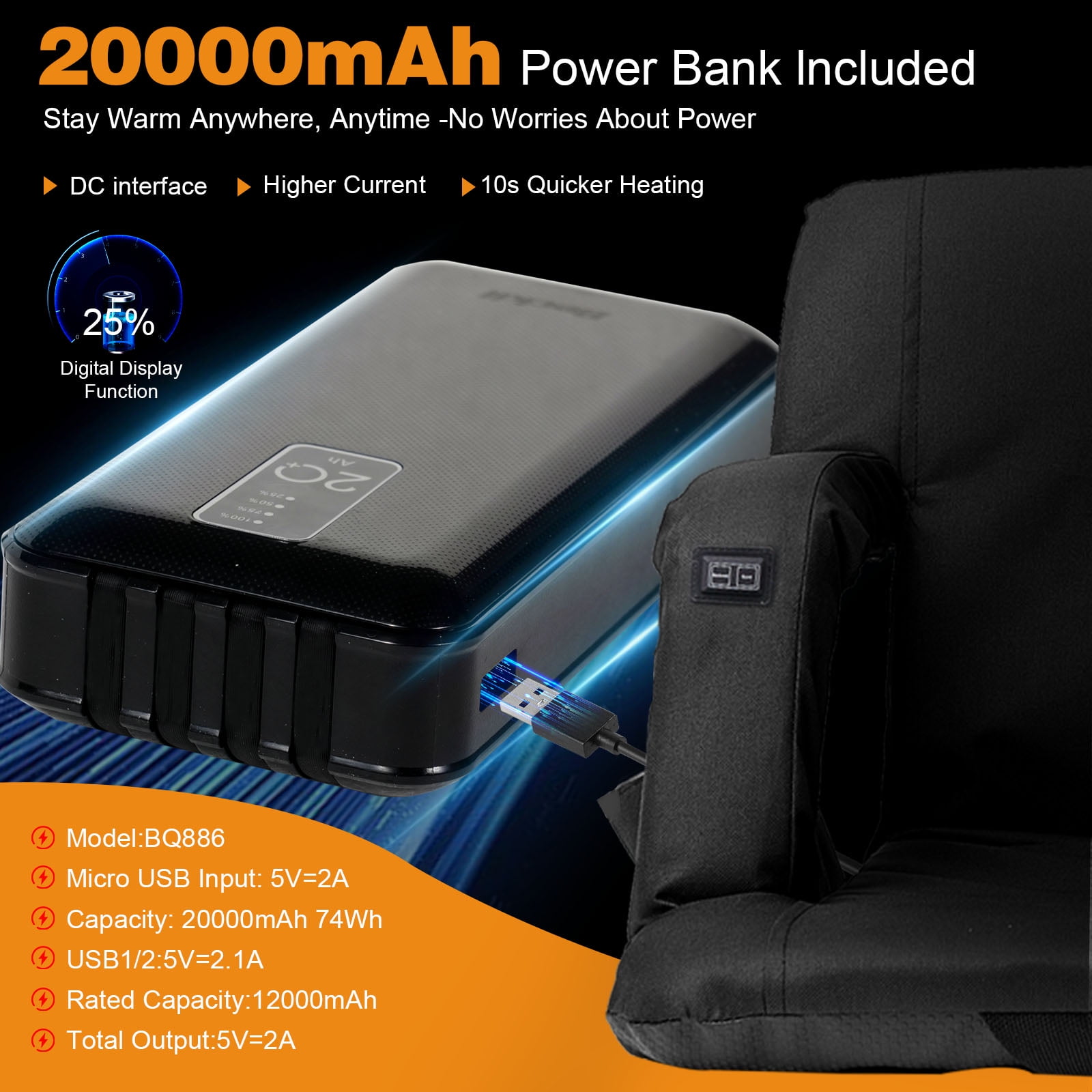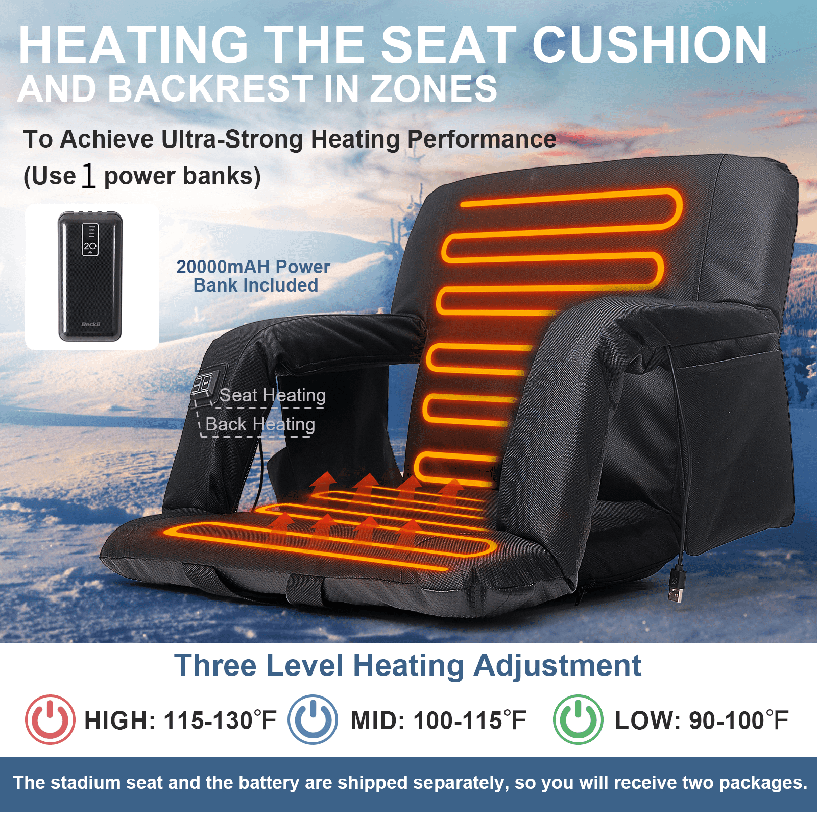 【UPGRADE BUTTON CONTROL】 Our Heated Bleacher Seat upgrade with a built-in button and 3 heating levels. Simply press the button to adjust 3 heating settings (Red – High; Green – Medium; Blue – Low). It’s very easy to use. Just insert the cable into the battery(power banks are not included in the package), press the button, and you can feel the warmth for hours. 【DUAL-ZONE INDEPENDENT CONTROLLED HEATING SYSTEM】 Our Heated Bleacher Seat upgrade with dual-zone independent controlled heating system. You can heat both the seat and backrest simultaneously, or heat the seat cushion or backrest separately. More personalized usage methods. Bringing you a convenient user experience. 【6 RECLINING POSITIONS】 The heated bleacher seats can avoid the muscle soreness caused by sitting for a long time, you can focus more on your game or performance. The heated stadium chair has 6 reclining options, you can choose the most comfortable position to enjoy your happy time. 【UPGRADE MORE STABLE&2 FIXED METHODS】 Our Stadium seats for bleachers designed with 2 hooks and one fix strap for more stable use. It can be secured easily and quickly to most bleachers and benches. Which is not easy to move and more stable.NOTE:The hooks are hidden inside the bottom zipper. 【WIDELY USED】 MOPHOTO heated stadium seat is an excellent choice for any sport such as football, baseball, basketball, Olympics, World Cup, as well as outdoor activities, adventures, beaches, parks, camping, and travel. Stadium seats for bleachers are perfect for those who spend long periods of time with their children during training or waiting on the sidelines of sports events. Say goodbye to hard, chilly bleachers!