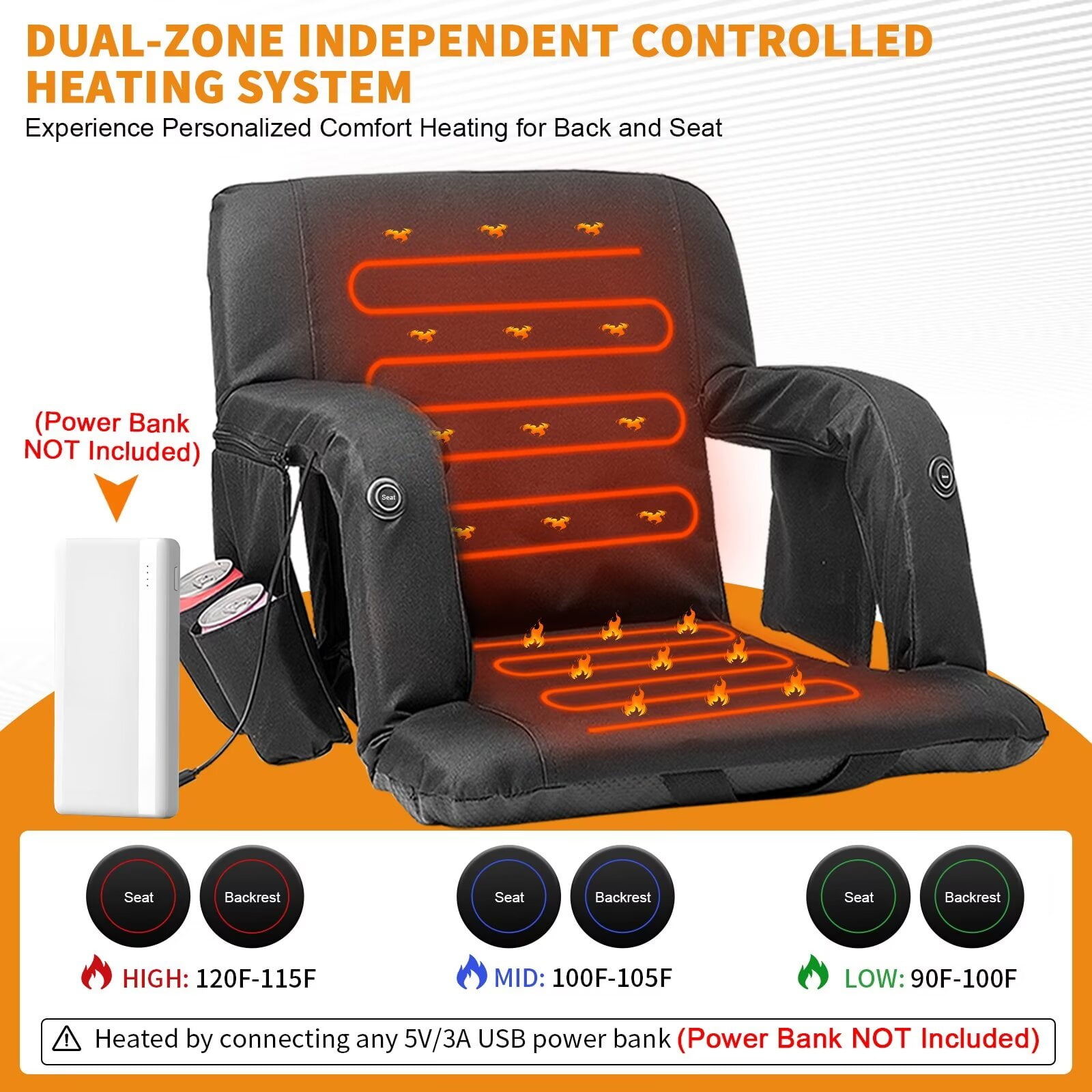 LARGER HEATING AREA, BETTER HEATING EFFECT: With a dual zone independent control heating design, the heating area is larger and the heating effect is bette. Two controls respectively control the heating of the bottom and backrest. You can choose to heat the bottom or backrest according to your actual needs, or insert two wires into different power banks (power banks are not included in the package) to heat both the bottom and backrest at the same time. DOUBLE HEATED STADIUM SEAT: Stadium seats with heated back and bottom. More Heat, More Comfort for you. Provides the ultimate warmth and comfort for your body in cold weather, keeping you warm and comfortable while you enjoy watching the game to the fullest. Two controls respectively control the heating of the bottom and backrest. You can choose to heat the bottom or backrest according to your actual needs. 6 RECLINING POSITIONS: The heated bleacher seats can avoid the muscle soreness caused by sitting for a long time, you can focus more on your game or performance. The heated stadium chair has 6 reclining options, you can choose the most comfortable position to enjoy your happy time. UPGRADE MORE STABLE&2 FIXED METHODS: Our Stadium seats for bleachers designed with 2 hooks and one fix strap for more stable use. It can be secured easily and quickly to most bleachers and benches.Which is not easy to move and more stable.NOTE:The spring hooks are hidden inside the bottom zipper. WIDELY USED: The heated stadium seat is an excellent choice for any sport such as football, baseball, basketball, Olympics, World Cup, as well as outdoor activities, adventures, beaches, parks, camping, and travel. Stadium seats for bleachers are perfect for those who spend long periods of time with their children during training or waiting on the sidelines of sports events. Say goodbye to hard, chilly bleachers!