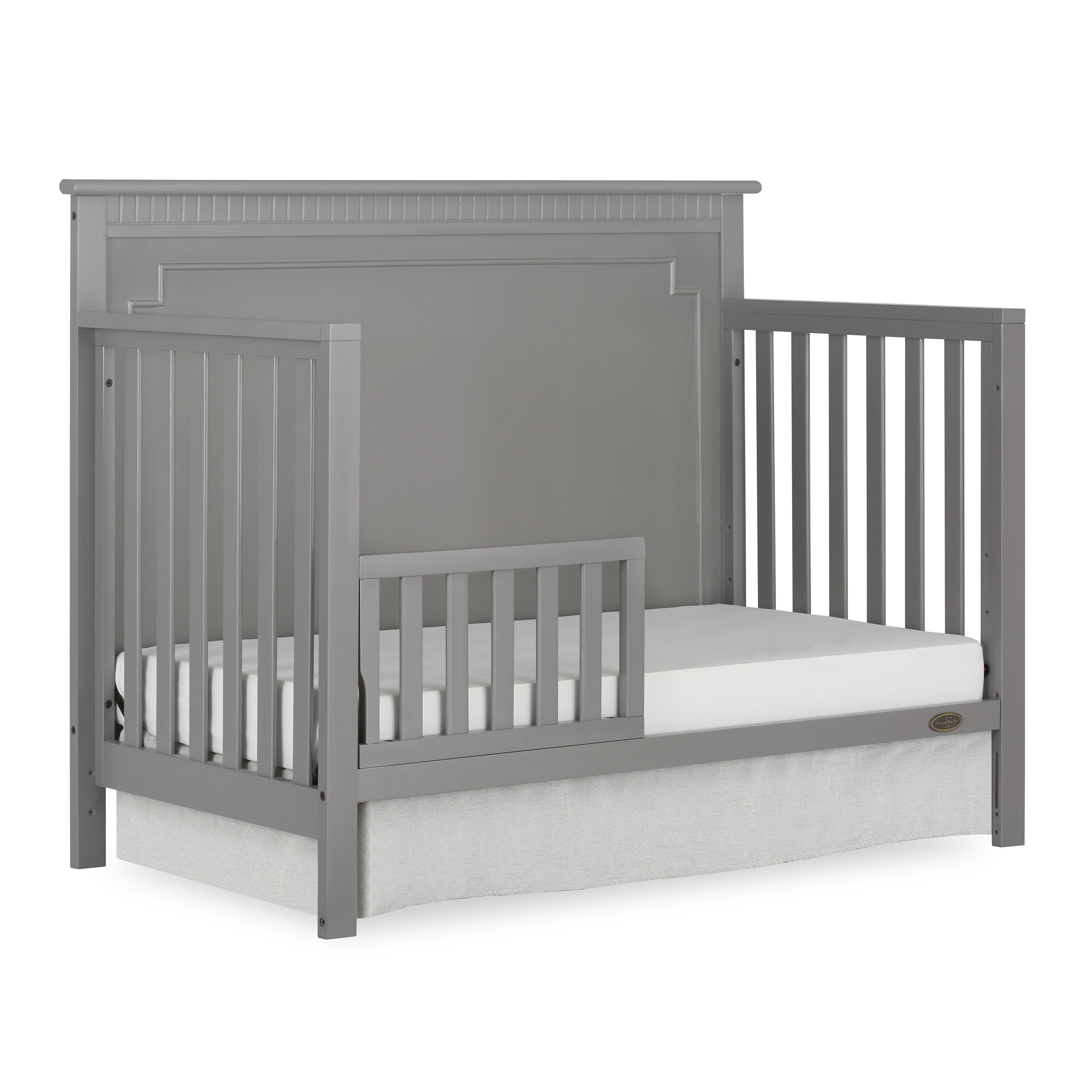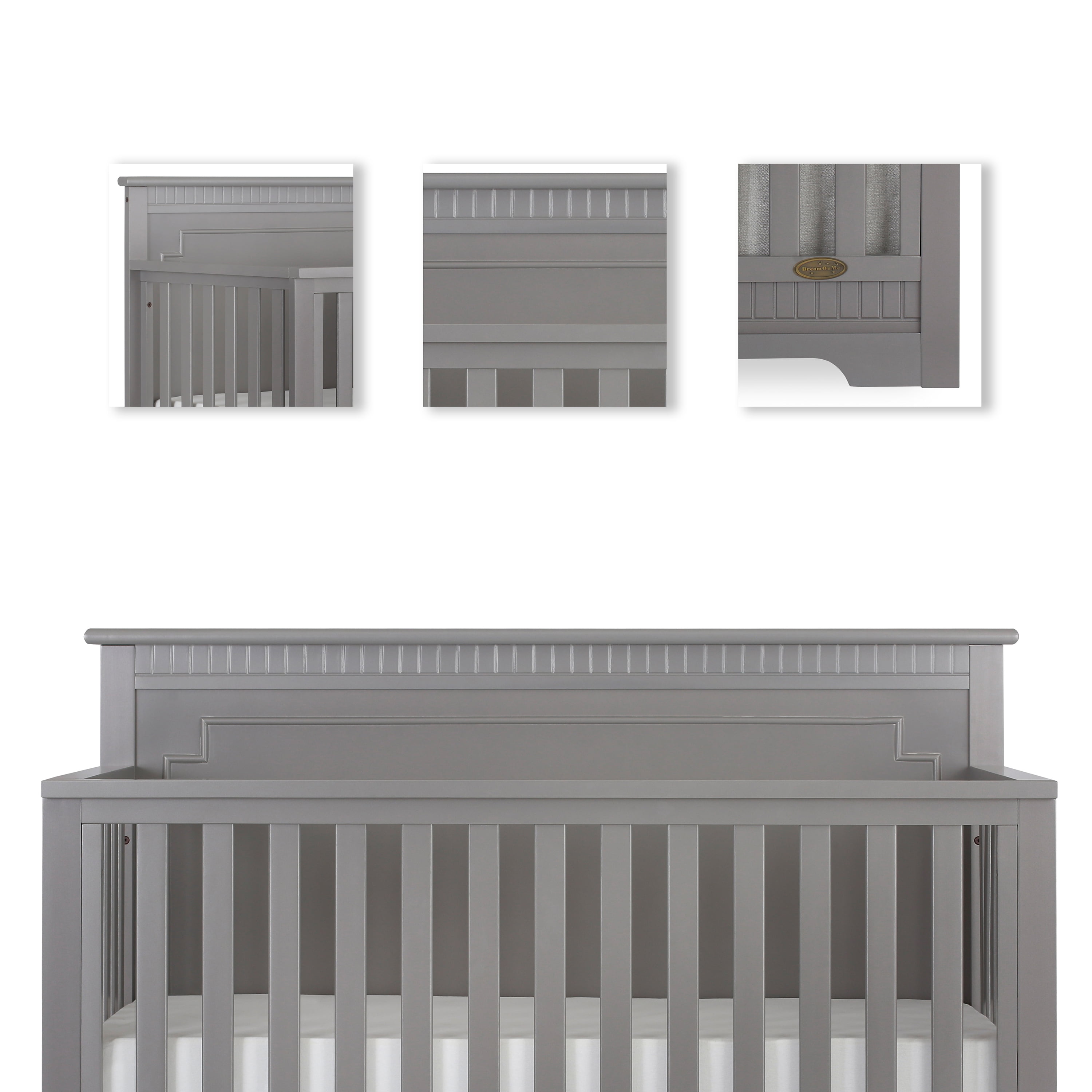 The Dream On Me Morgan inspired by the Boston sky line this modern ,5 in 1 convertible crib featuring full panel headboard connecting natural elements of wood with a flourish of decorator details. Its stylish flat-top headboard features dentil trim molding that lines the headboard and footboard. This crib offers a long term value converting into a charming toddler bed with our conversion kit ( sold separately ), daybed and the back panel converts to a full-size headboard with the simple addition of bed frame ( sold separately). The Morgan mattress platform adjusts to three different heights depending on the age of your baby. All Dream On Me cribs meets all applicable ASTM ,CPSC and JPMA standards