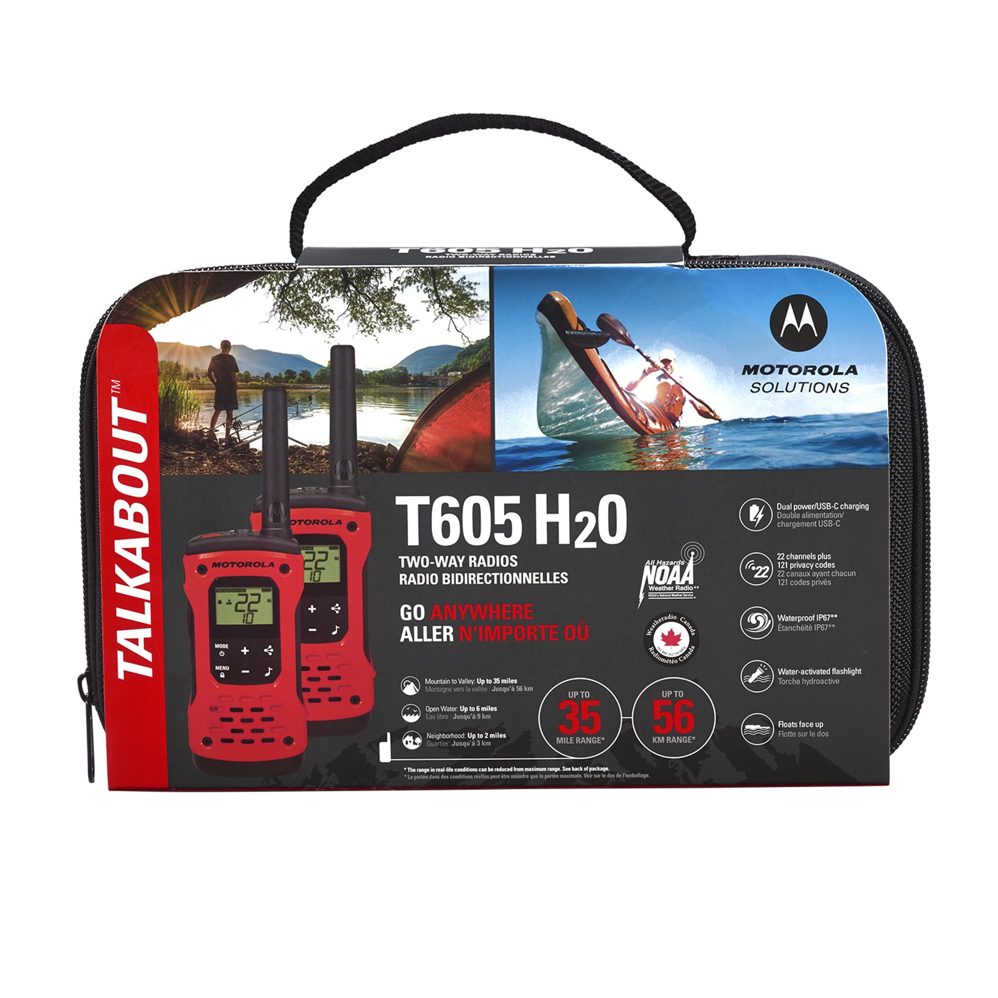 Stay connected during your wildest outdoor adventures. With a rugged, fully waterproof** design and a 35-mile range*, the TALKABOUT T600 H2O Series walkie-talkies keep you connected and protected. The T600 H2O Series walkie-talkies are packed with valuable radio features, like its floating capabilities and flashlight. And, the T600’s flashlight activates upon impact with water, so you don’t have to worry about losing your device. The T600 H2O Series’ long battery life, dual power and USB-C charging allow you to stay charged and maintain peace-of-mind during adventures. Whether it’s during outdoor adventures or emergency situations, the T600’s feature set will keep you connected and prepared. * Actual range will vary depending on terrain and conditions, and is often less than maximum possible. **This radio meets IP67 standards. It will withstand submersion of up to 1m for 30 minutes.