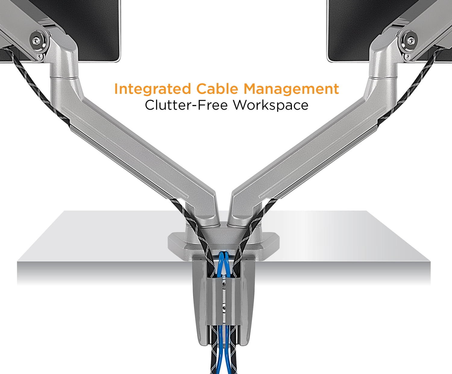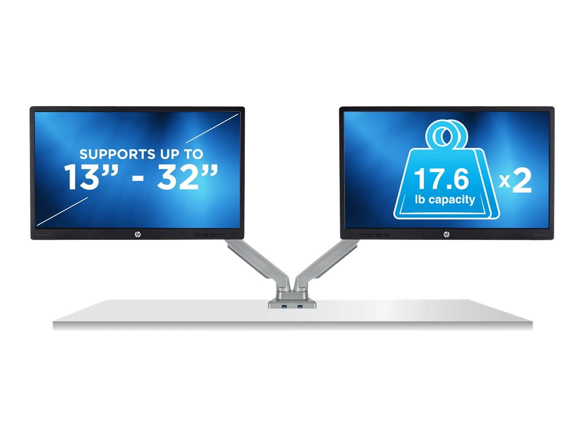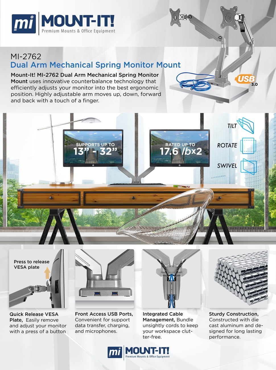 This dual monitor desk mount is a great addition to an ergonomic workspace, and provides the luxury of more desk room for other office essentials. Each VESA head bracket is compatible with 75mm x 75mm and 100mm x 100mm displays, and can hold 17.6 lbs. Swivel your monitors up to 180 degrees for portrait or landscape orientation, and tilt up or down 90 degrees. The cable management sleeves offer a clean, clutter-free look, while the two USB 3.0 ports, integrated into the base, are easily accessible for charging or data transfer. Product Overview Click for Product Video MI-2762 Manual