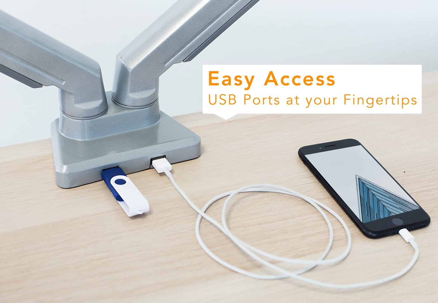 Two USB 3.0 Ports; Supports charging and data transfer Weight Capacity: 17.6lbs Compatibility: VESA 75 and VESA 100 bolt pattern Construction: High-grade steel and aluminum Tilt: 90 degrees down, 90 degrees up Swivel: 360 Degrees Rotation: 360 Degrees (Portrait or Landscape Orientation) Height Adjustment: 11.5 inches In the box: Mount, hardware kit (clamp base and grommet base), and installation instructions.
