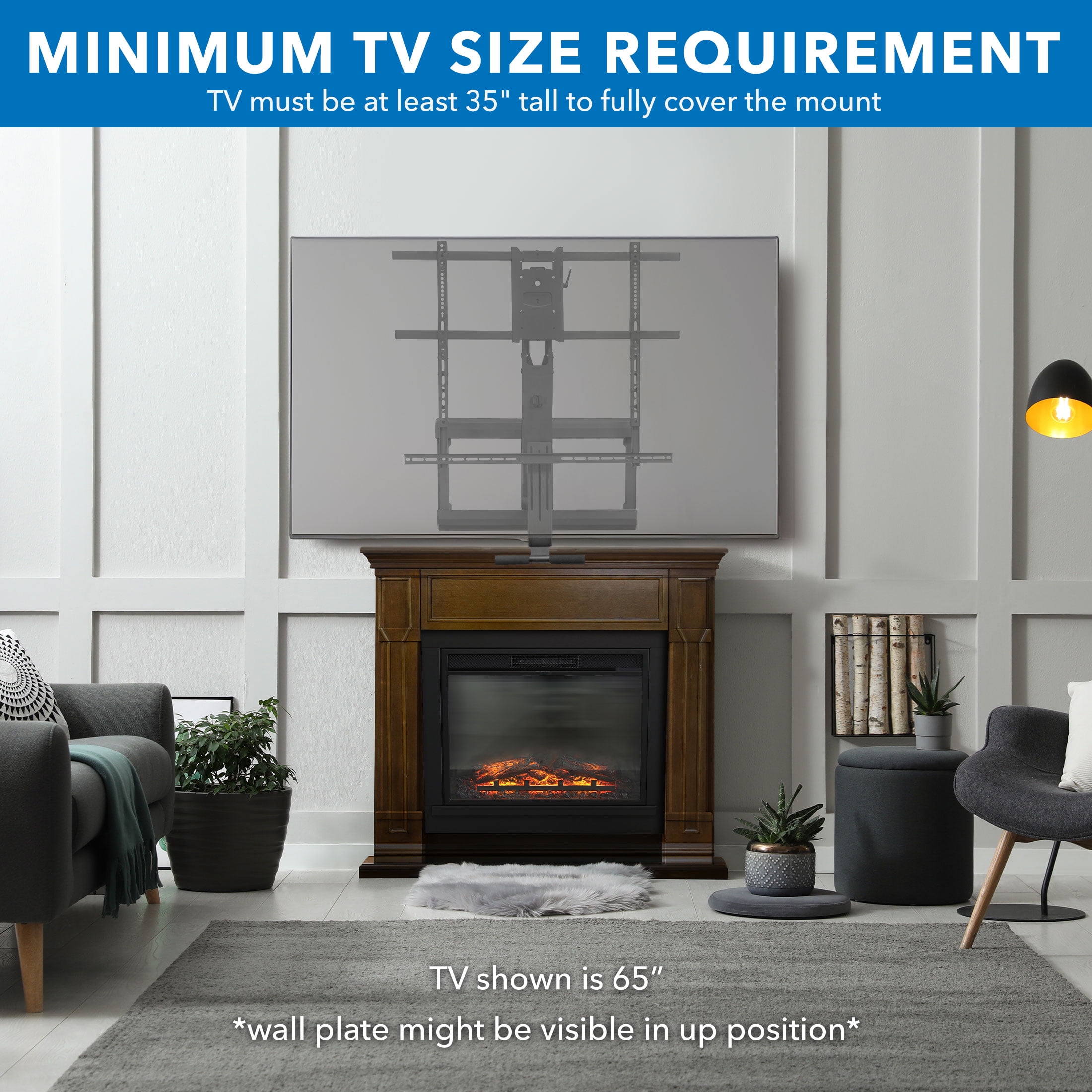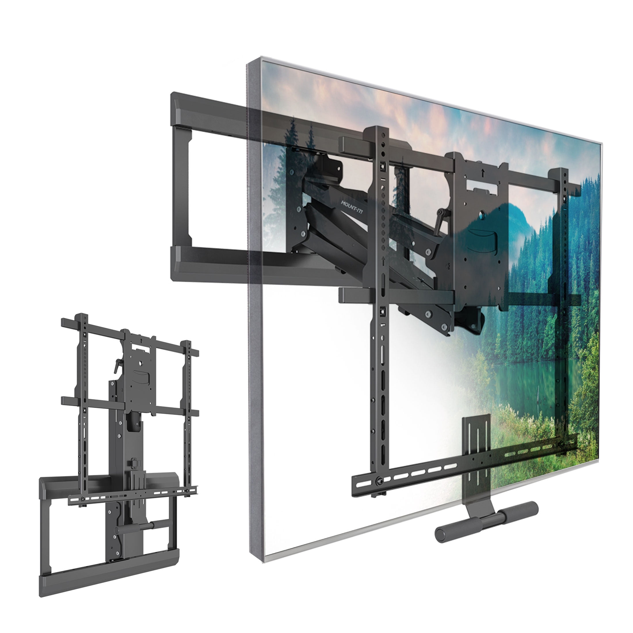 Note that only TVs size 60″ and larger will cover the entire mount in the upper position. With TVs smaller than 60″ parts of the mount may be exposed.
