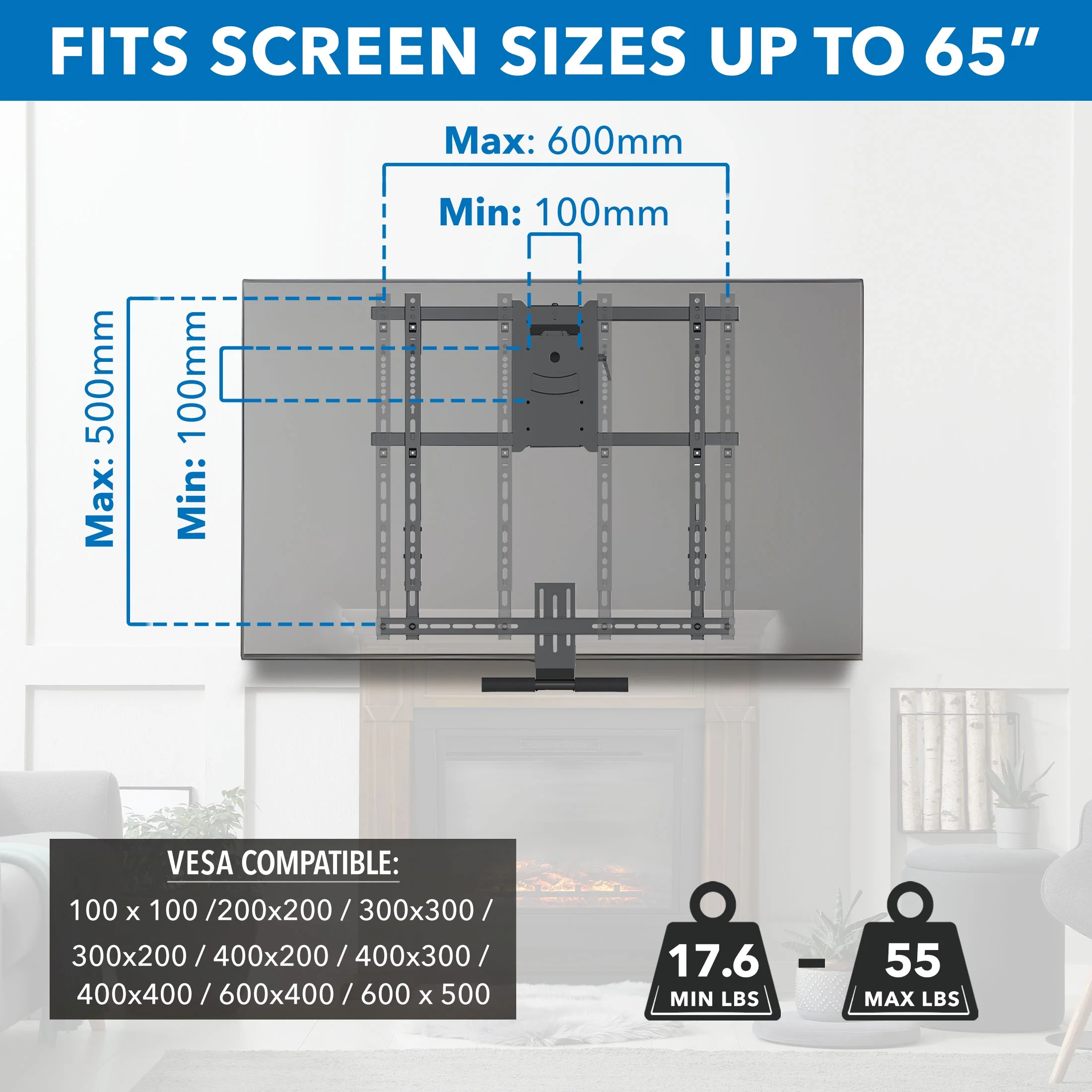 - Compatibility: VESA patterns 100 x 100 to 600 x 500 and screens between 42″ – 65″