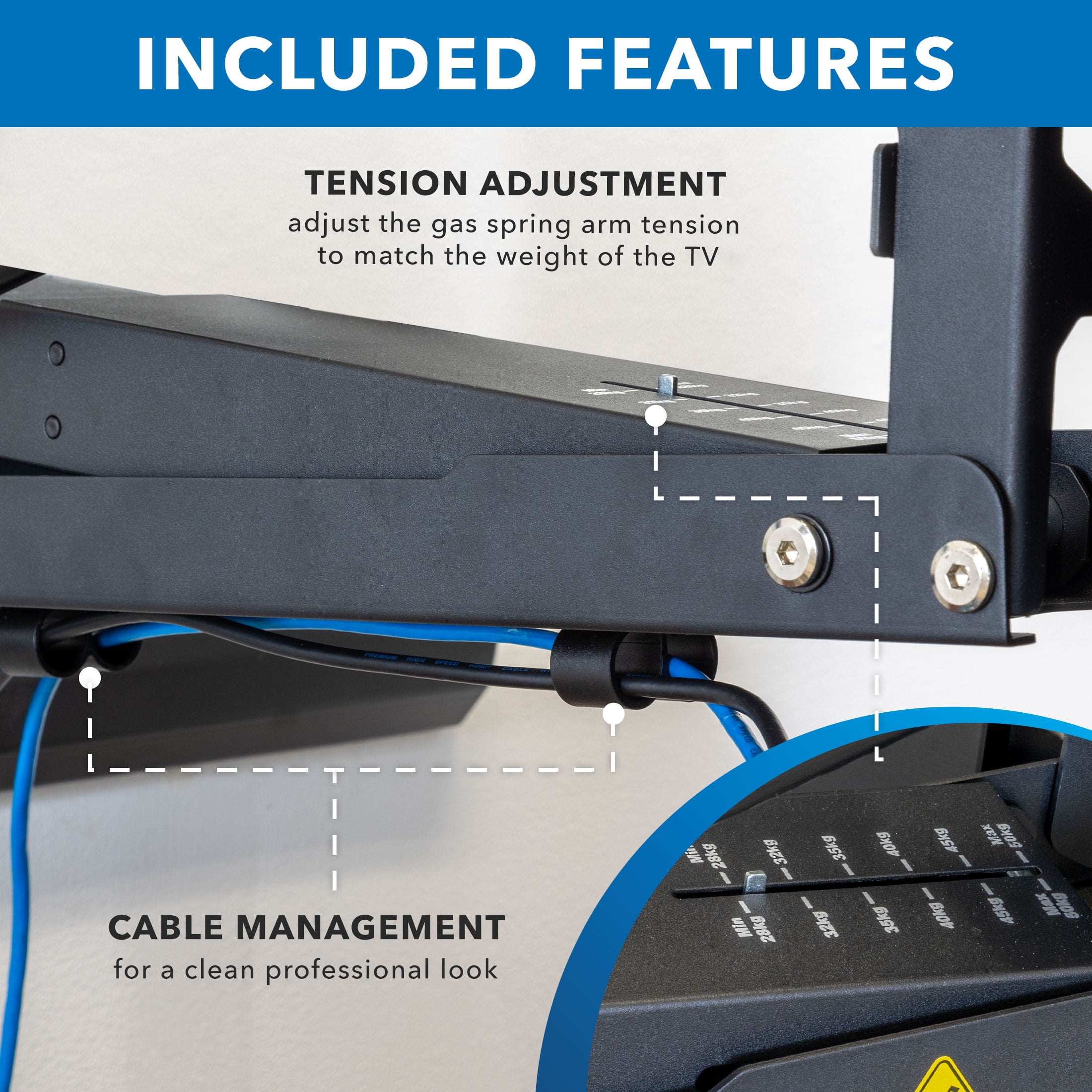 - Easily adjust your TV with fluid, tool-less height adjustment with the counterbalance gas spring arm