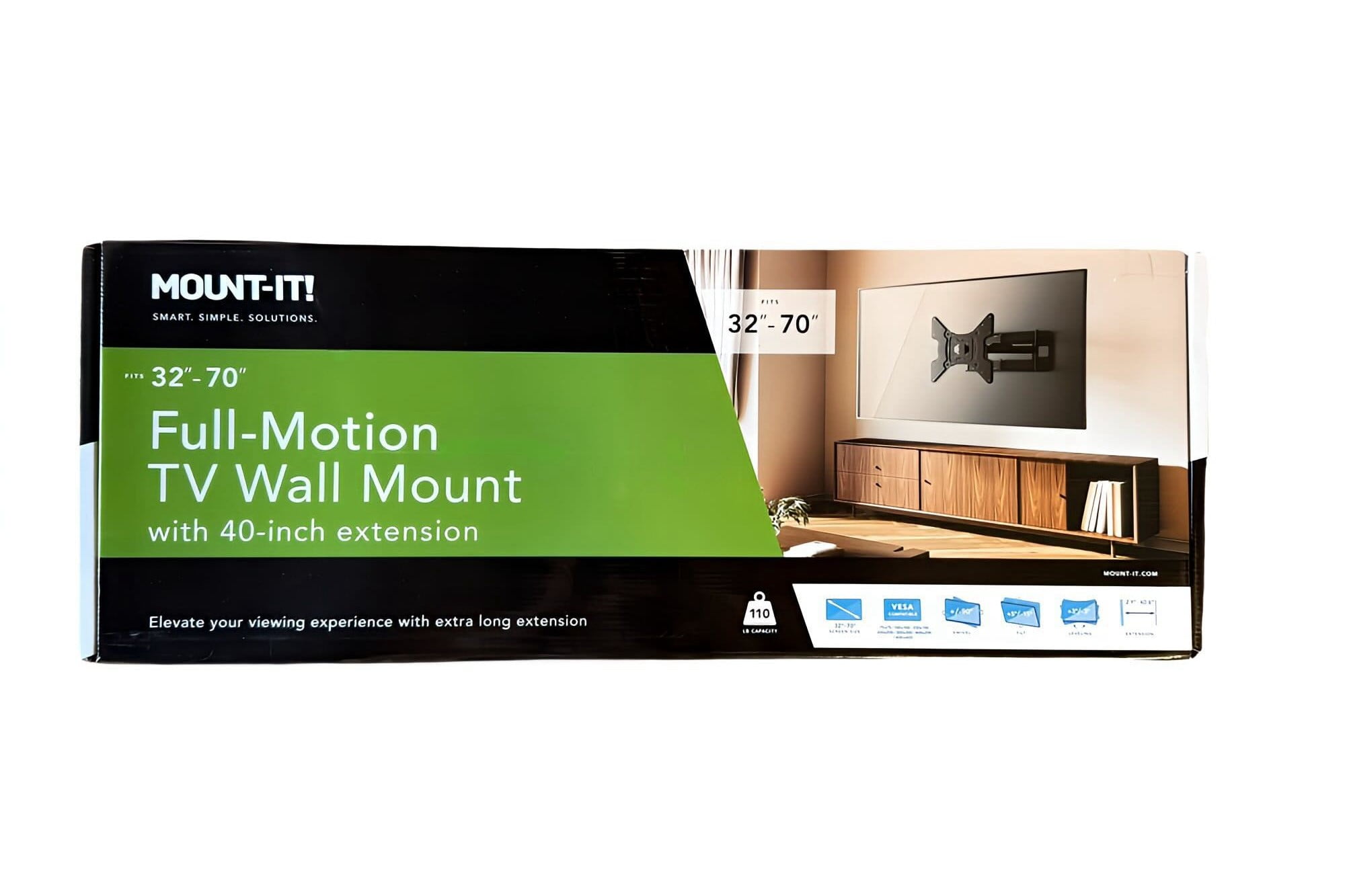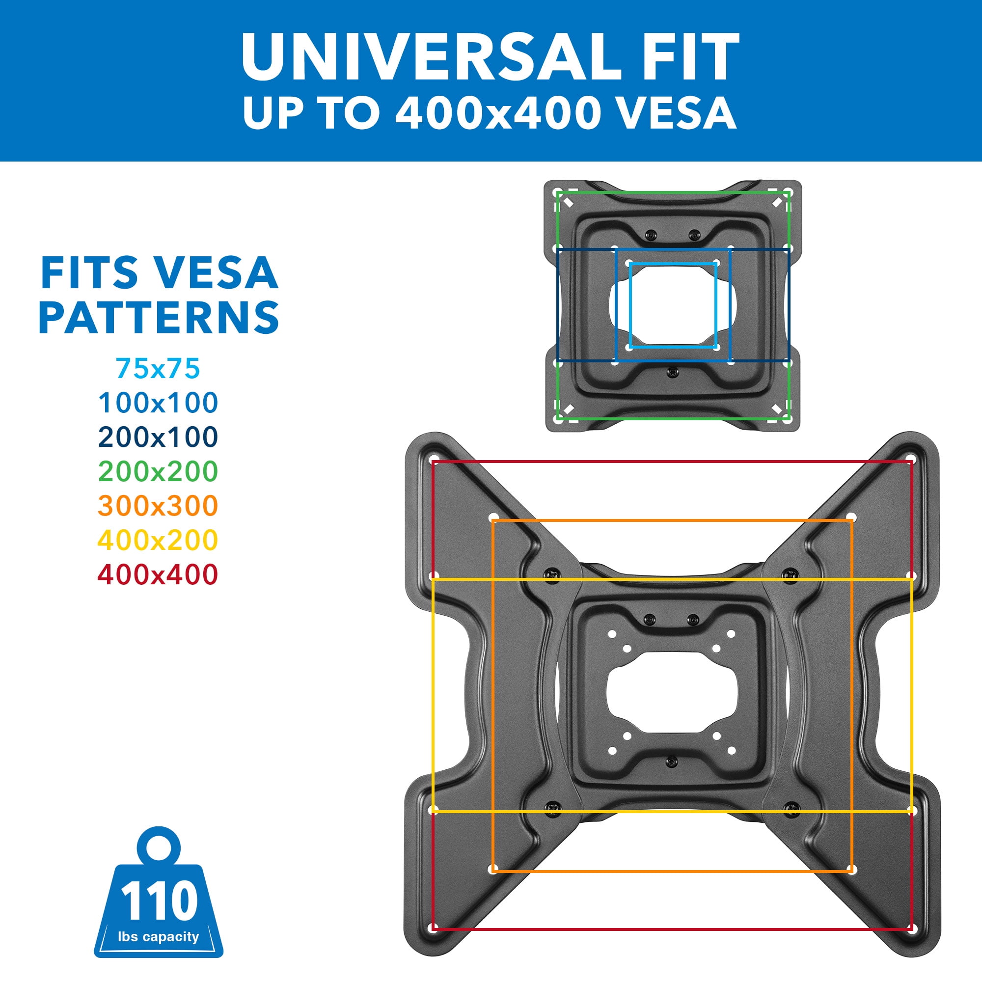 - Designed to fit larger TVs up to 70″ with versatile VESA patterns ranging from 75×75 to 400x400mm, and supporting weights of up to 110 lbs.