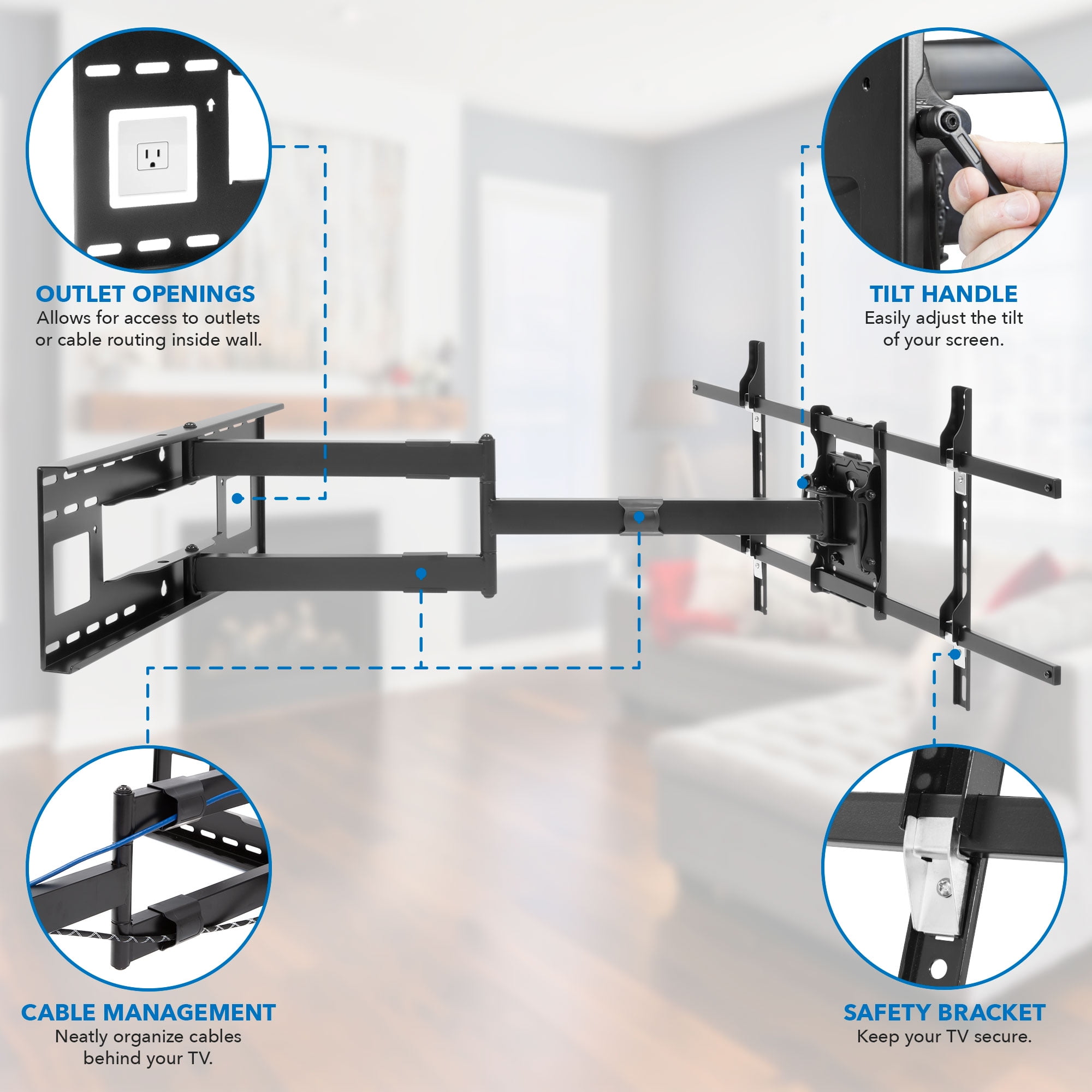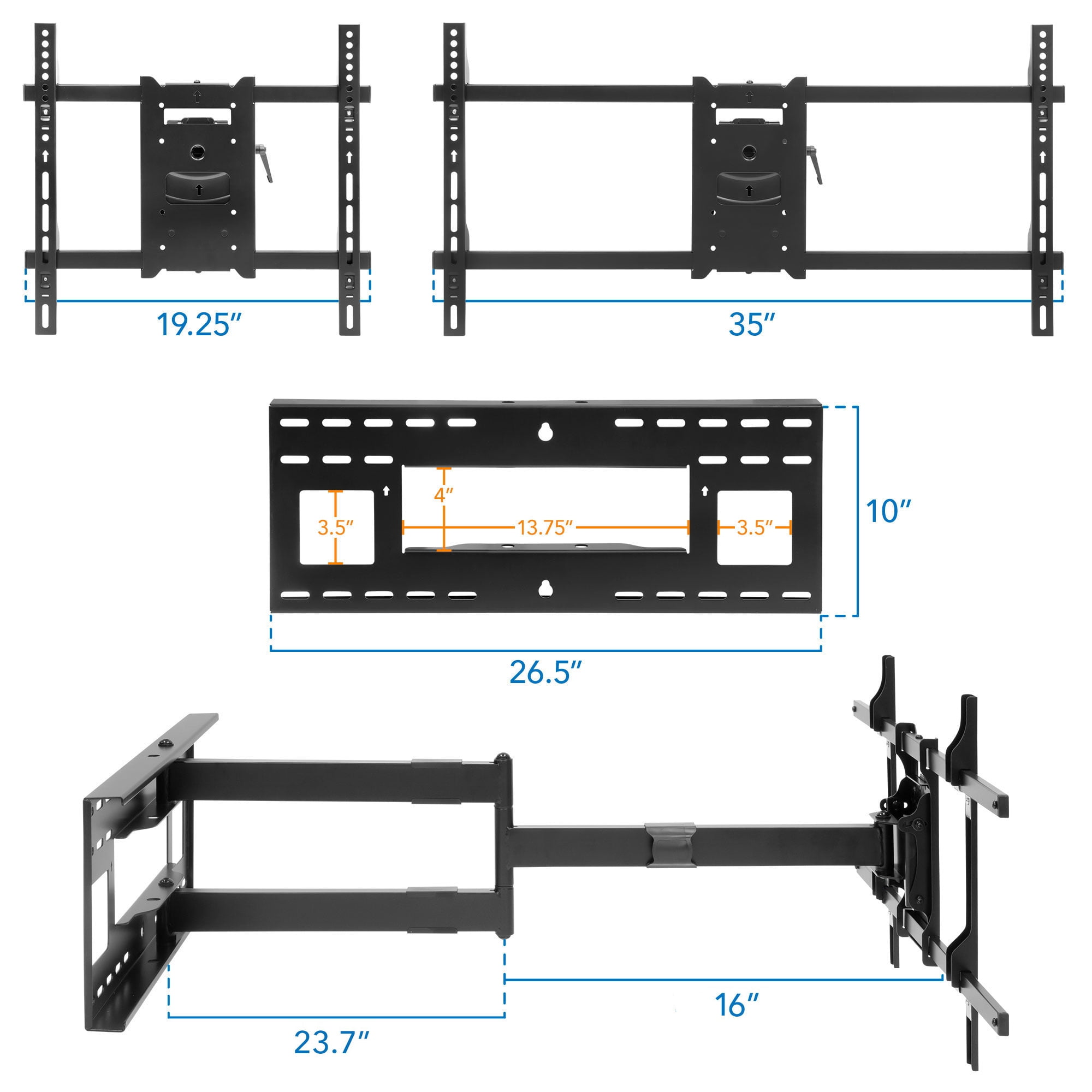 - Full-motion mount can tilt, swivel and extend for perfect positioning