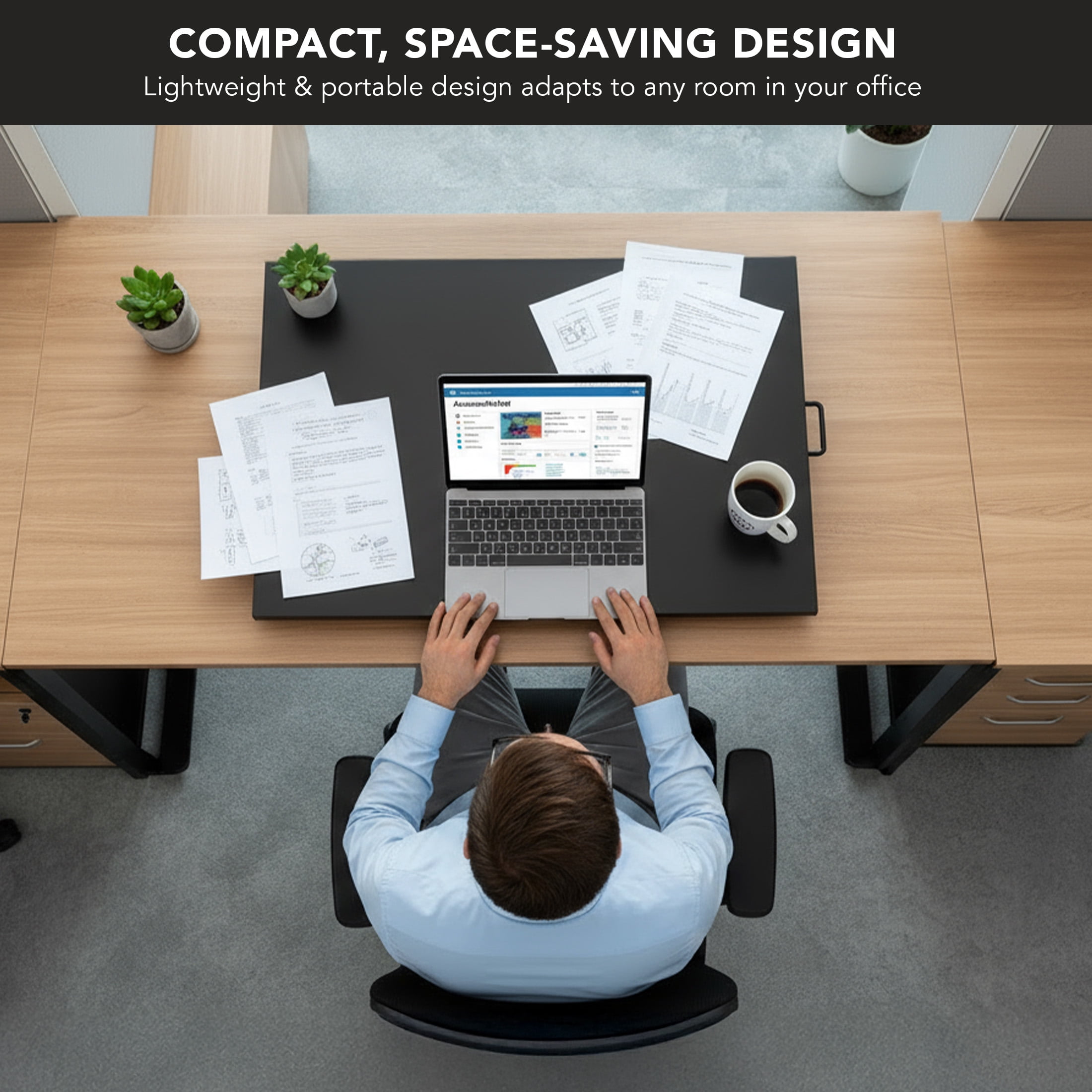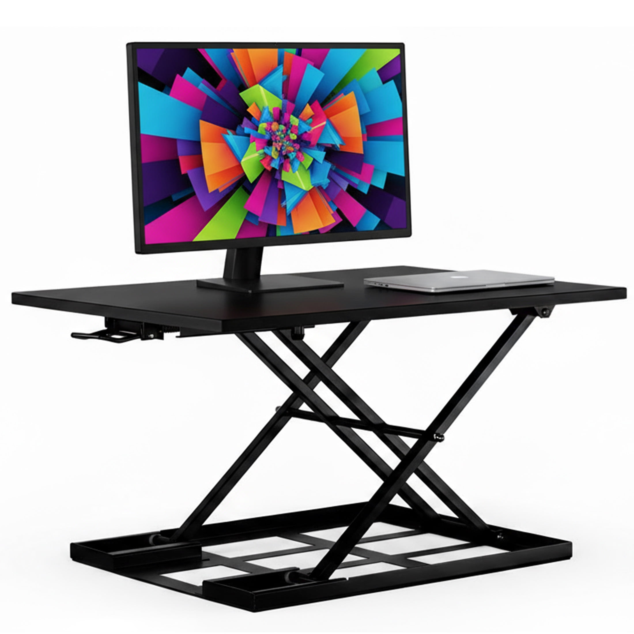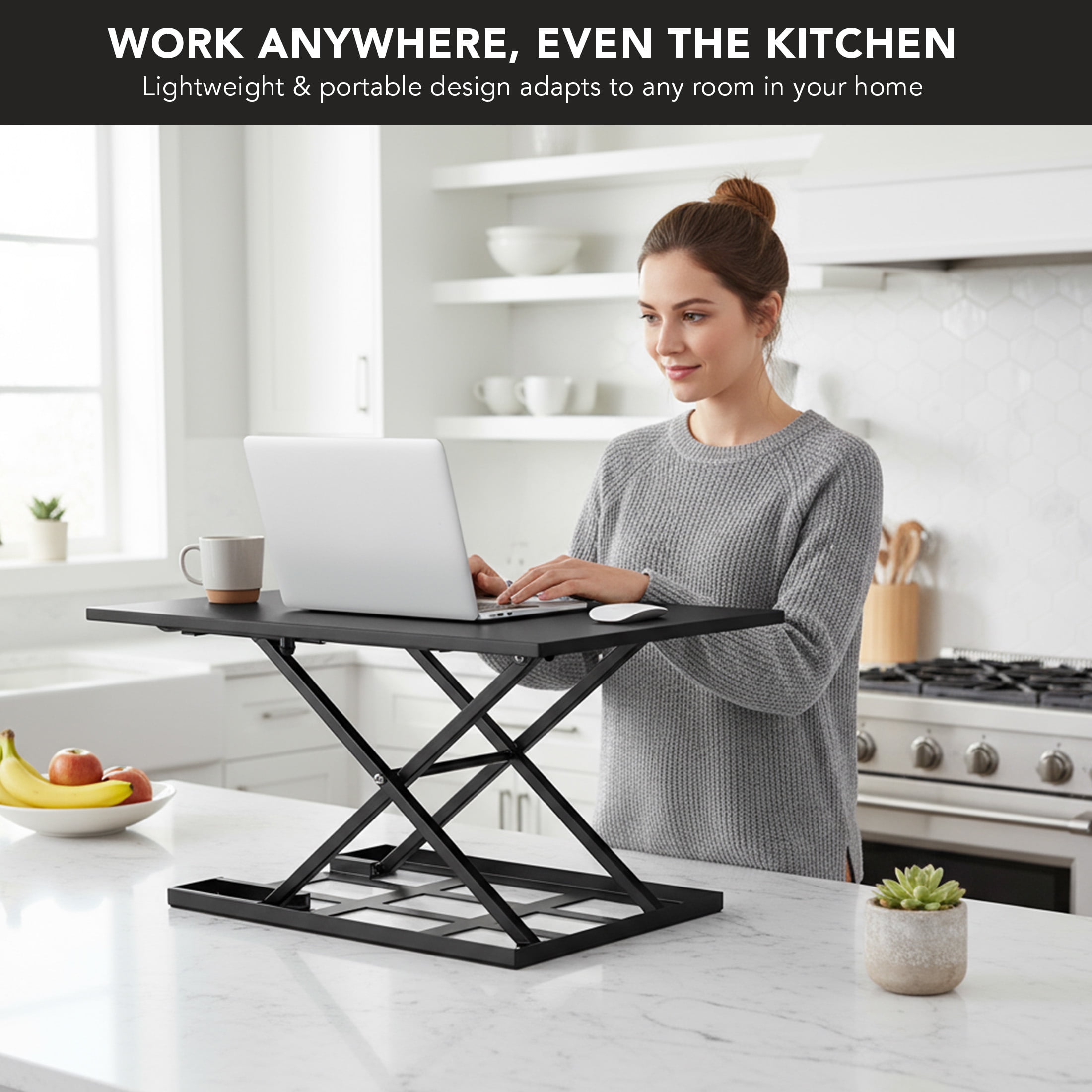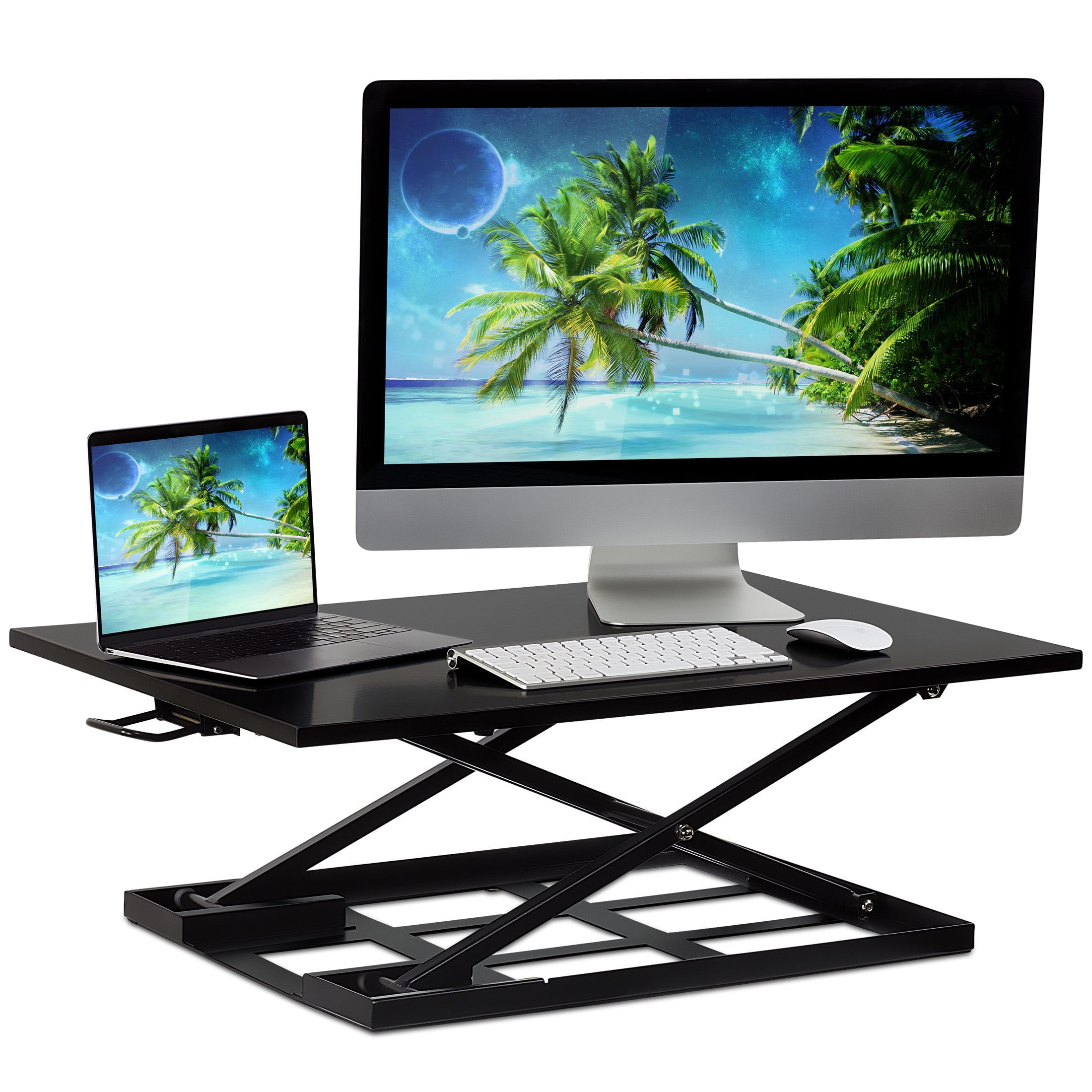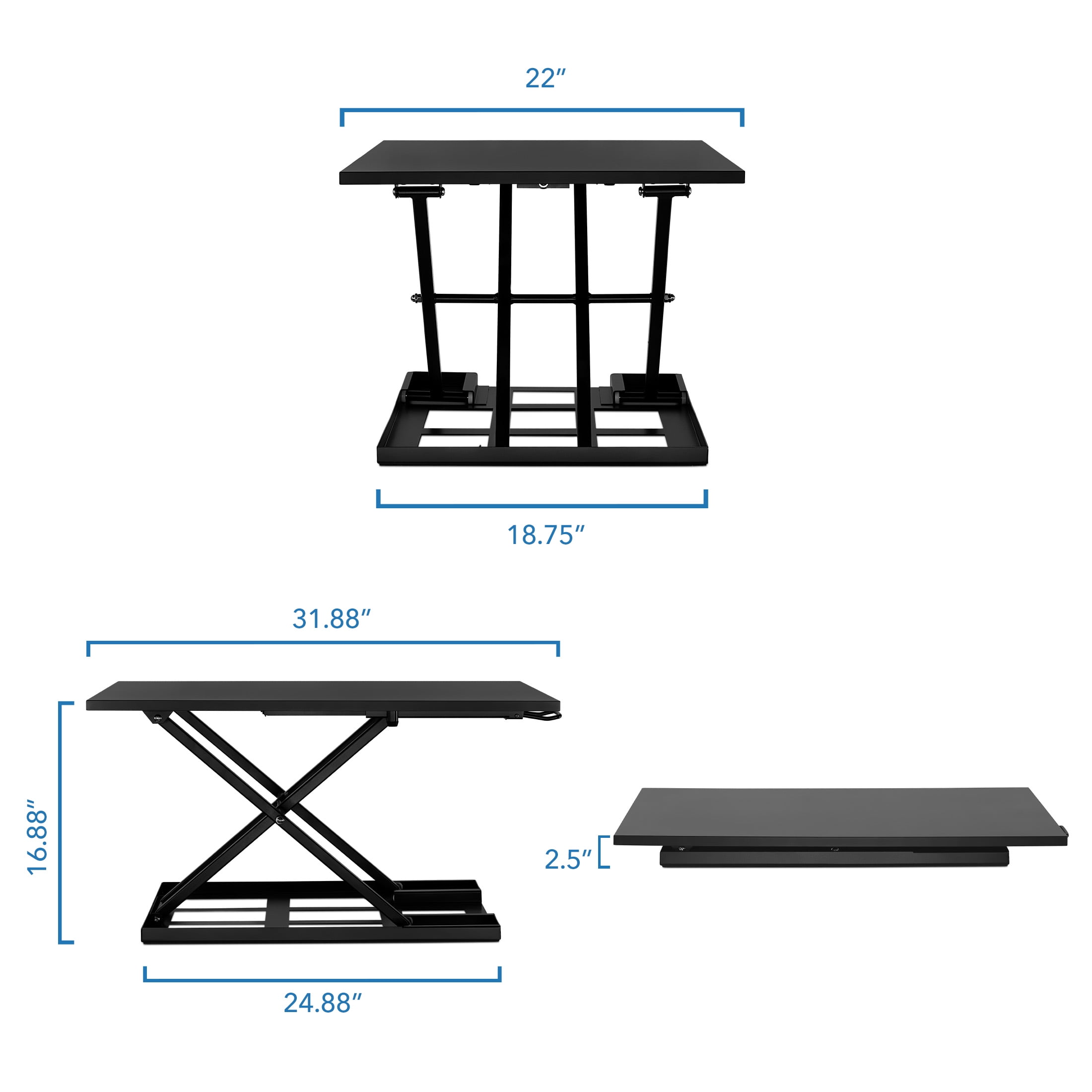 MI-7929 can support 20 pounds and has a spacious tabletop measuring 32″ x 22″ Collapses to as low as 2.5″ and raises up to 16.9″ Transition from sitting to standing quickly with a simple pull of a handle The X-lift base design allows this table top standing desk to raise or lower straight up and down, providing more stability and saving space Affordable way to improve your home or office work ergonomics h5>Specifications Dimensions: 32″ x 22″ Height range: 2.5″ to 16.9″ Lift mechanism: Gas spring arm for lift assistance Weight capacity: 20 lbs. Colors: Black, white, brown
