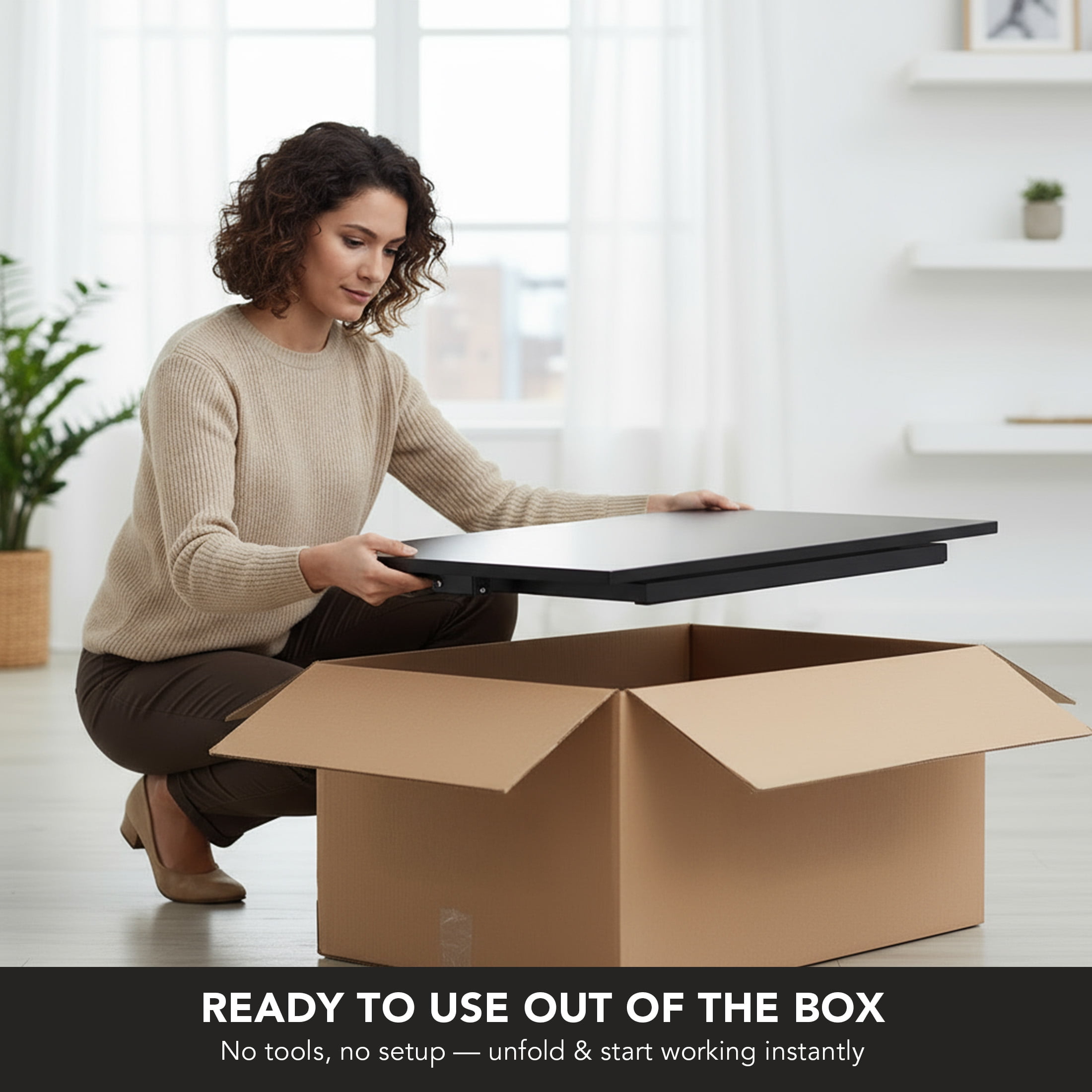 This sit-stand desk converter elevates your computer or laptop to a comfortable height for an improved viewing experience and better posture. The spacious tabletop on this converter supports a monitor and a laptop or tablet. Moving from sitting to standing can be done in a matter of seconds thanks to the spring mechanism built into this design. Simply squeeze the lever on the side of the desk, and the desk will raise and lower in a smooth, fluid motion. Ready to use right out of the box. < MI-7929 Manual Contact Us Click for Product Video