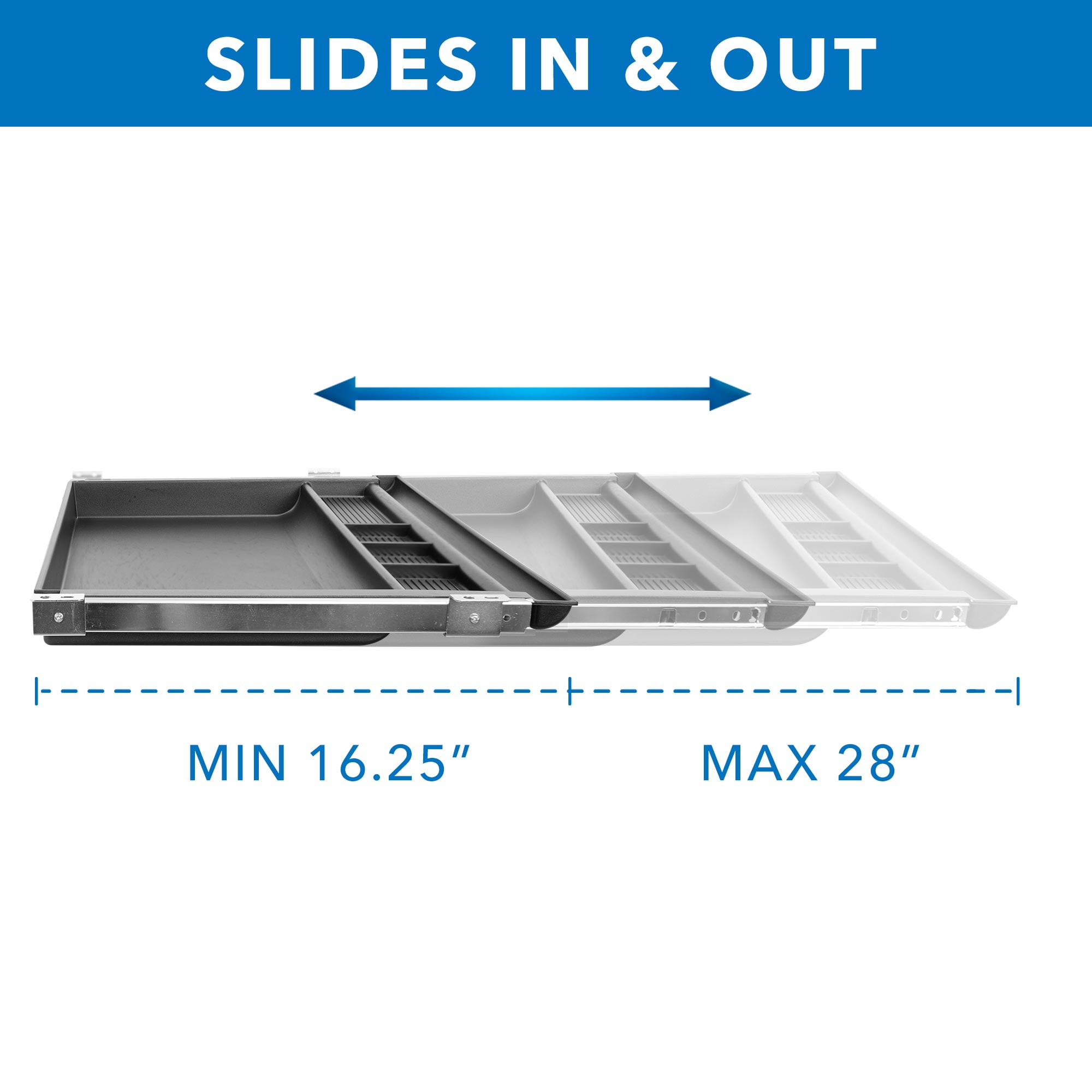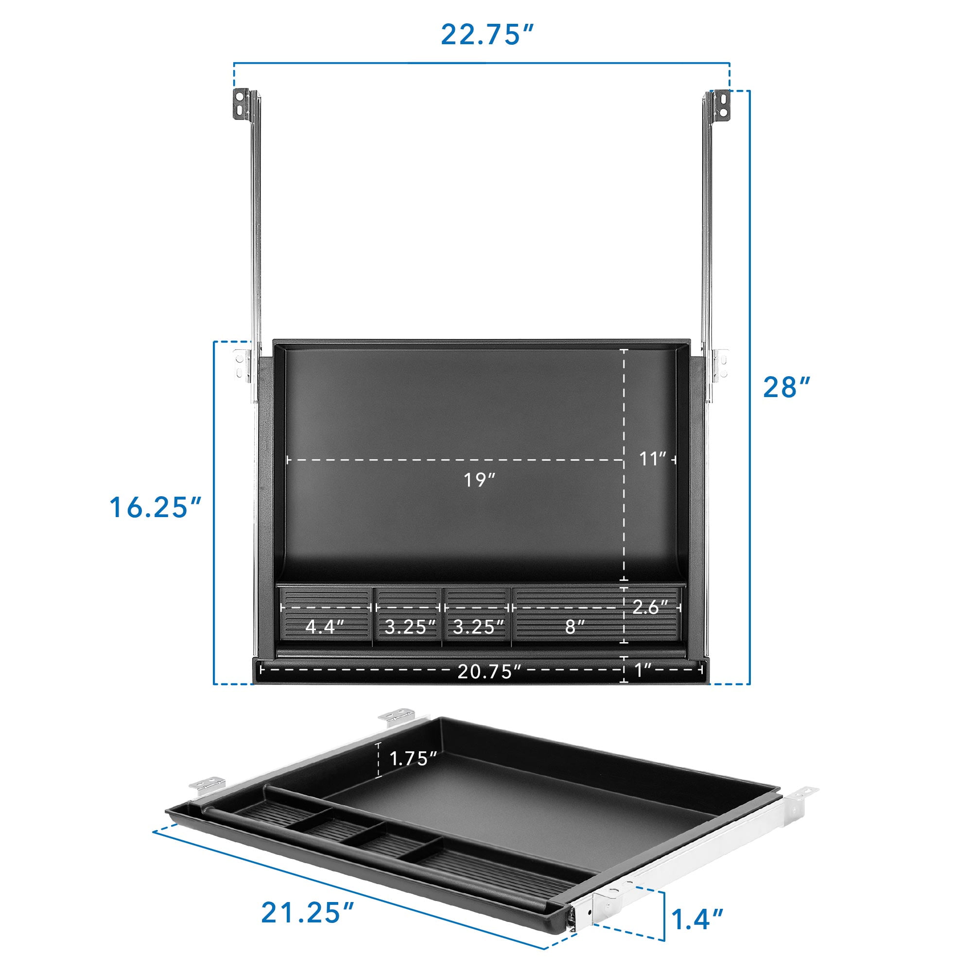 Mounts securely to the underside of your table top, creating an easy way to add tray storage space Attaches to desktops, tables and workbenches over 1″ thick Divided compartments keeps pens and pencils in place Great addition to our line of sit stand desks Drawer Dimension: 21.25″ W x 16.25″ D Maximum Desk Space Requirement: 23″ W x 16.25″ D Drawer Extension: 16.25″ (min) – 28″ (max)