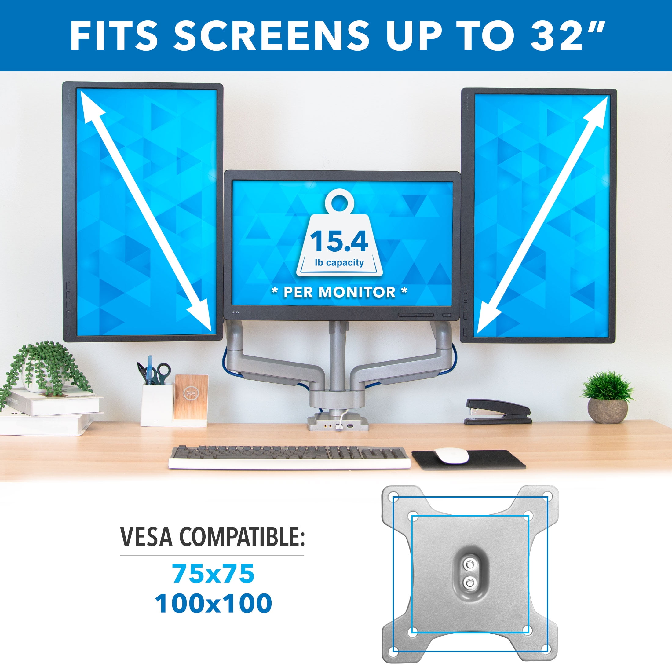 - MI-2753 is compatible with 75mm x 75mm and 100mm x 100mm VESA patterns and can hold a total of 46.2 lbs. (15.4 lbs. per monitor)