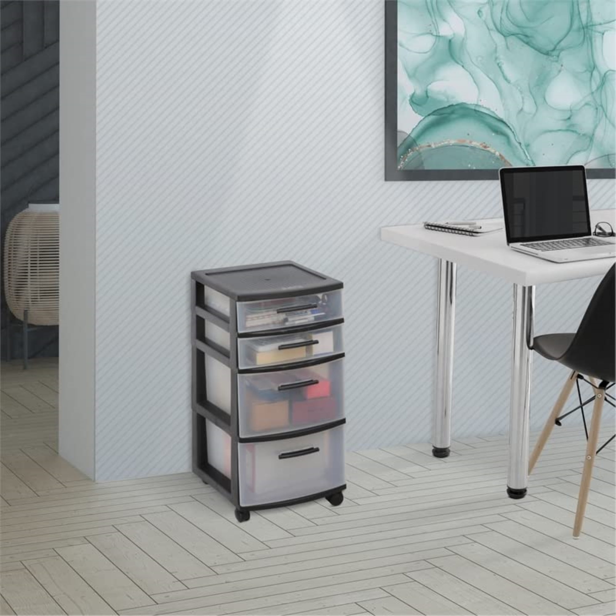 Keep your school, office, and crafting supplies organized with the Eclypse 4-Drawer Rolling Storage Cart Features four (4) drawers that can be removed for easy cleaning Finished in clear Polypropylene Plastic with a black frame Casters provide easy mobility Durable Resin handles Drawer dimensions: Small / 3.3″ H x 10.4″ W x 13.7″ D; Large / 7″ H x 10.4″ W x 13.7″ D Drawer weight capacity: Small / 4.5 lbs; Large / 10 lbs Product dimensions: 25.5″ H x 12.5″ W x 14.5″ D Product weight: 6.2 lbs Assembly required
