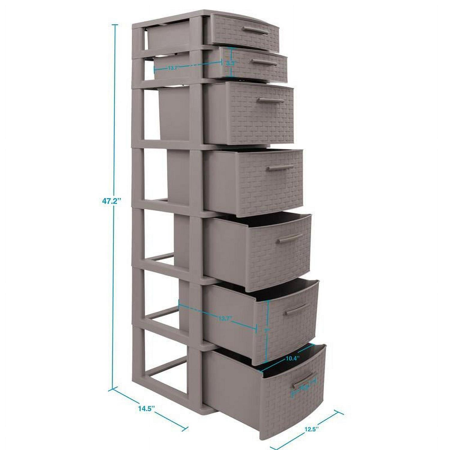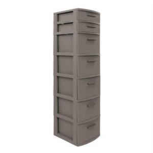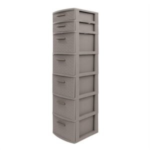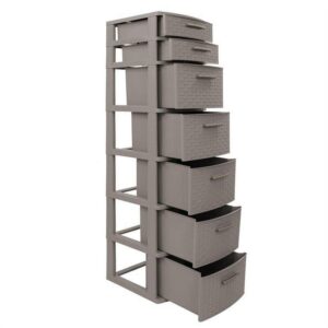 The Eclypse Collection by MQ 7-Drawer Storage Unit is finished in a rich Taupe color with an attractive Rattan look finish, manufactured in a propylene (PE) resin material. This storage cabinet includes 2 small drawers and 5 large drawers. Each is adorned with brush steel simulated resin handles. This cabinet is sturdy and the drawers can be completely removed for easy cleaning. Assembly is required.