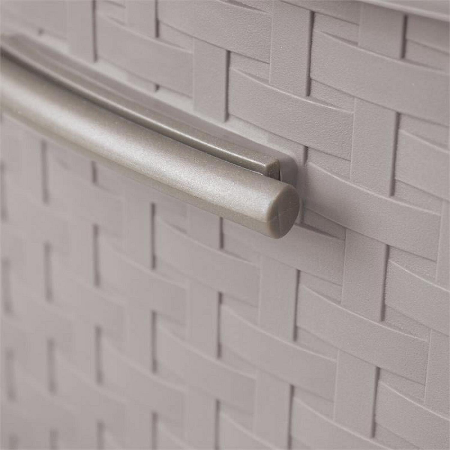 - Taupe finish with modern rattan-look doors